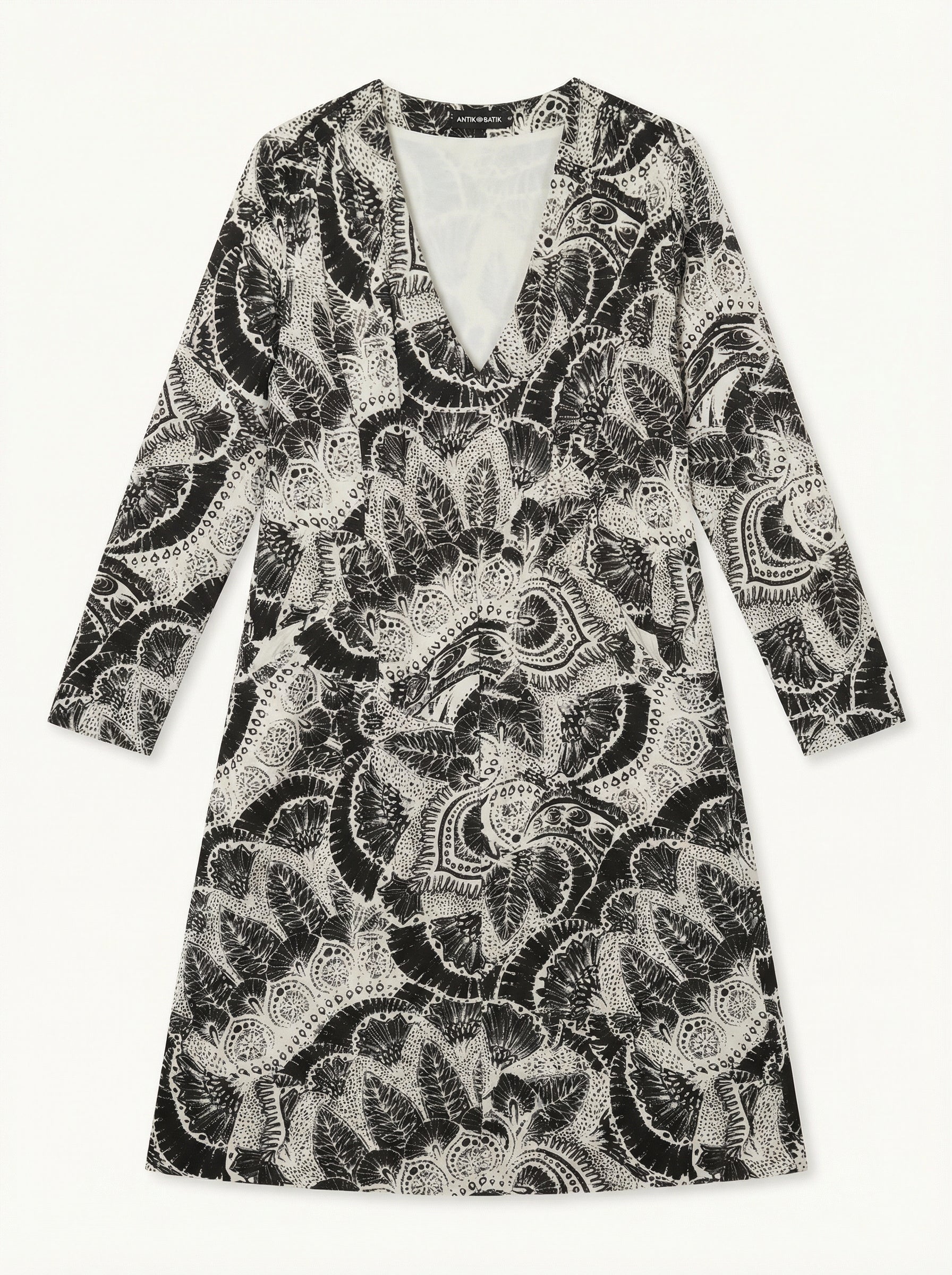 Elegant and comfortable, this lightweight, flowing jersey dress will be your stylish companion for everyday wear. Its black and white paisley print adds a timeless, bohemian-chic touch. The flattering cut and V-neckline elongate your silhouette, while the long sleeves give you the perfect curve. Perfect for a casual day or an evening with friends.
