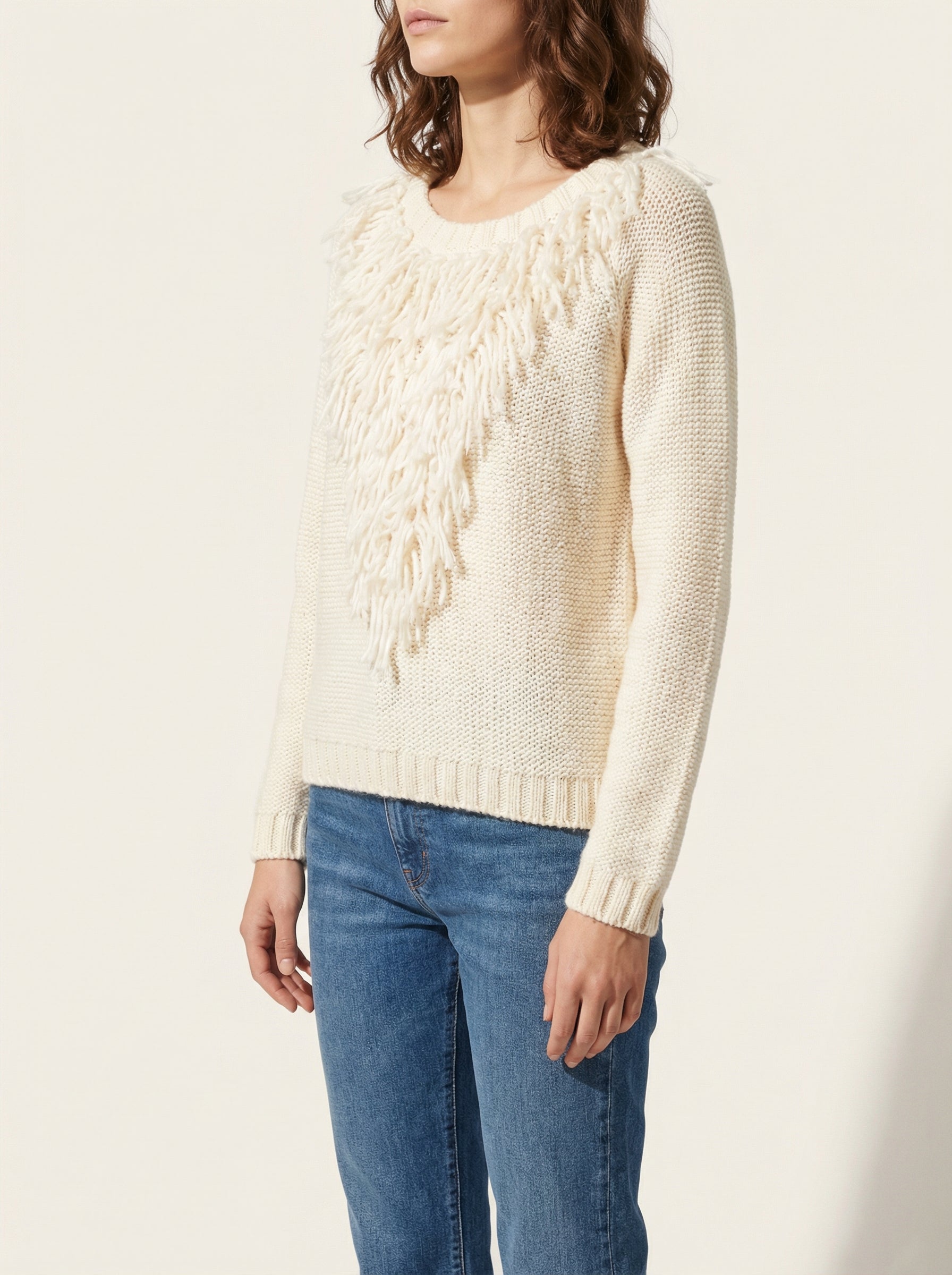 Let yourself be enveloped in the softness of this ecru knit sweater. Its original design, adorned with delicate fringes, will bring a bohemian chic touch to your wardrobe. Made from a soft and comfortable material, it's perfect for your moments of relaxation or to enhance a casual outfit with a refined touch.