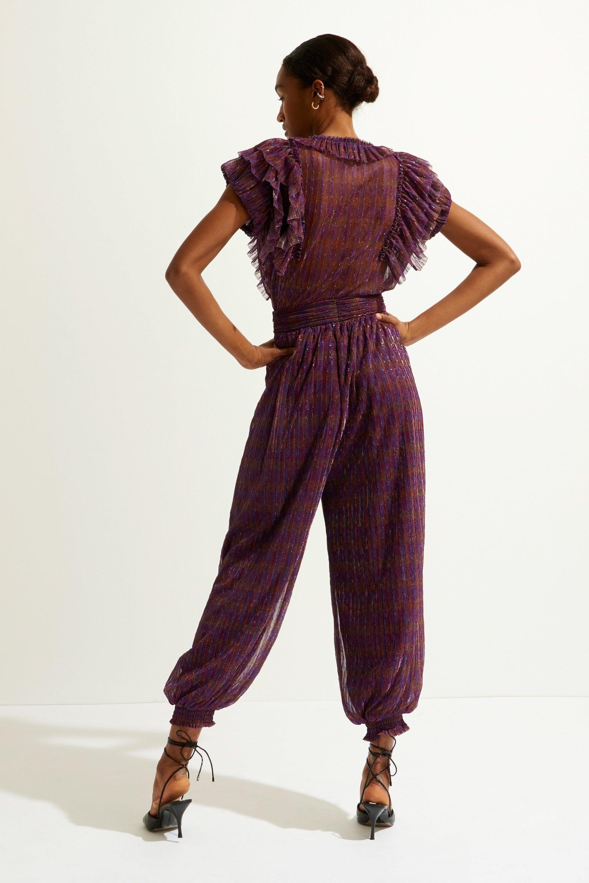 Silver and plum-colored lurex Harem pants. High-waisted cut, held up by an elastic band around the waist. Elasticated ankles. Silver lurex stripes give this piece a subtle shiny effect – perfect for an evening outfit. Fully lined. 55% polyester 45% lurex