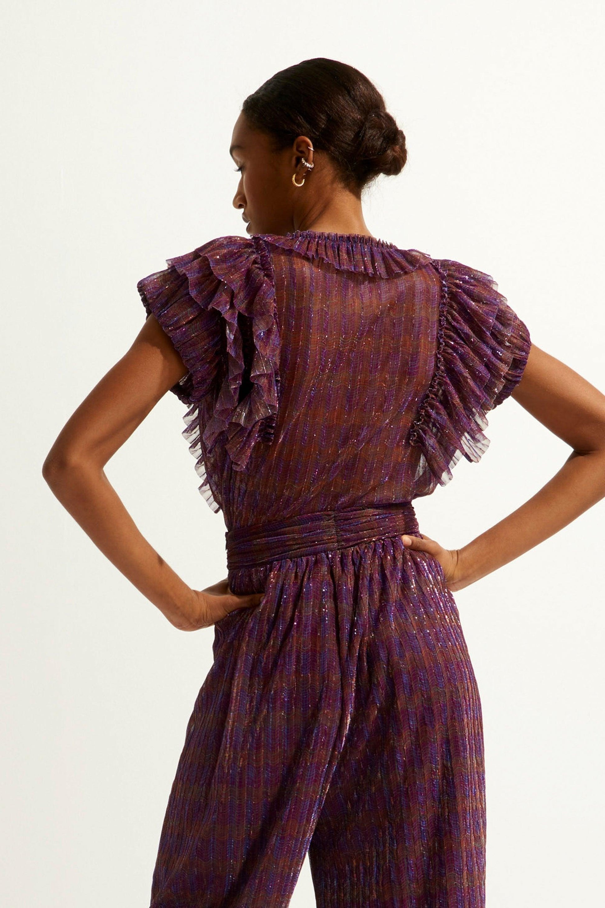 Sheer silver and plum-colored lurex top. Straight cut. V-neck. Neckline and sleeves decorated with ruffles. Silver lurex stripes give this piece a subtle shiny effect – perfect for an evening outfit. 55% polyester 45% lurex