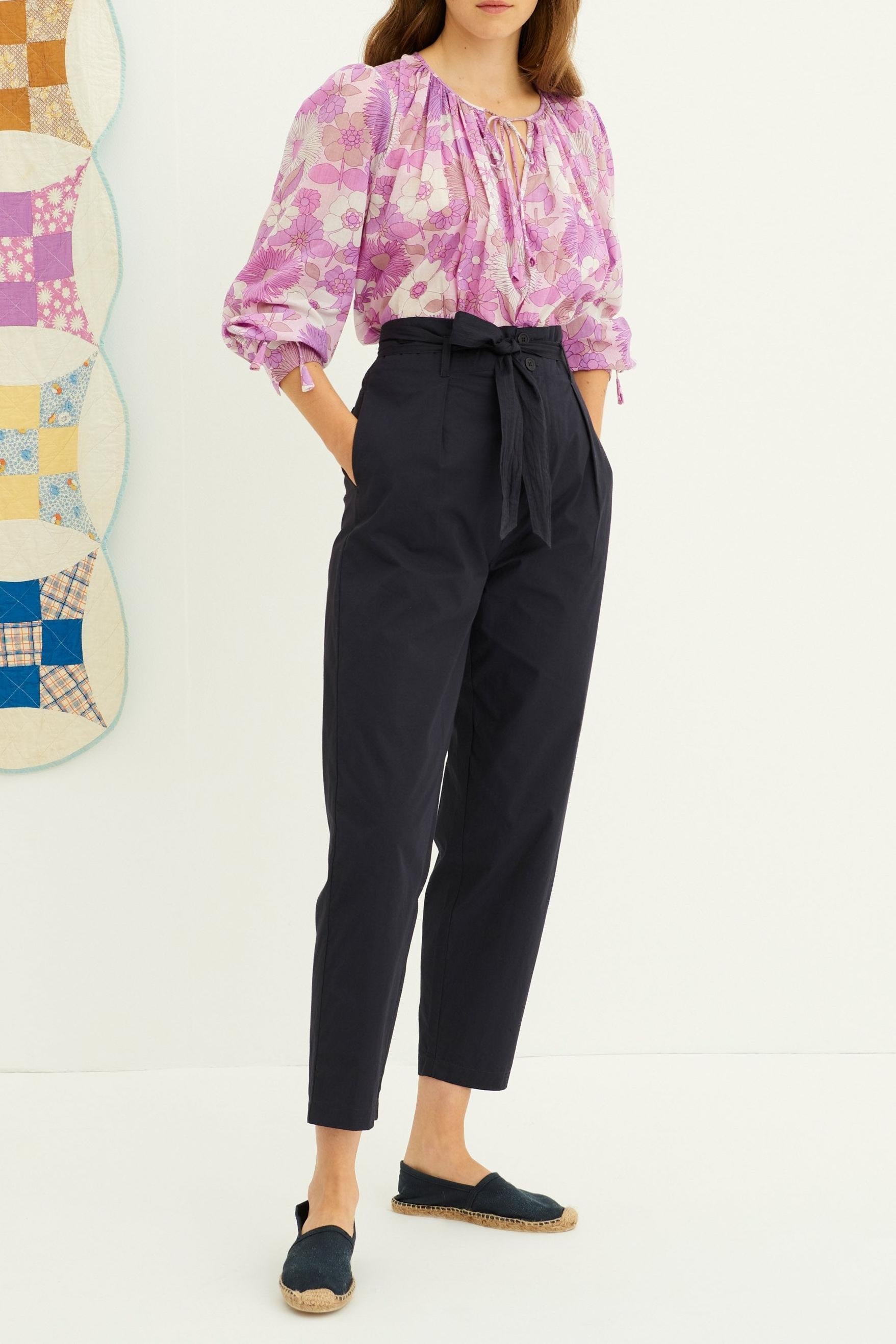 Navy blue cotton poplin high-waist pants. Carrot cut. Piped pockets at the front. Button closure. Our Kala pants come with their own tone-on-tone belt. Wear this staple with your bold pieces. 100% cotton poplin