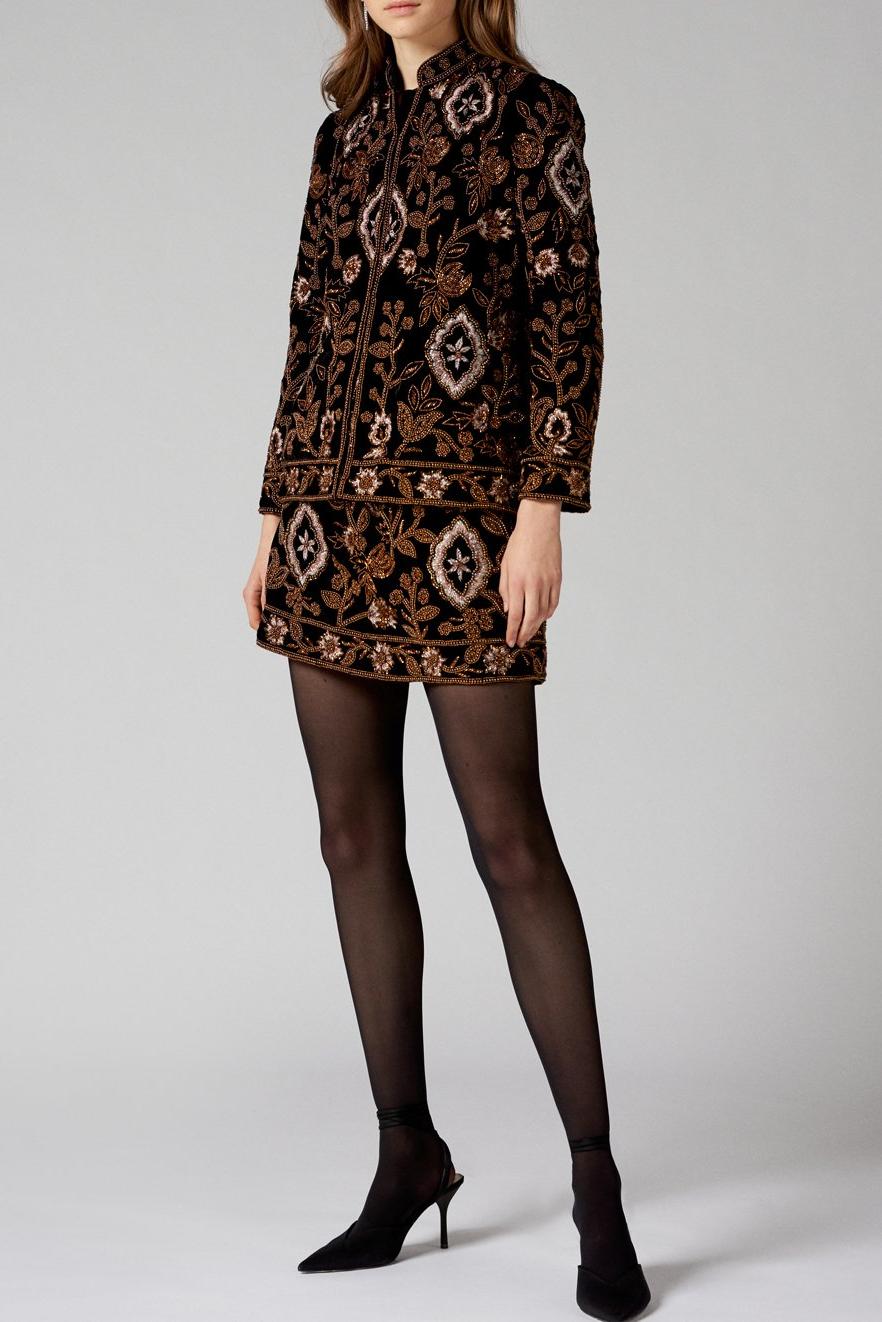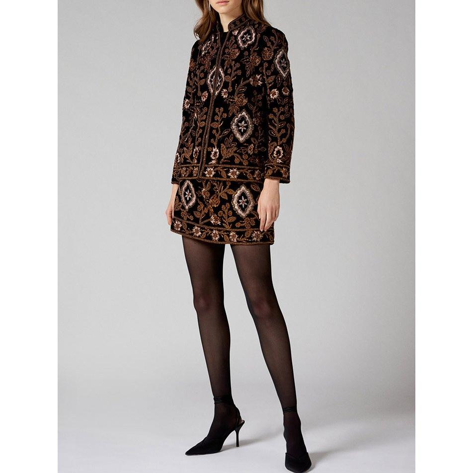 Short jacket in black velvet. All-over cotton-thread and golden-bead embroidery. High collar. Hook-and-loop closure. Long straight sleeves This jacket will pair perfectly with black trousers for a perfect evening outfit.