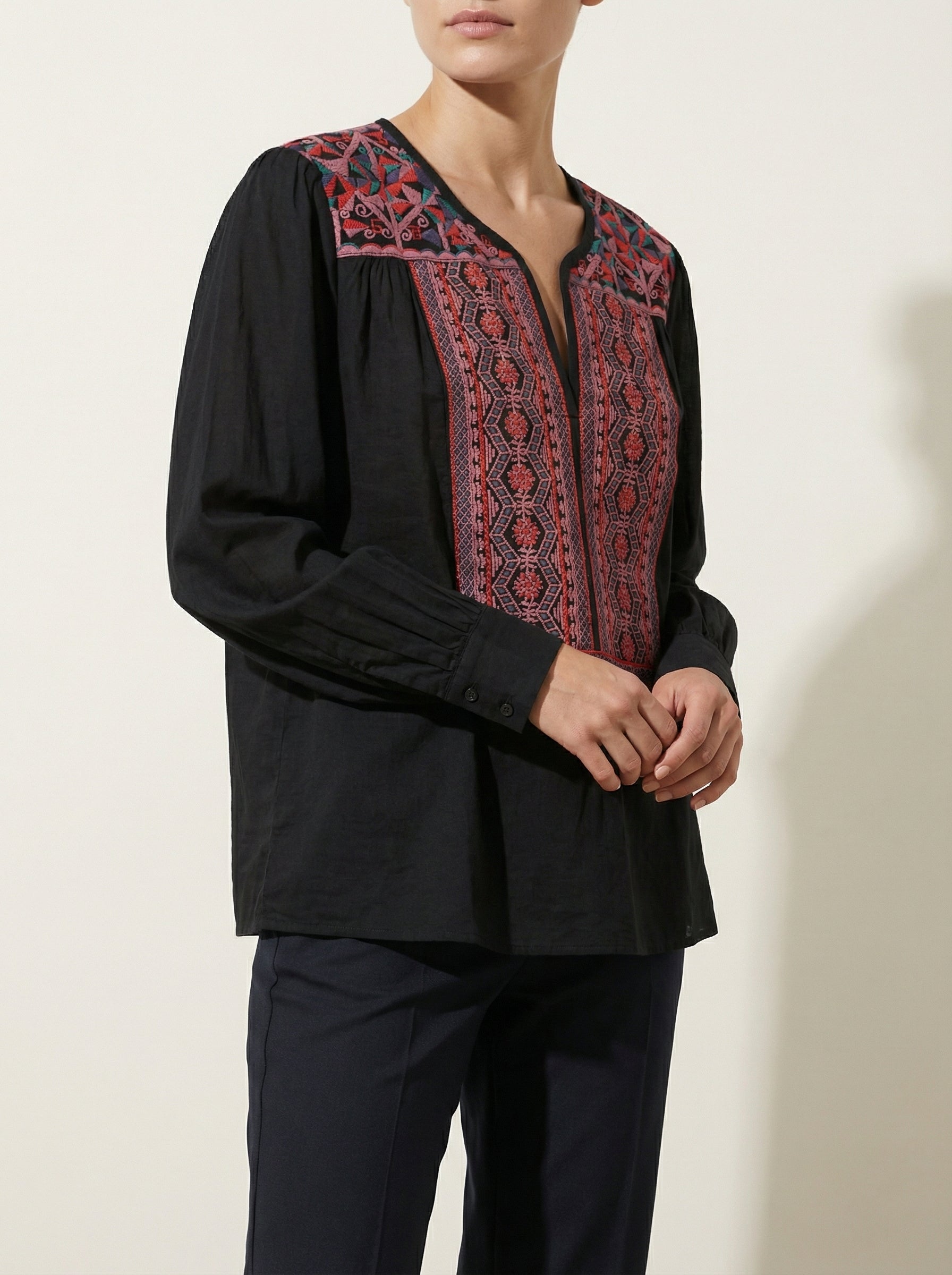 Blouse fluide noire à manches longues aux motifs floraux en rouge et rose contrastant. Coupe ample avec poignets structurés, pour un style affirmé et travaillé.