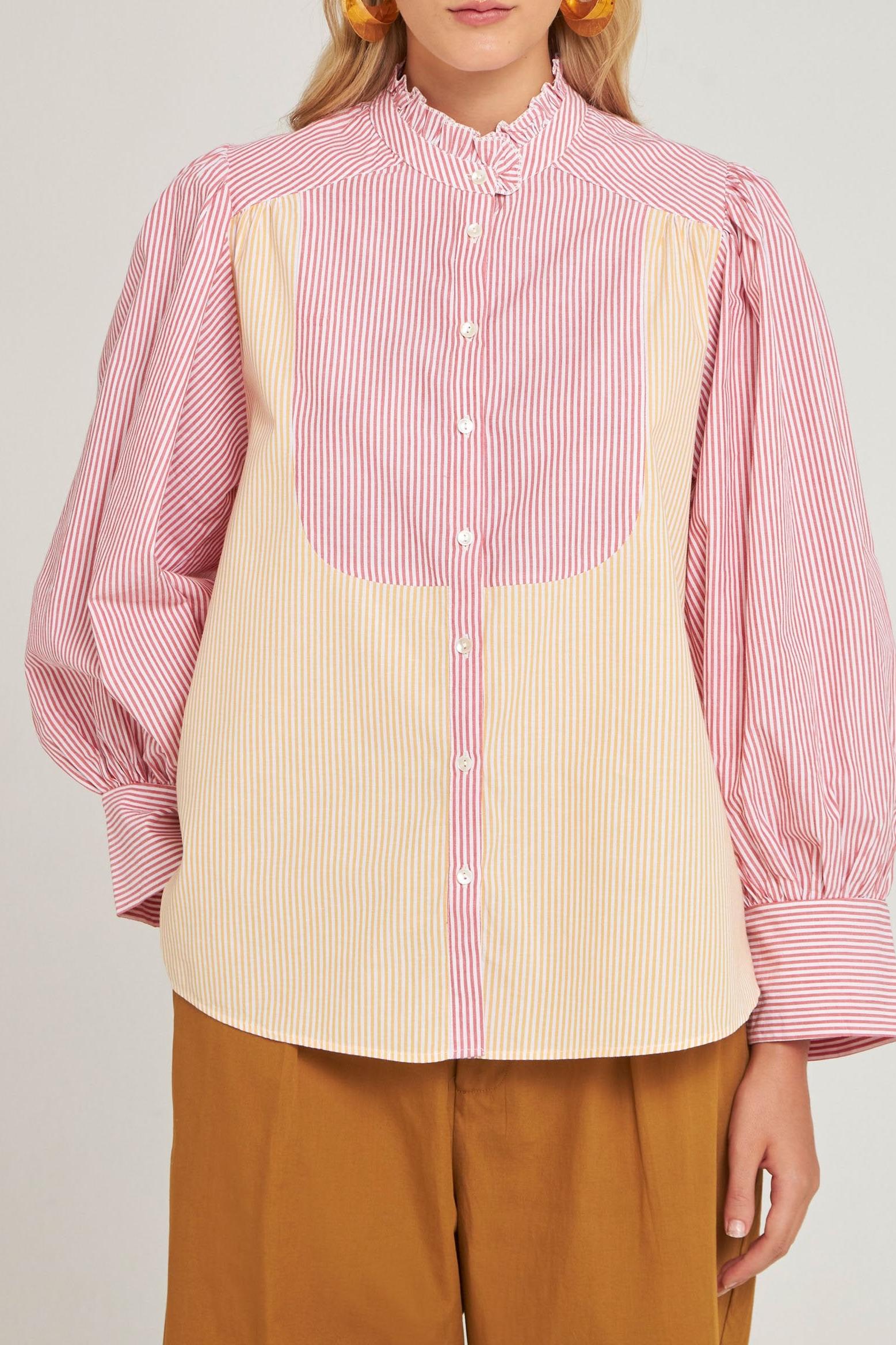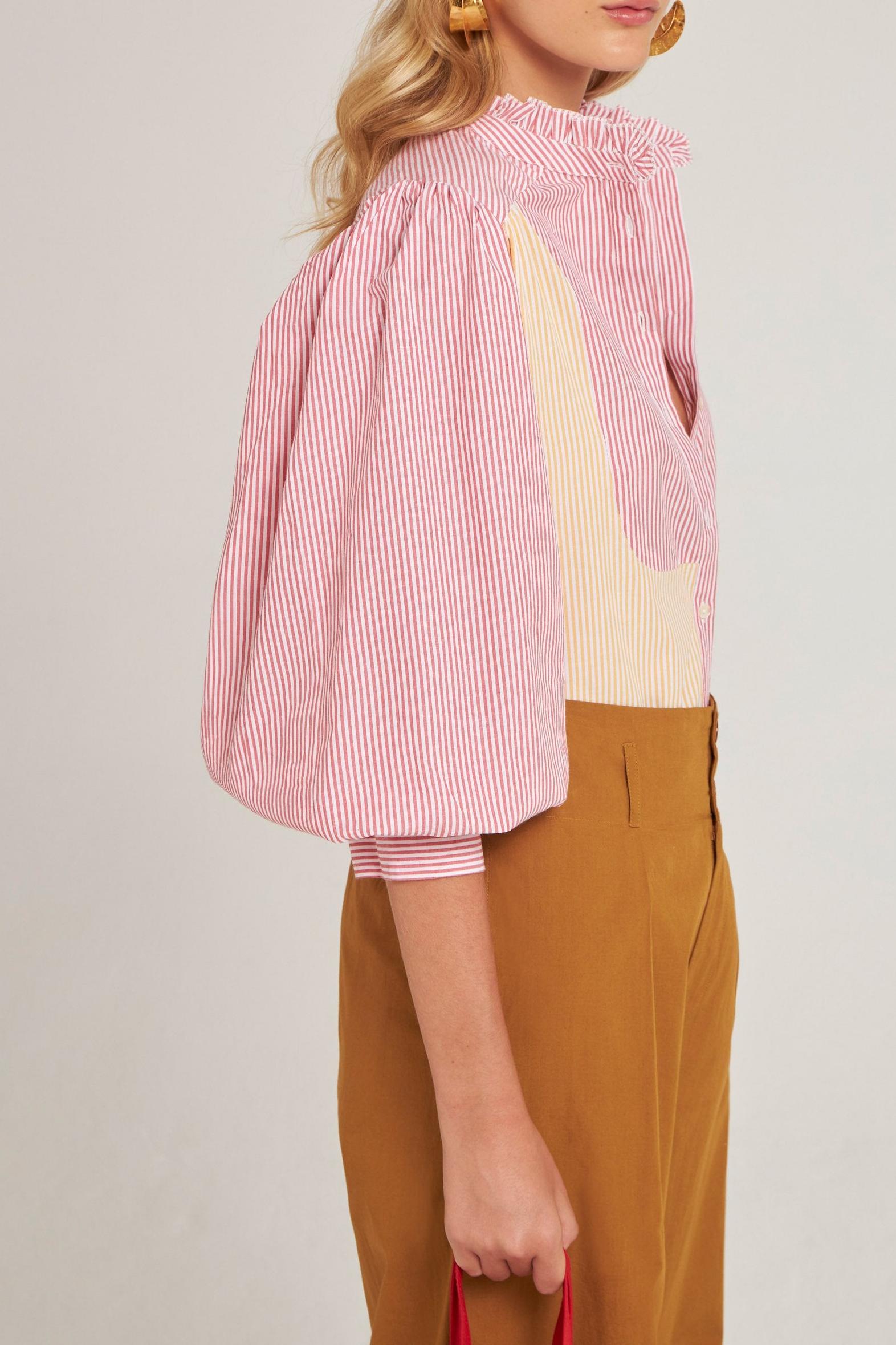 Loose cotton poplin blouse with striped contrast fabric. Balloon sleeves. Ruffled collar finished with bourdon stitching. Natural mother-of-pearl buttons.