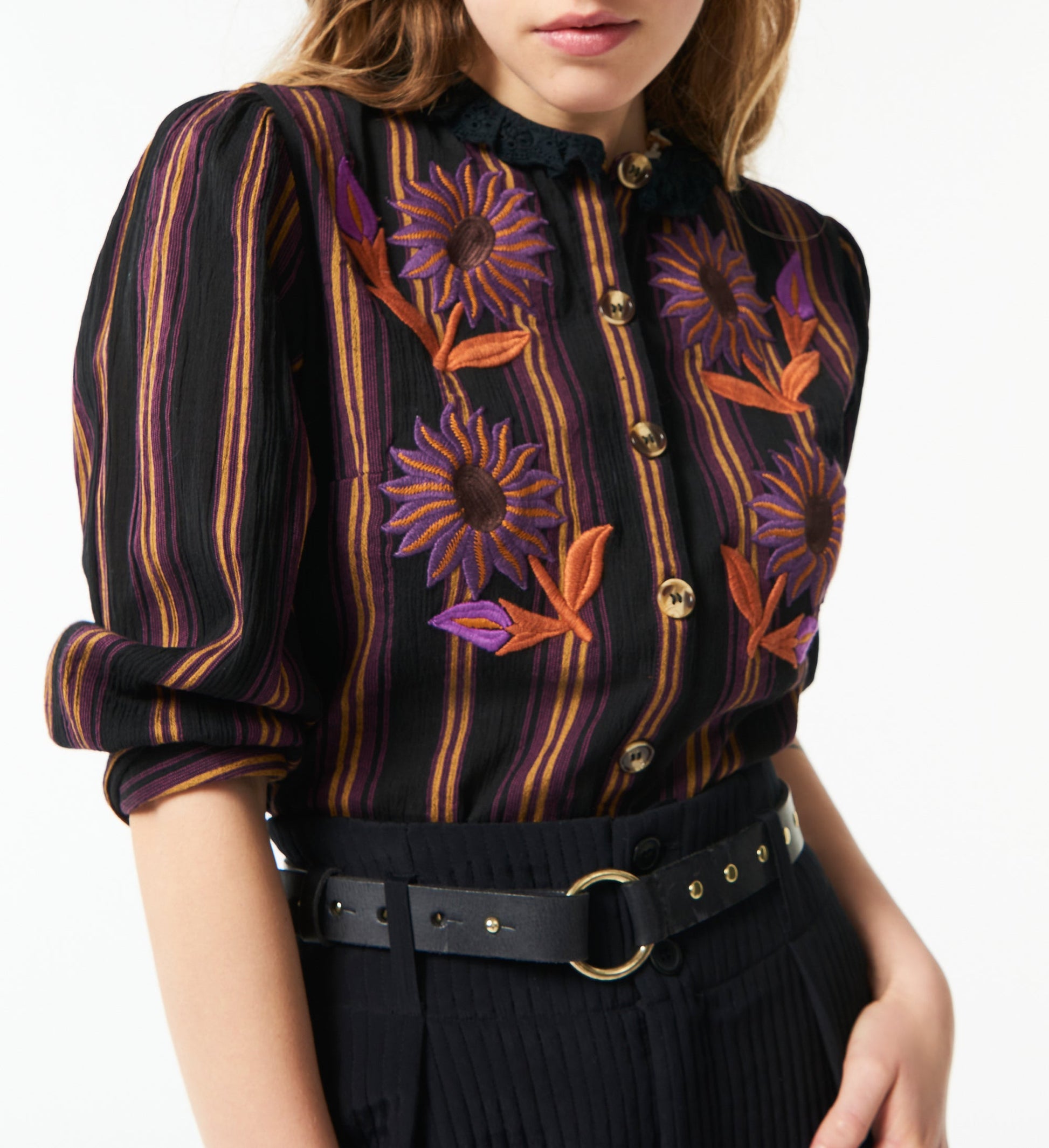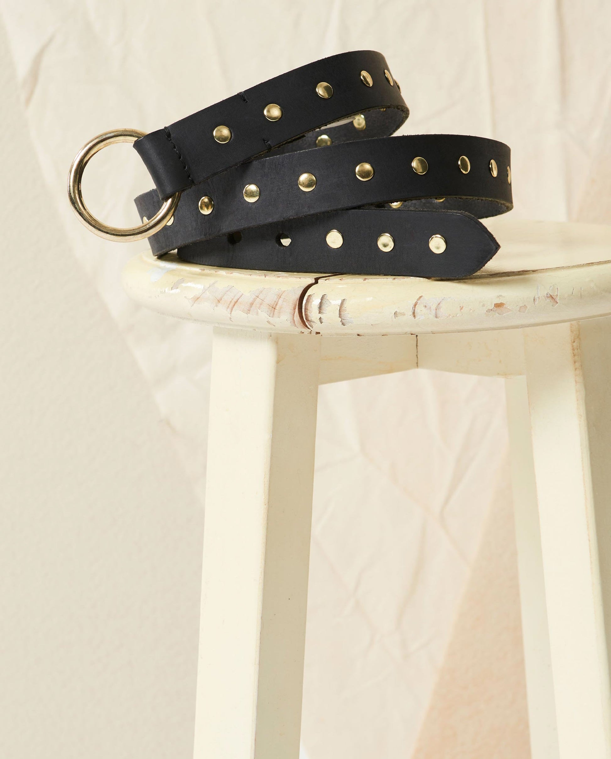 Studded leather belt. Buckle with a passing ring. Brass stud details.