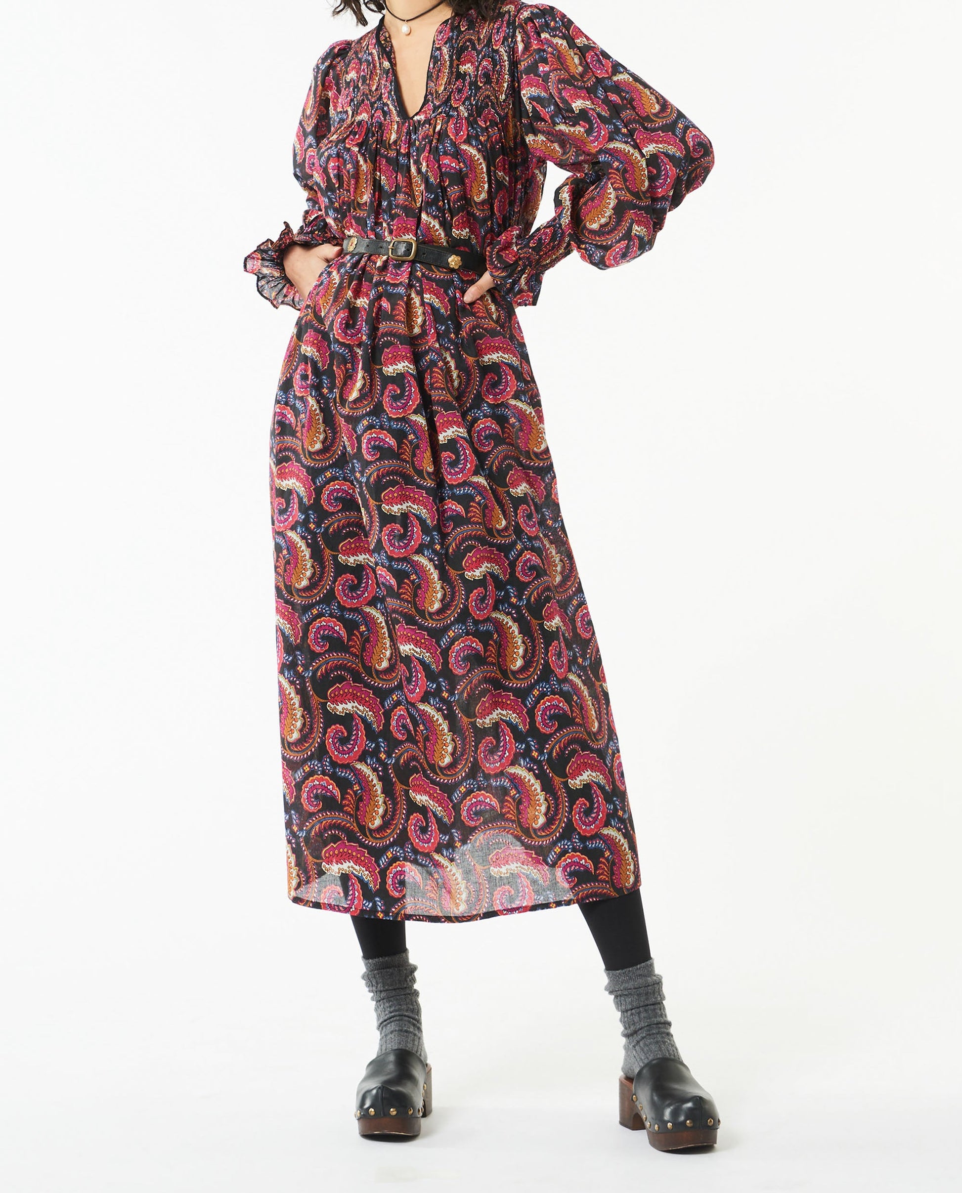 Long printed dress with cashmere pattern in cotton voile. Rounded V-neck. Smocked details on the cuffs, chest and back. Finishing collar and neckline embroidered bias. The dress comes with a slip. 100% Cotton