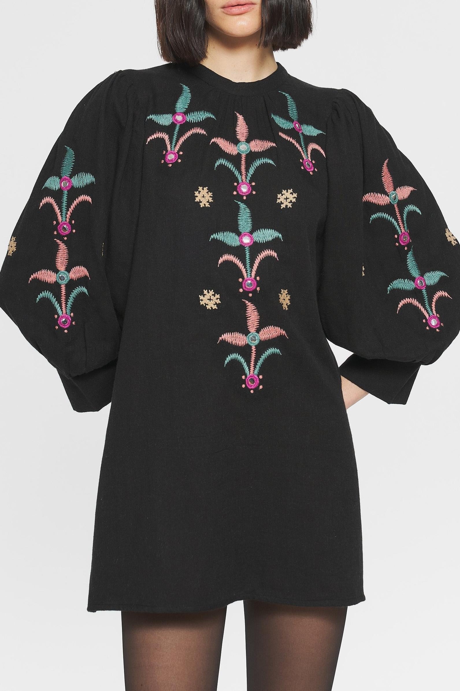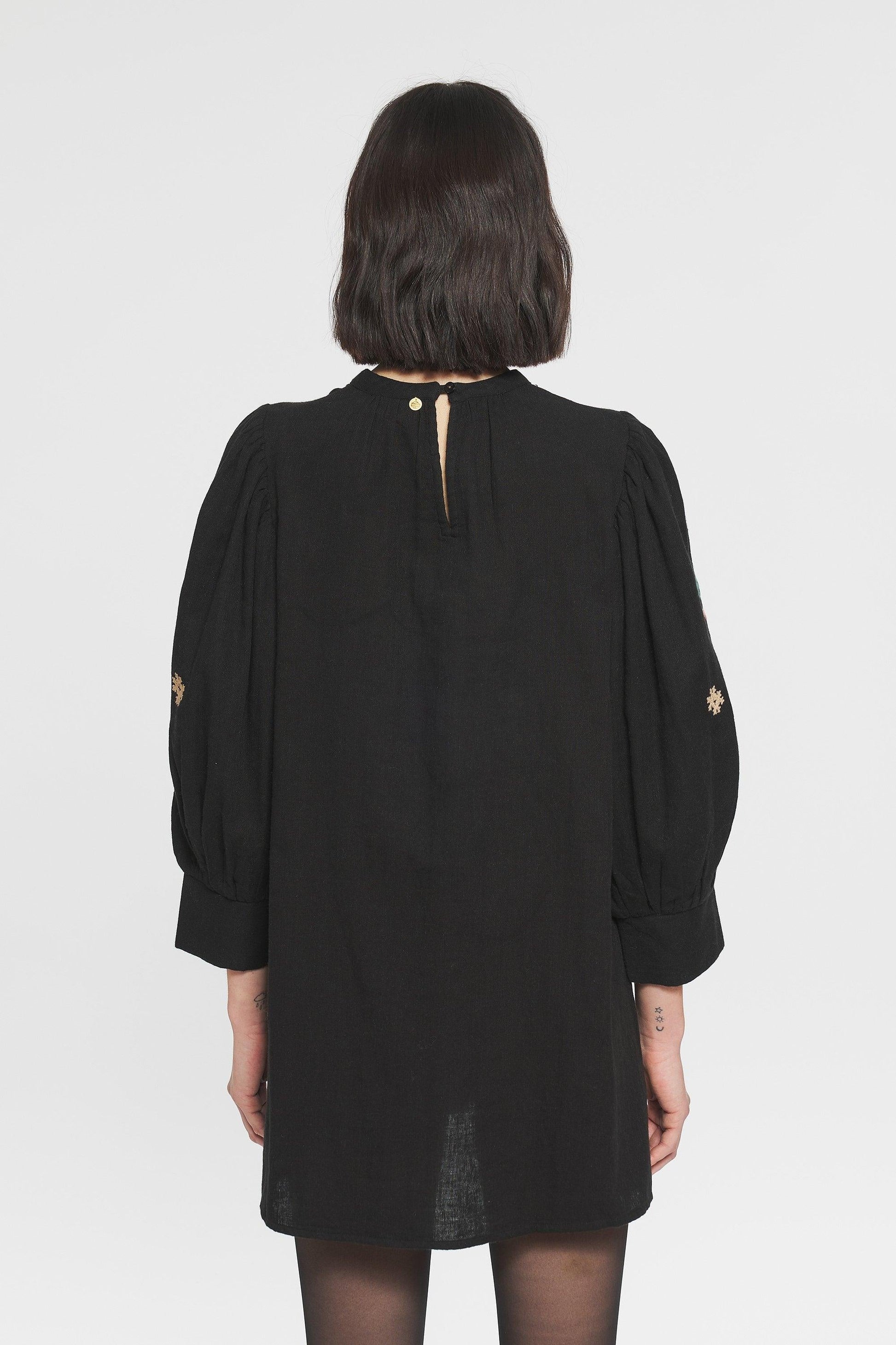 Lined cotton gauze mini dress. Hand-embroidered details on the front and sleeves. Dress decorated with embroidered mirror details. Cotton lining. Balloon sleeves fastened at the wrists. Fastens at the back with a button.