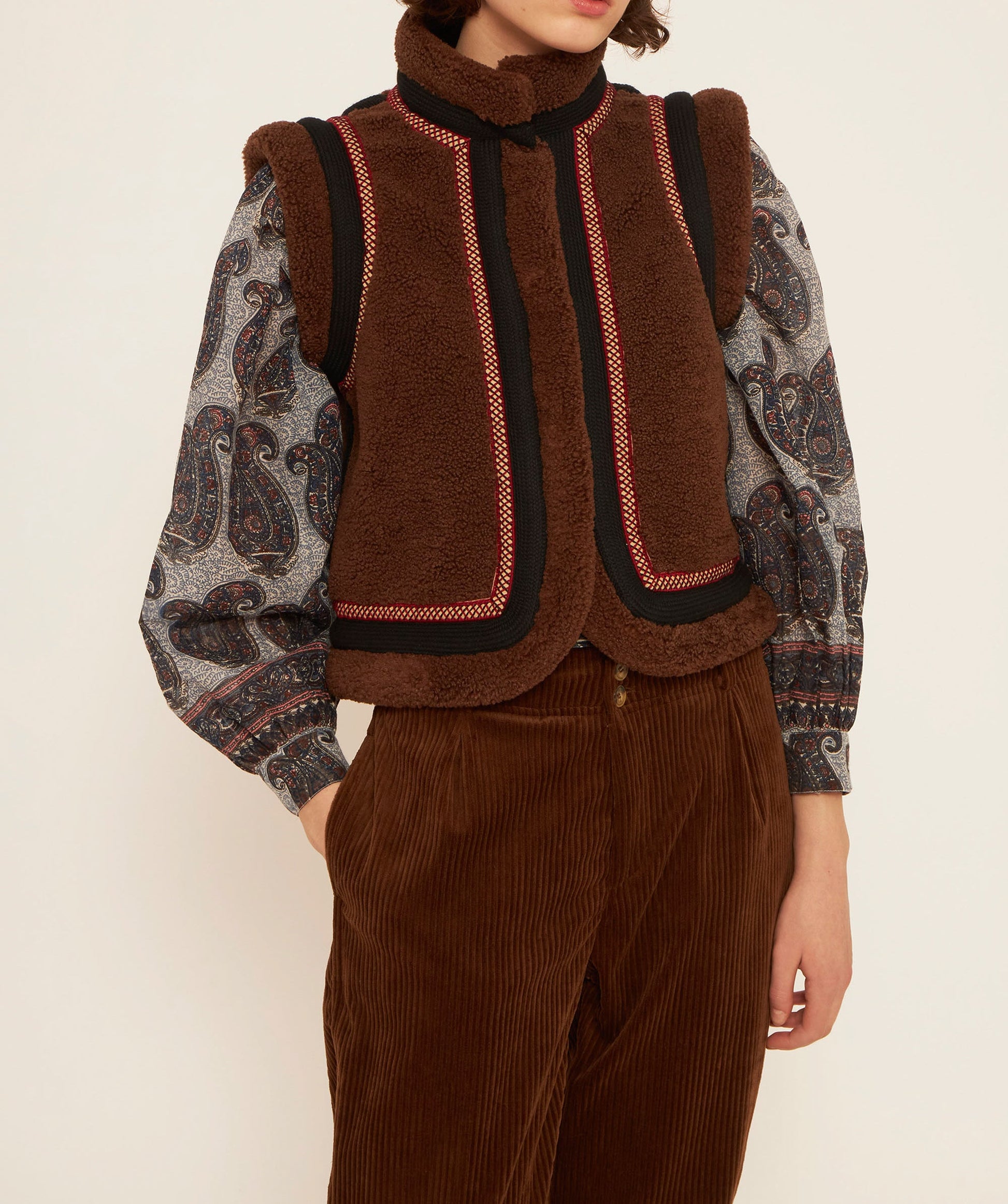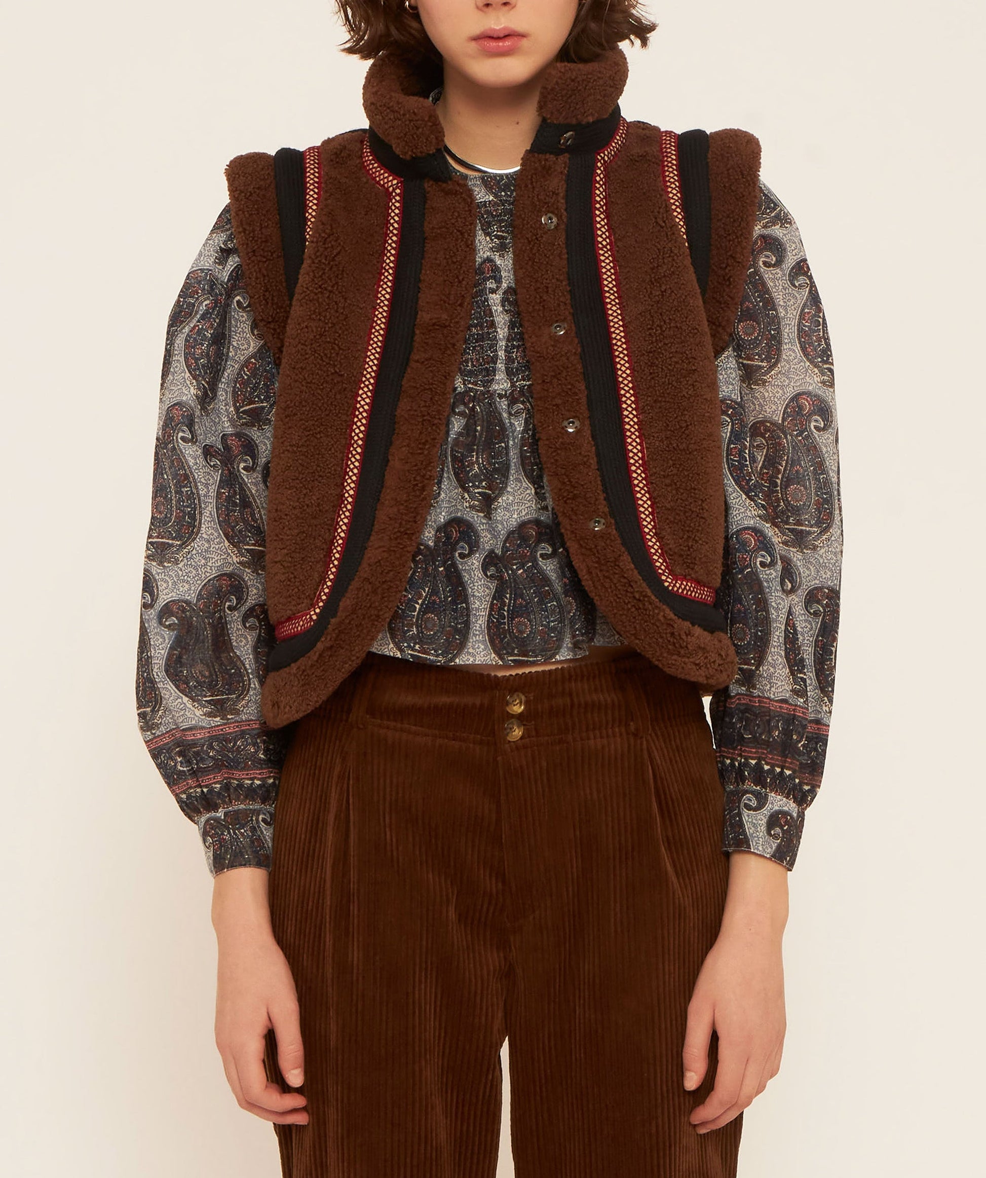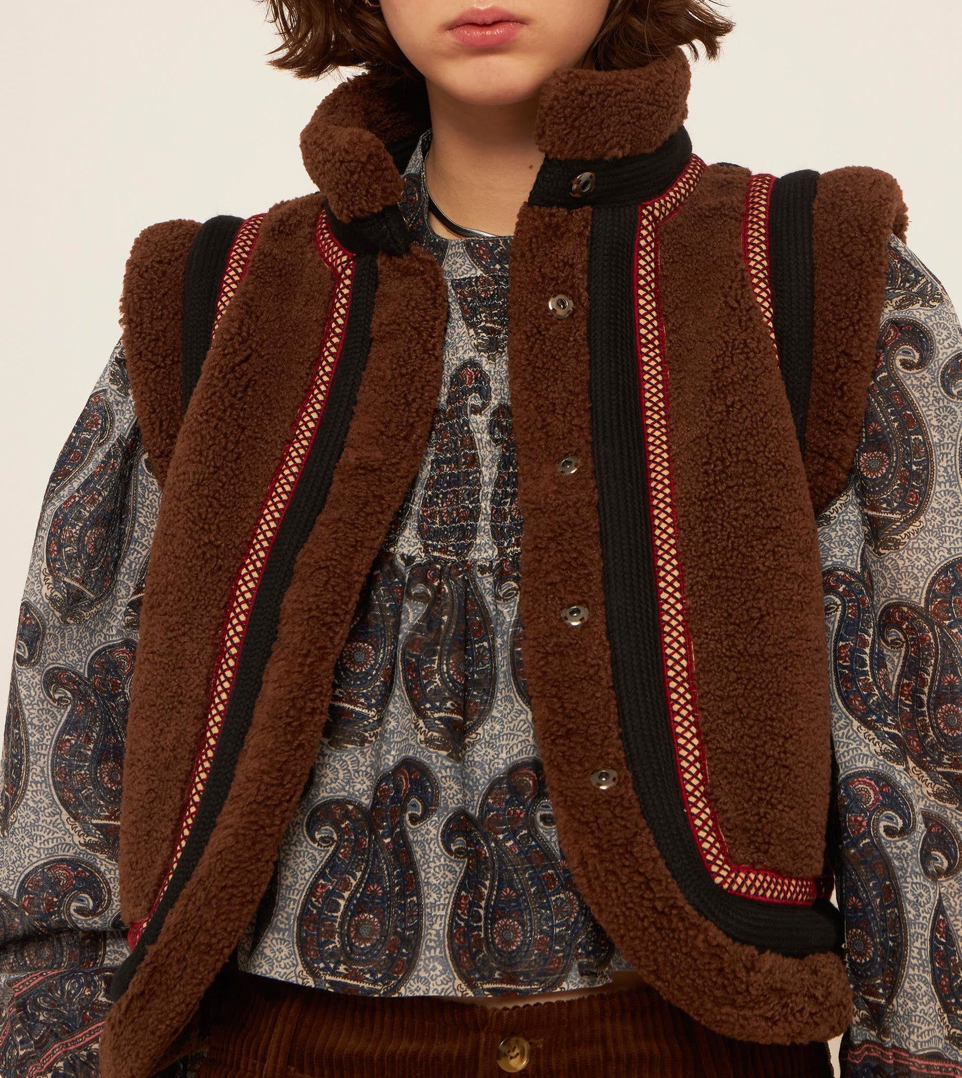 Short sleeveless vest. Brown faux fur. Black and beige braid applied throughout. Snap button closure.