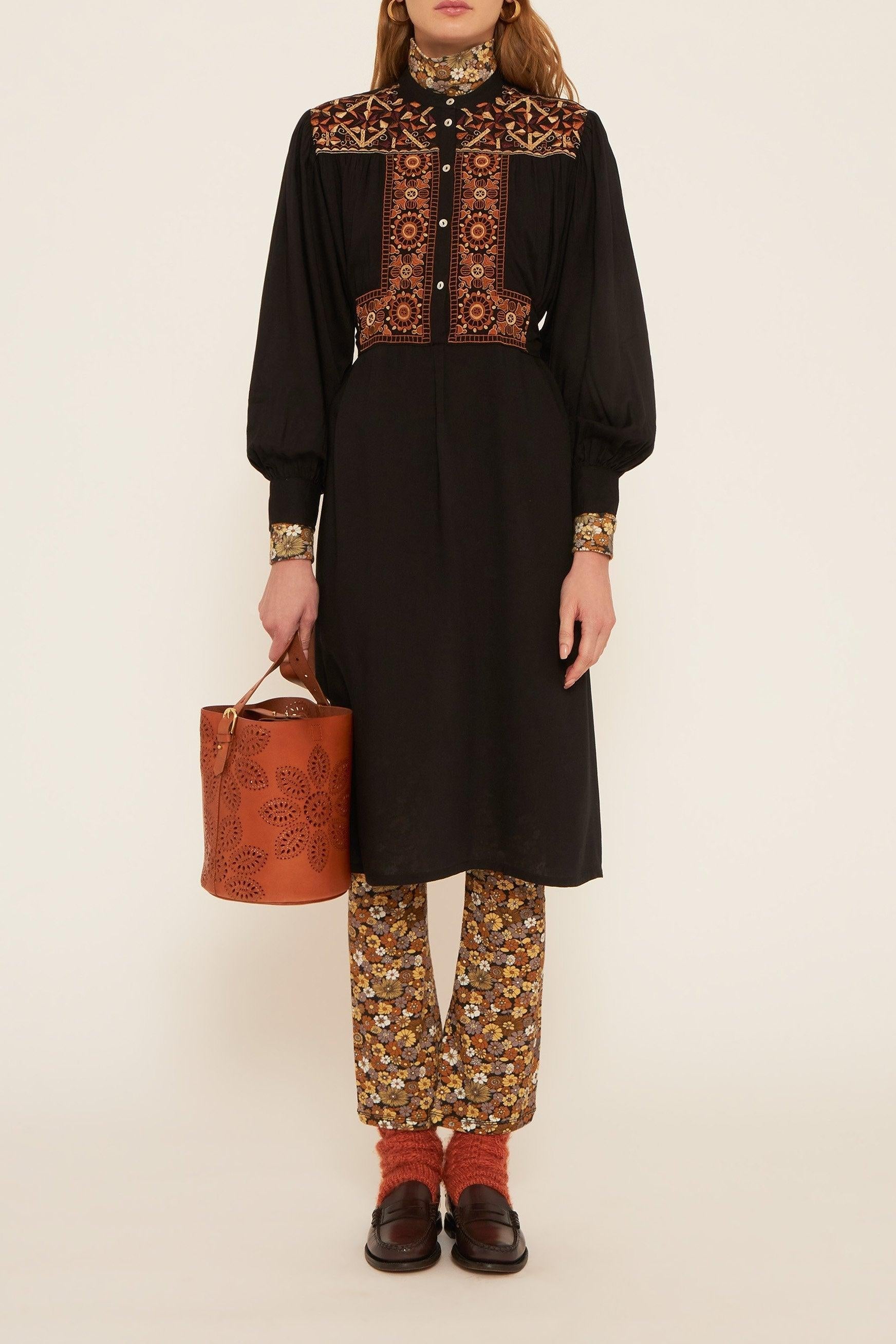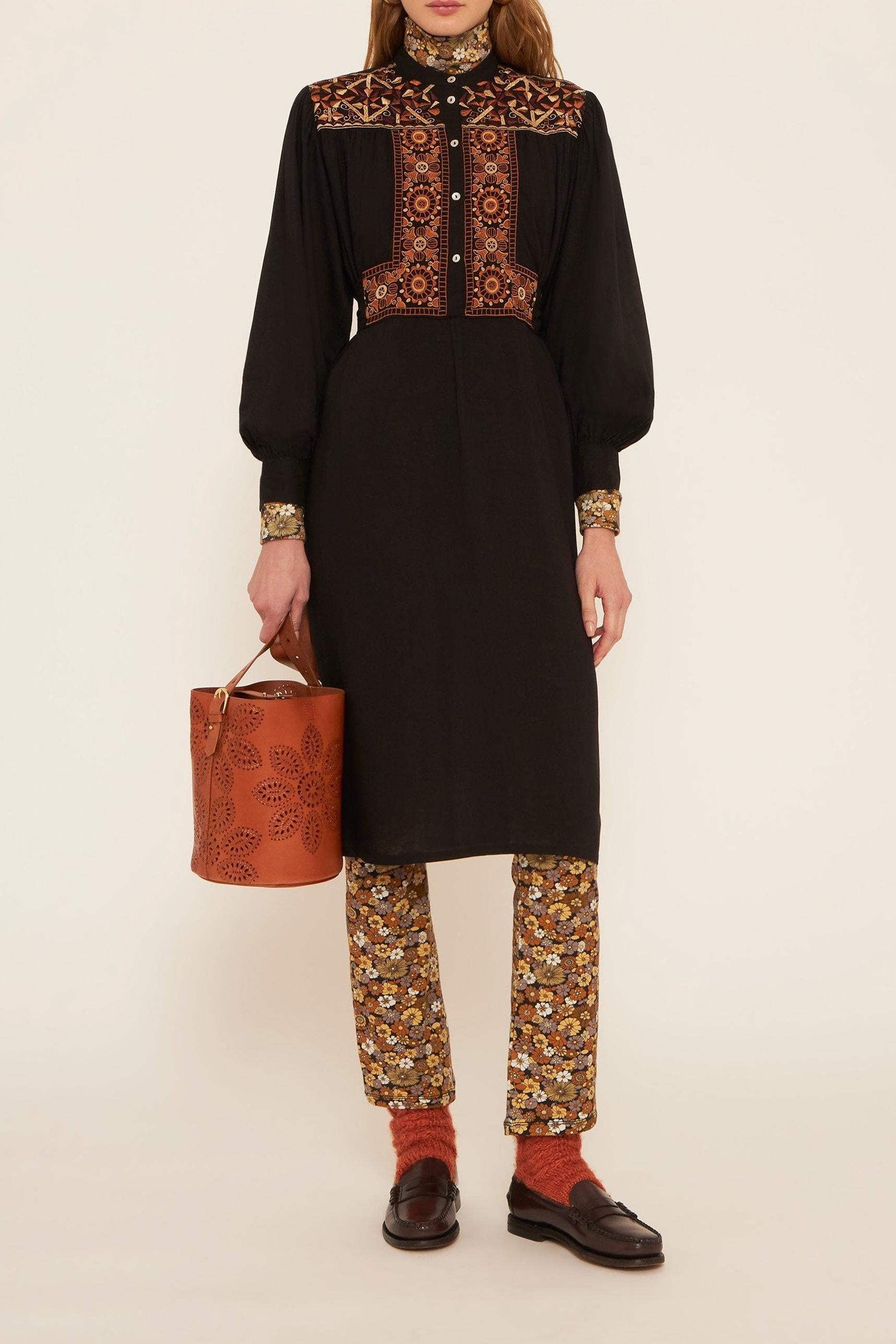 Vestido largo fluido de crepe de viscosa con bordados. Bordado floral artesanal en la parte delantera del vestido. Cuello con volantes. Sin botones. Lazos calados insertados en la parte delantera, mangas y puños del vestido. Se puede ajustar a la cintura gracias a un cordón en el vestido. Pequeños volantes en las muñecas y en la solapa de los botones. Atrévete con lo transparente -o no- gracias al vestido lencero que acompaña a esta pieza.