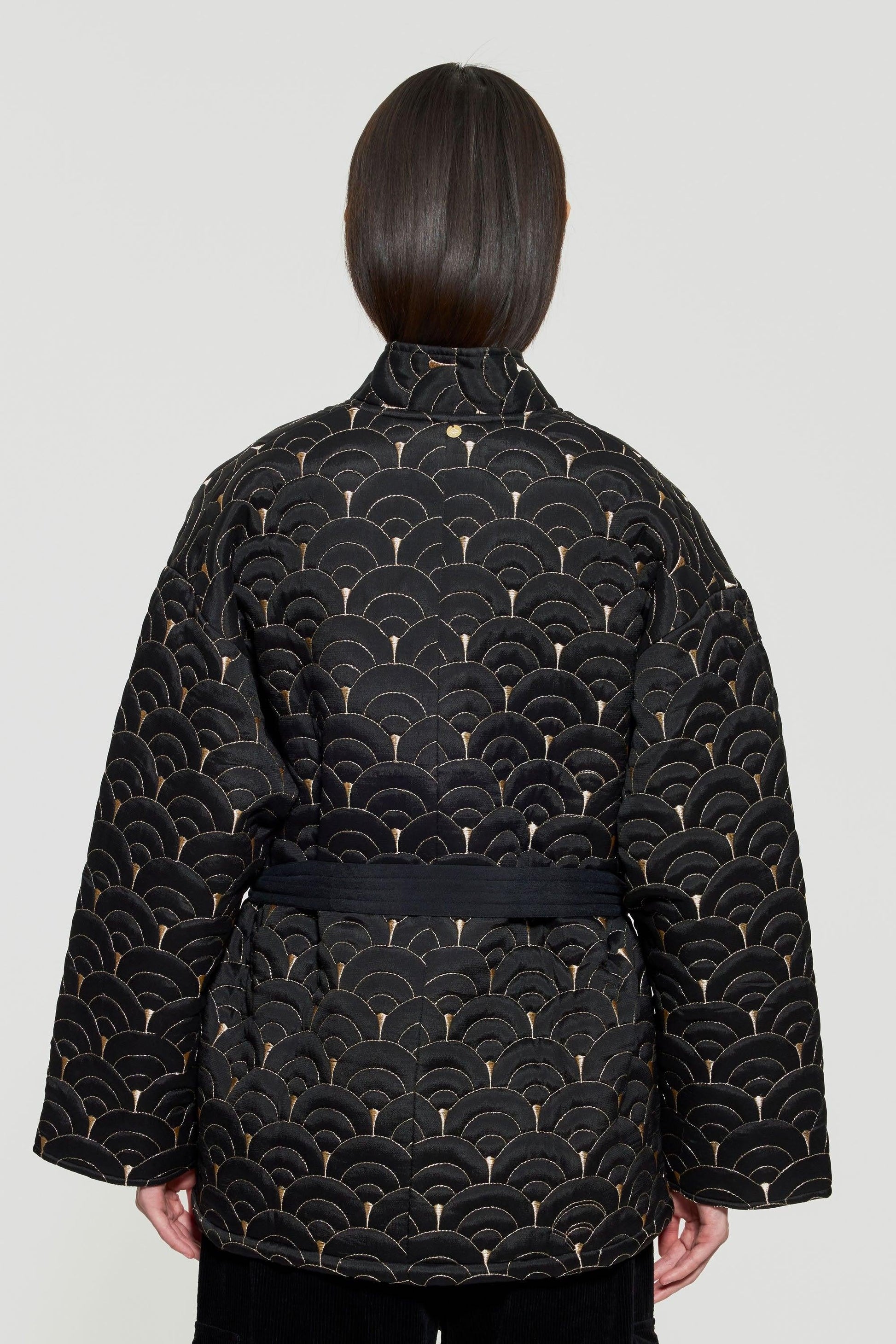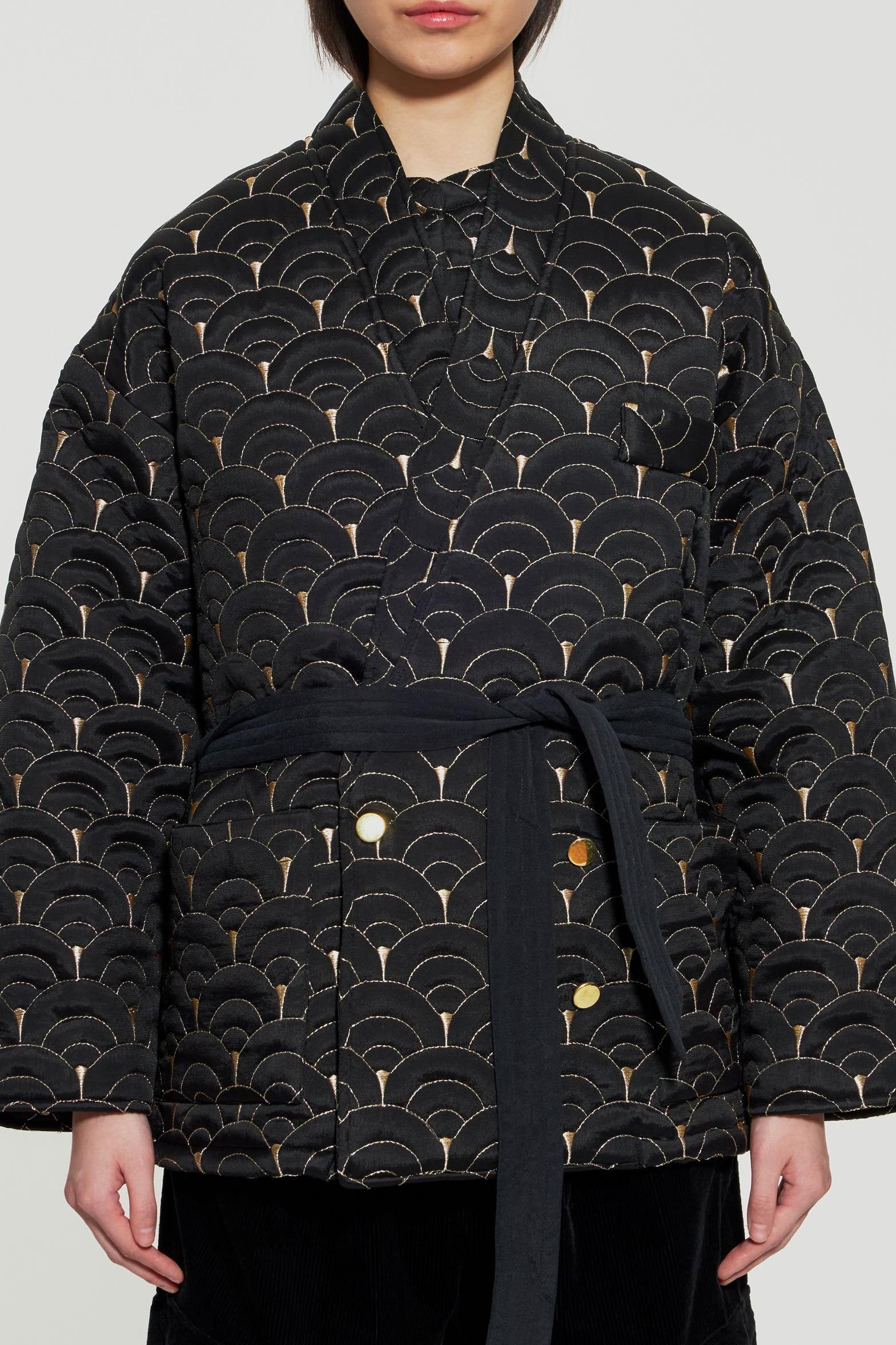 Chaqueta bordada en crepe de viscosa estilo kimono. Bordado de lurex. 2 bolsillos laterales. Cierre con doble botonadura mediante botones dorados. Cinturón desmontable. Totalmente forrado.