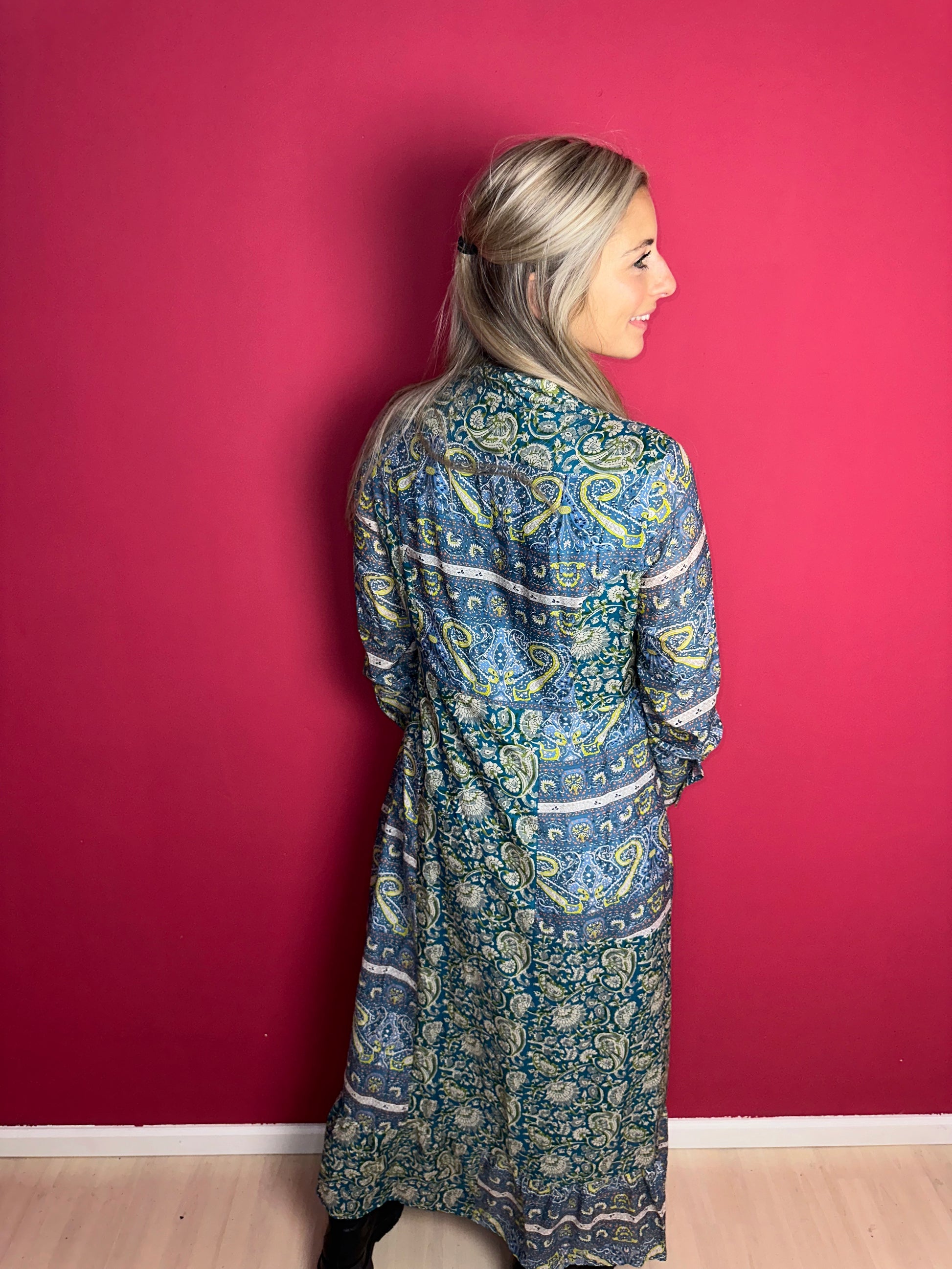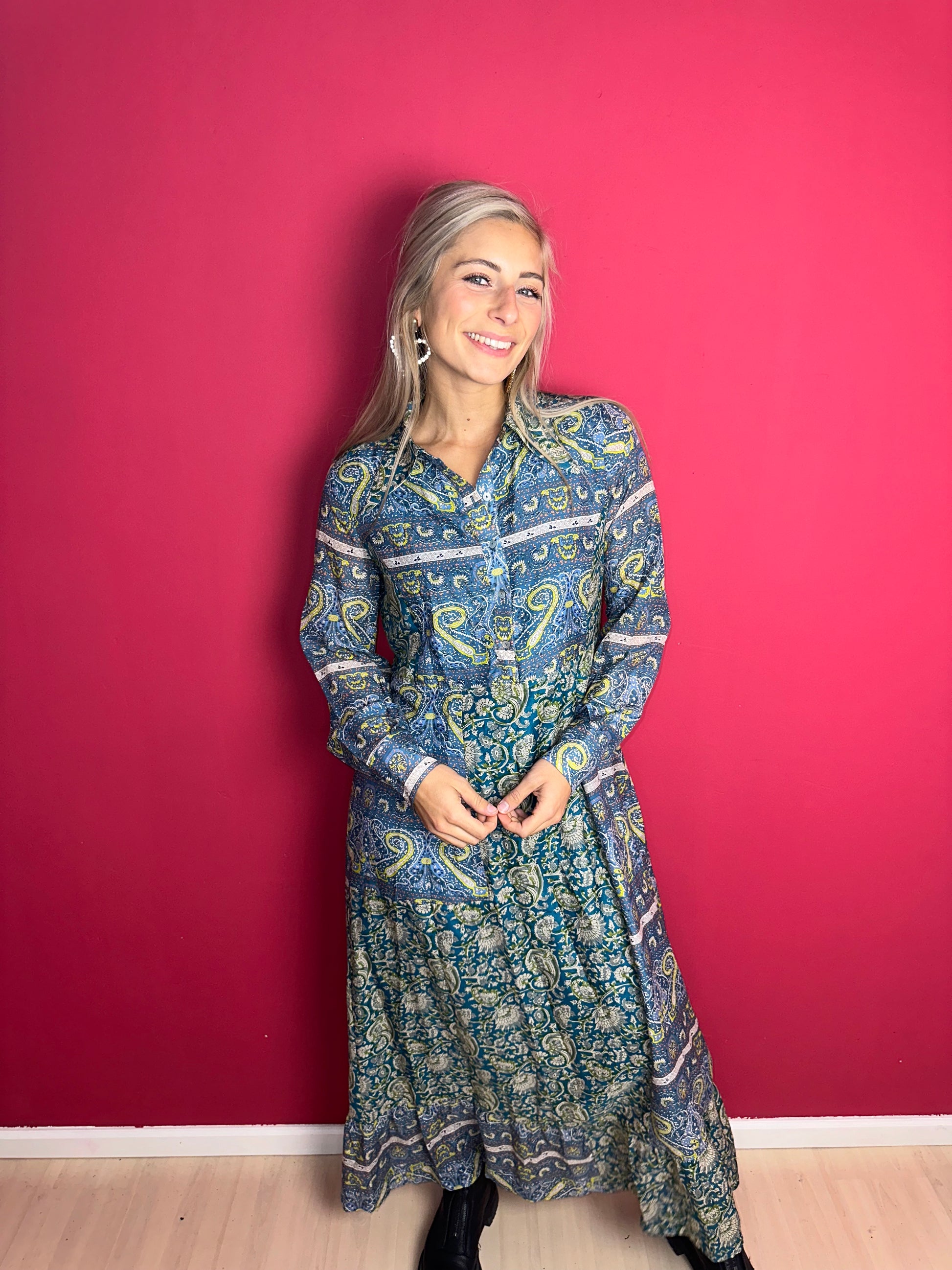 Vestido largo evasé en algodón y seda fluido, estilo camisero. Patrones florales en Batik, una técnica tradicional de impresión de telas. Tapeta de botones con botones de perla en el pecho. Mangas largas ajustadas en las muñecas con botones de perla. Volantes en la parte inferior del vestido. Nuestro vestido largo Kheti es una pieza destacada de esta temporada, para usar sin moderación. El vestido está forrado. 75% ALGODÓN 25% SEDA. Esta pieza única fue hecha a mano. Nuestras piezas son delicadas y requieren lavado a mano en temperatura fría o limpieza en seco.