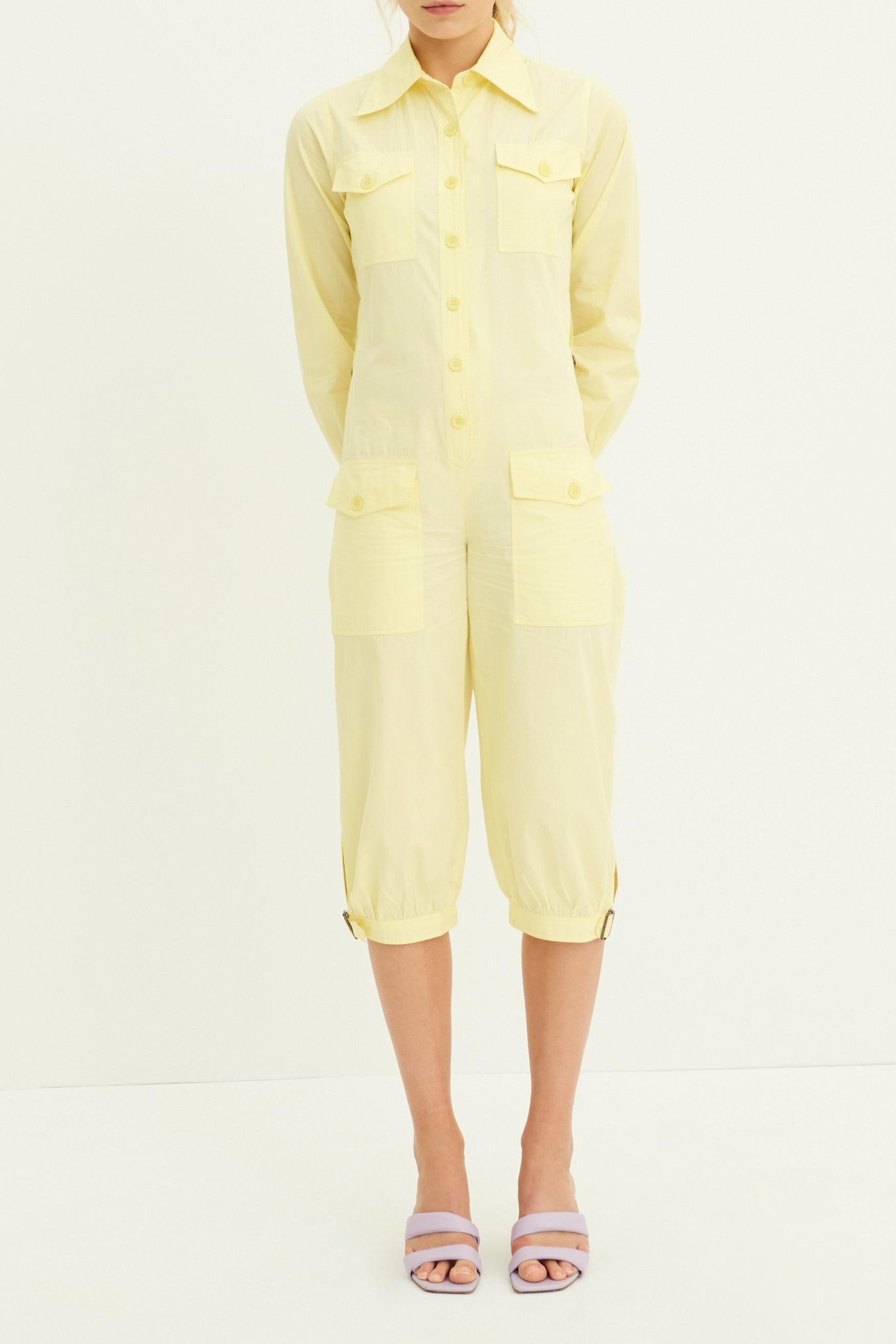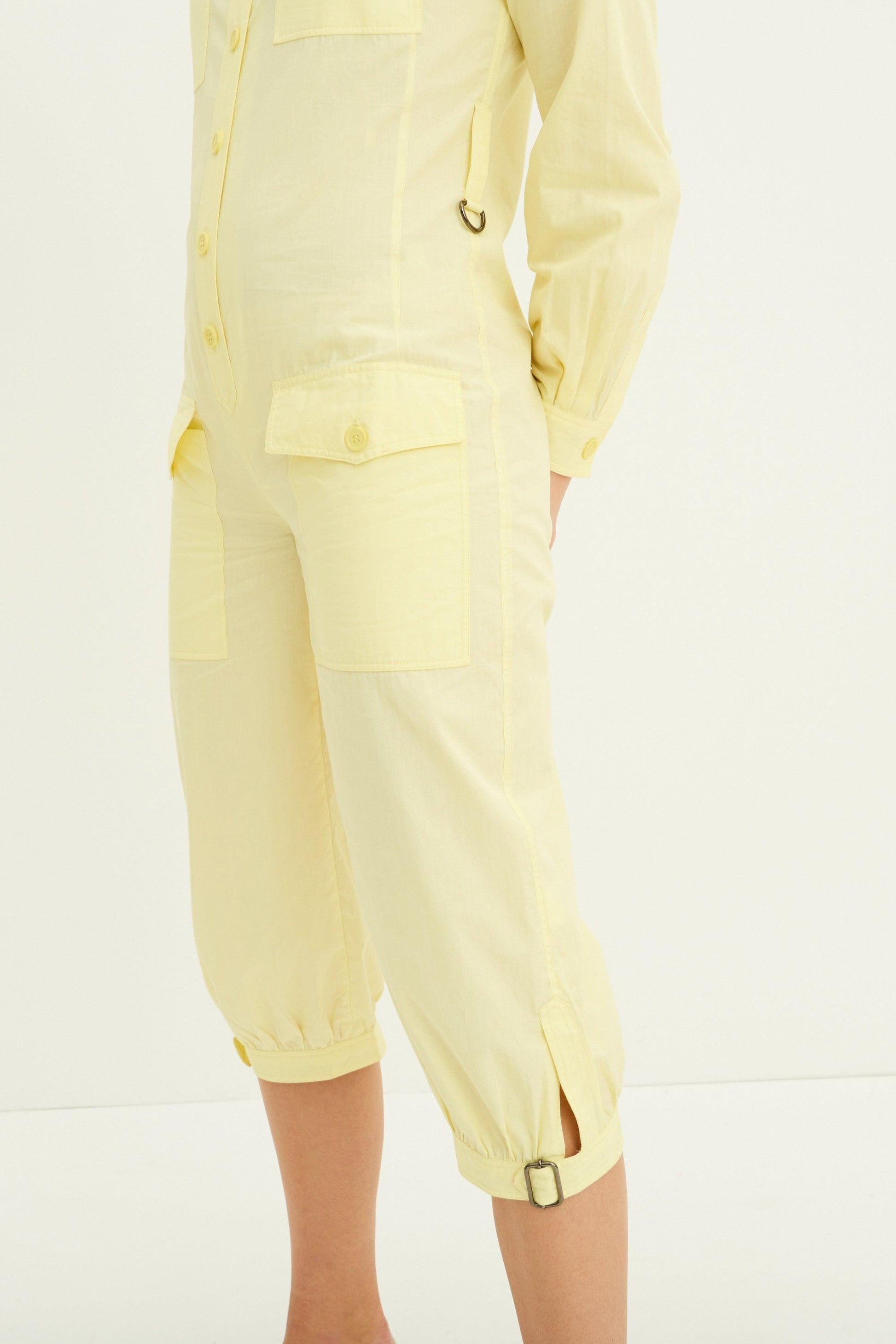 Mono de popelina de algodón de color amarillo pastel. Mangas largas. Puños abotonados. cuello de blusa. Cierre de botones en la parte delantera. Dos bolsillos en el pecho, dos bolsillos en la parte inferior. Largo de bermuda. ¡Lleva el safari a la ciudad! 100% popelina de algodón