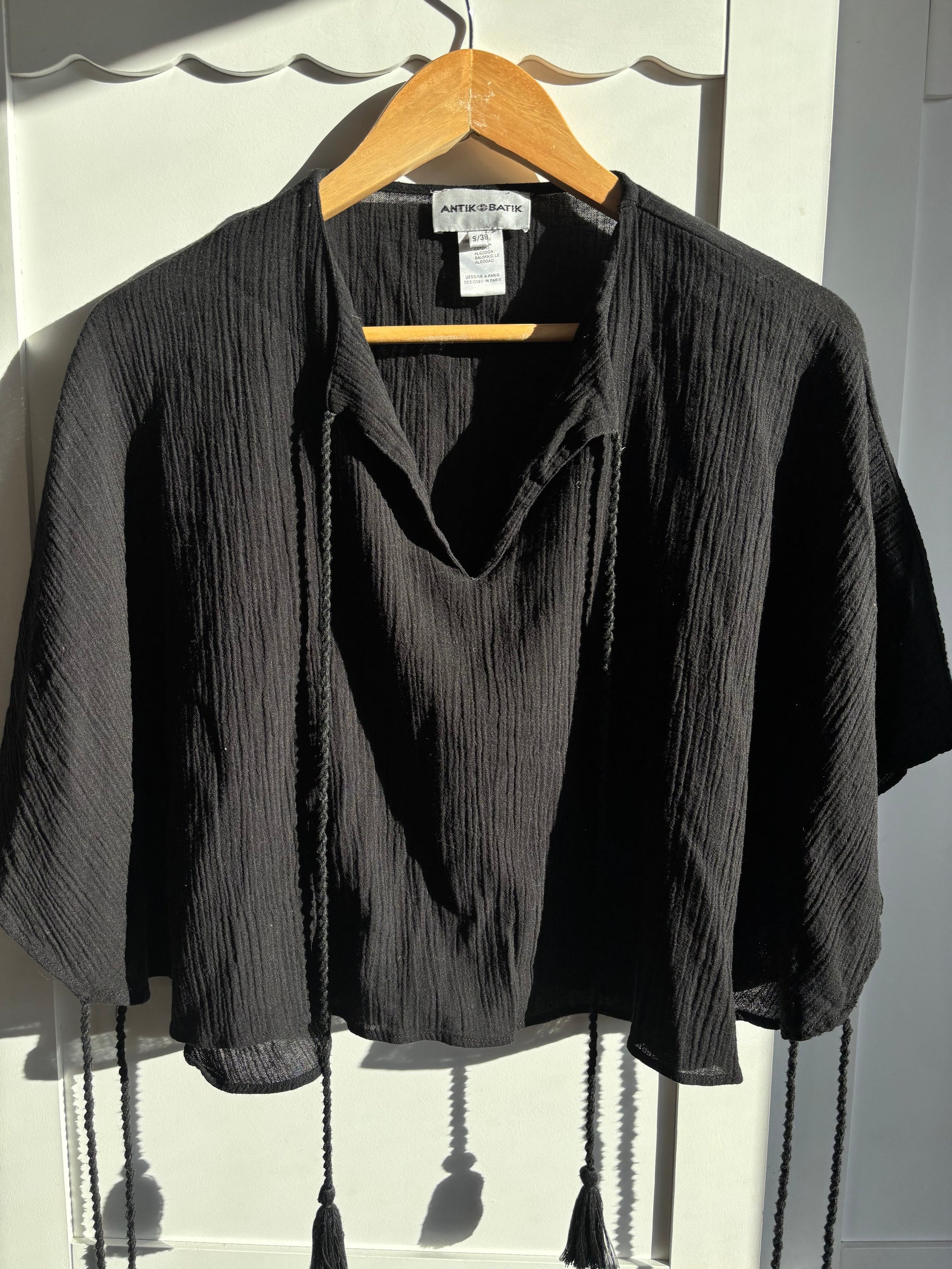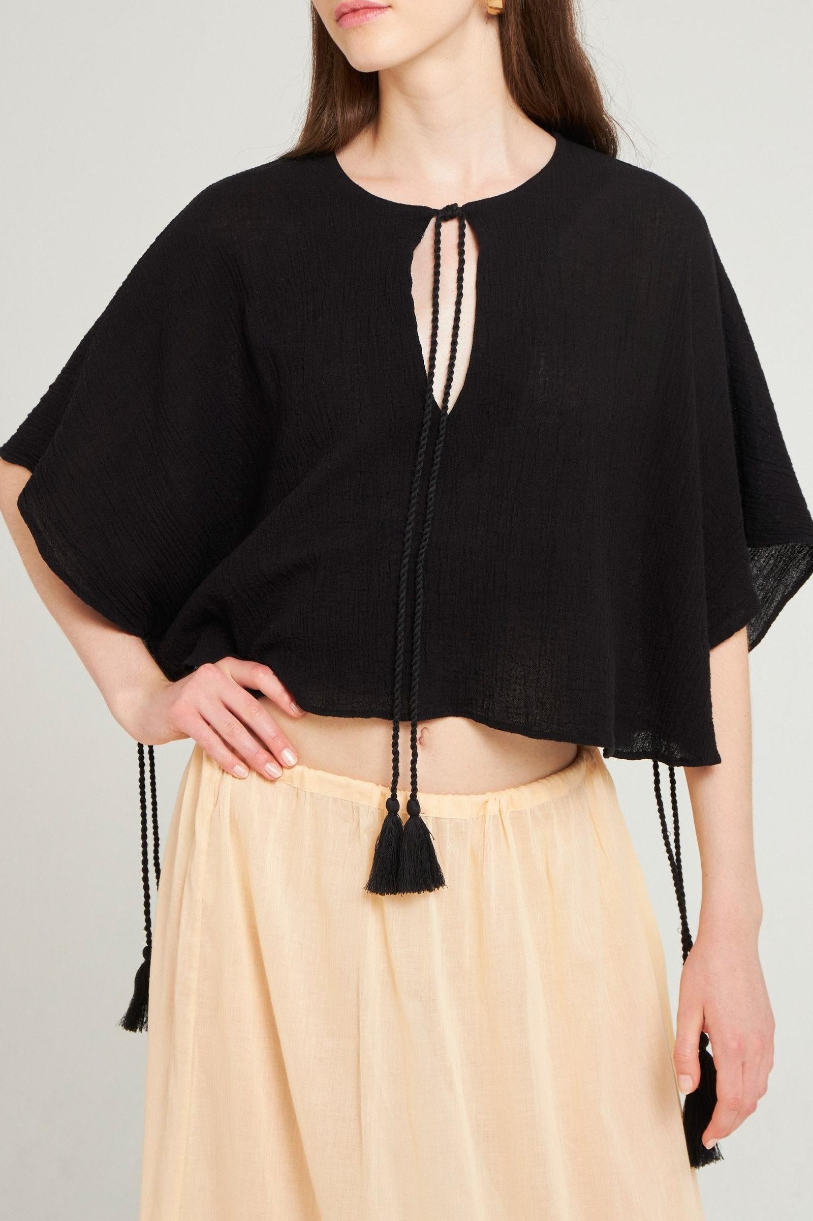 Mini caftán de crepé de algodón. Cuello redondo con abertura, se cierra con dos cordones retorcidos con pompones. Pompones hechos a mano.