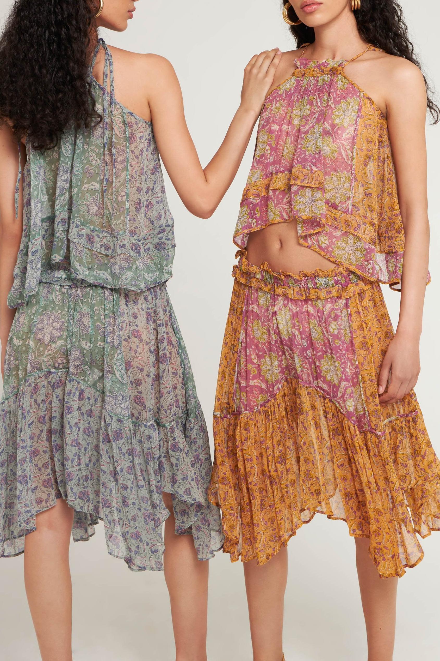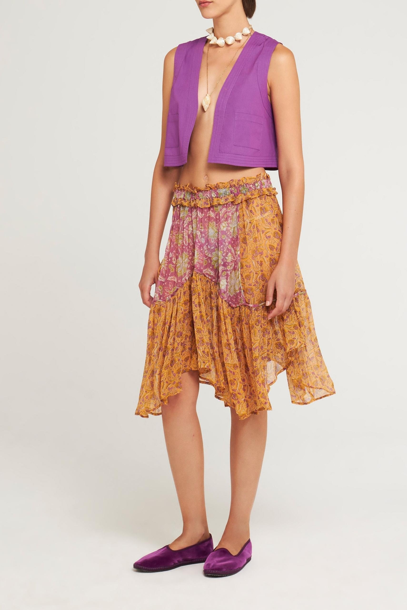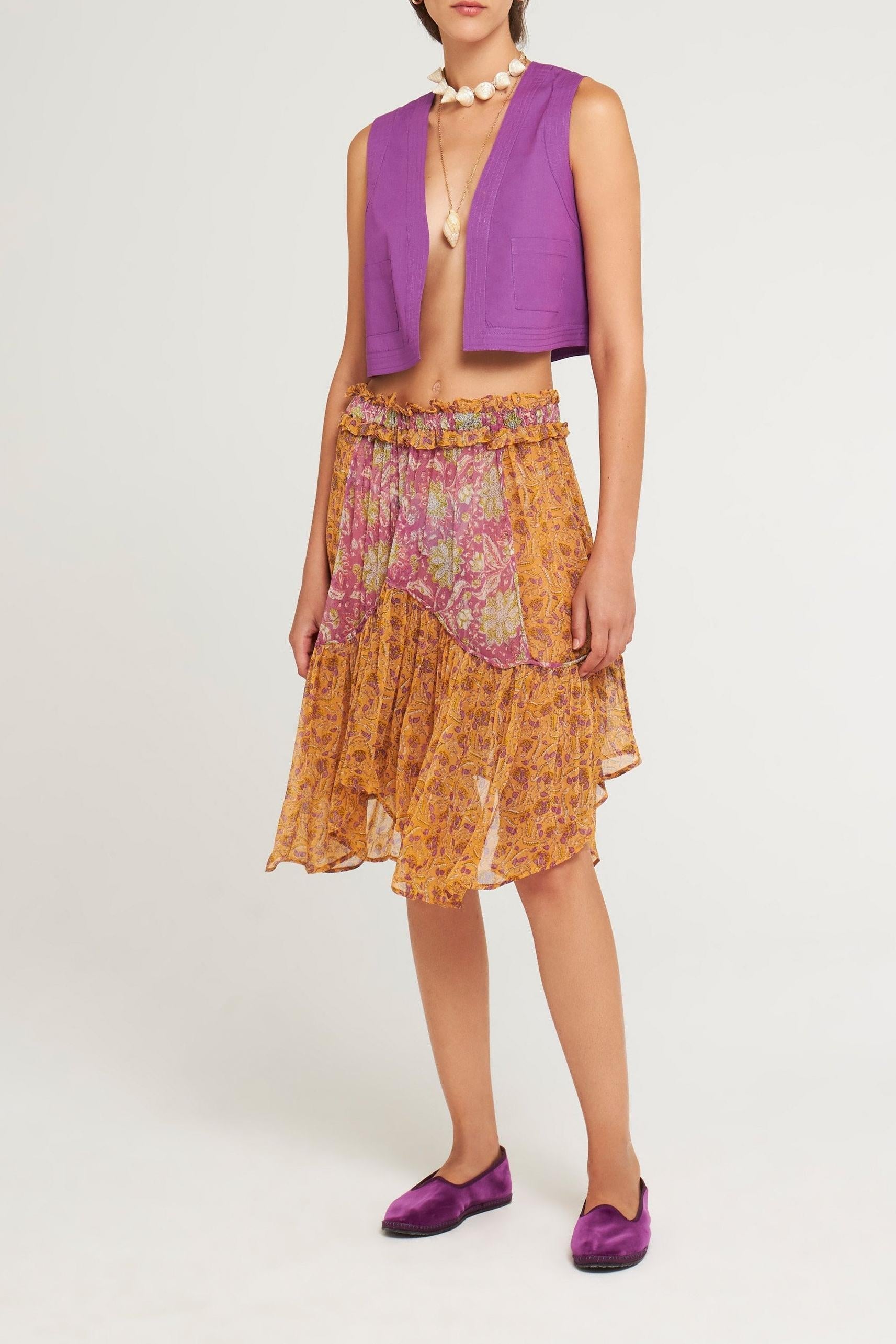 Falda asimétrica de gasa de viscosa. Estampado diseñado en nuestro estudio parisino y luego aplicado a mano sobre la tela mediante la técnica de impresión en bloque (técnica artesanal india). Elástico en la cintura. Viene con una falda lencero.