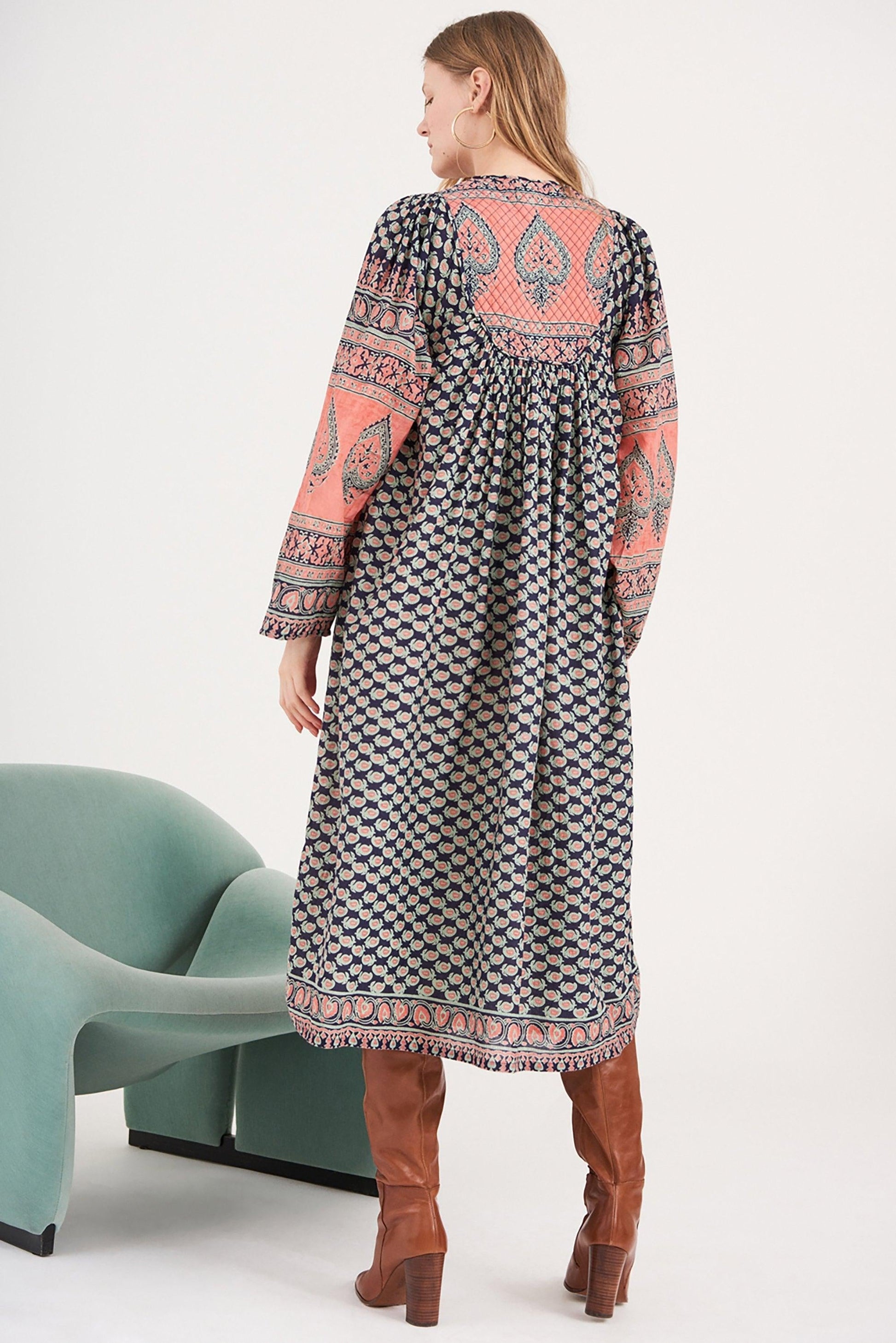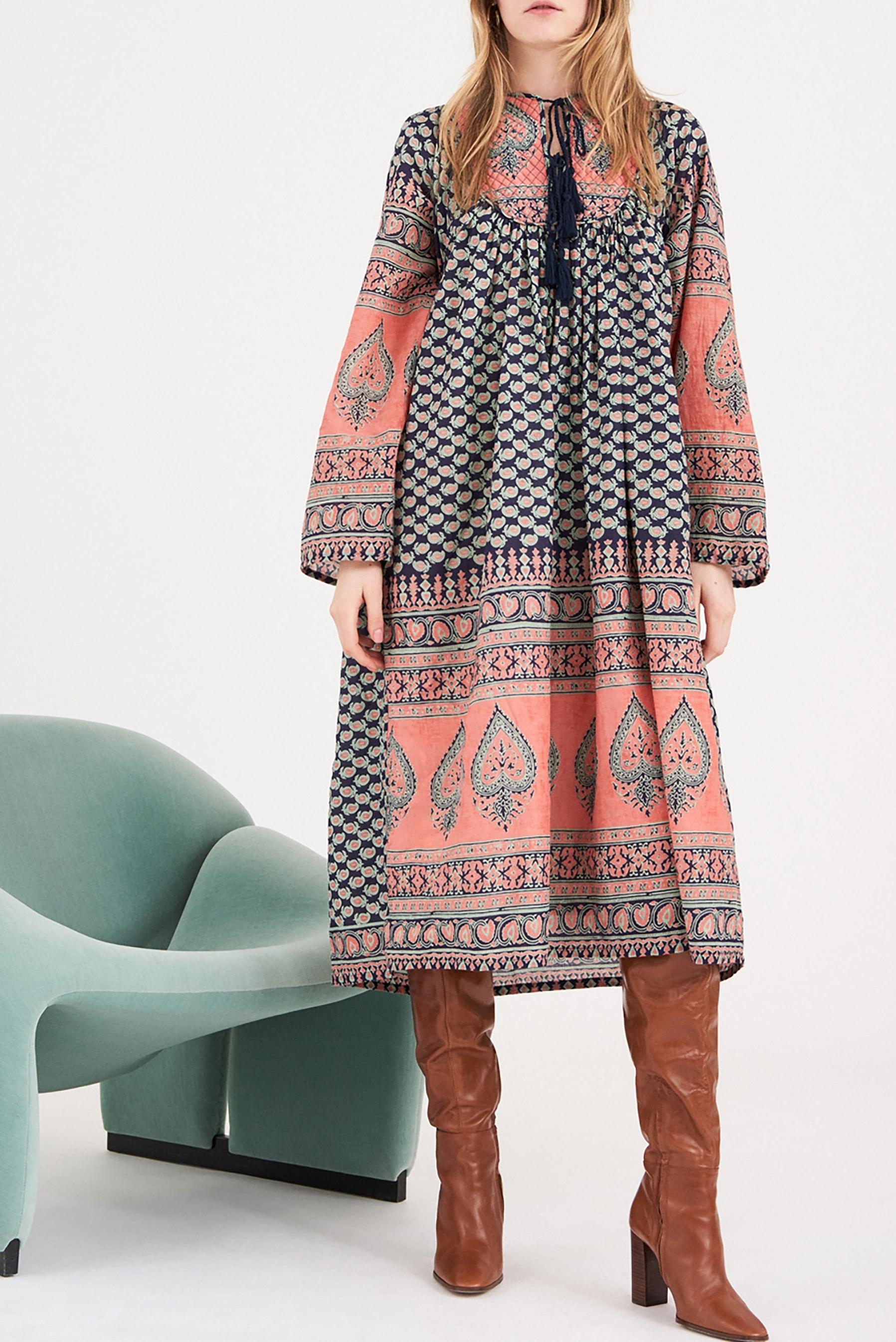 Vestido midi de velo de algodón. Estampados contrastantes: floral y paisley. Cuello redondo con lazo de pompón. Escote ovalado ligeramente acolchado. Mangas largas y acampanadas. Opta por un vestido boho chic que combine atrevidos estampados florales con un corte clásico.