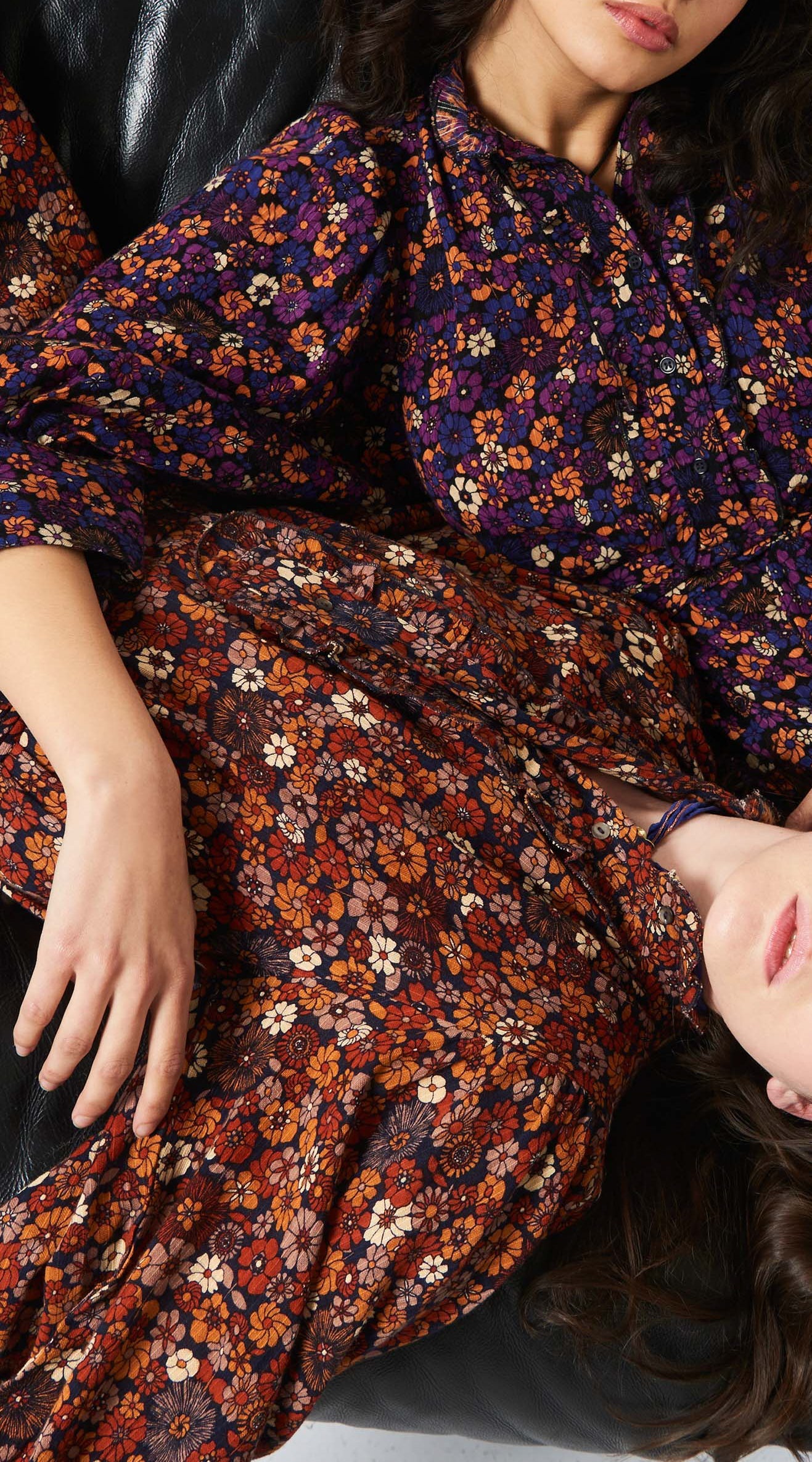 Vestido estampado floral de los años 70 en crepe de algodón. Tapeta con botones de nácar genuino. Volantes en el cuello y tapeta con botones. Mangas 3/4 ligeramente abullonadas. Se entrega con su cinturón tono sobre tono. Dobby 100% algodón