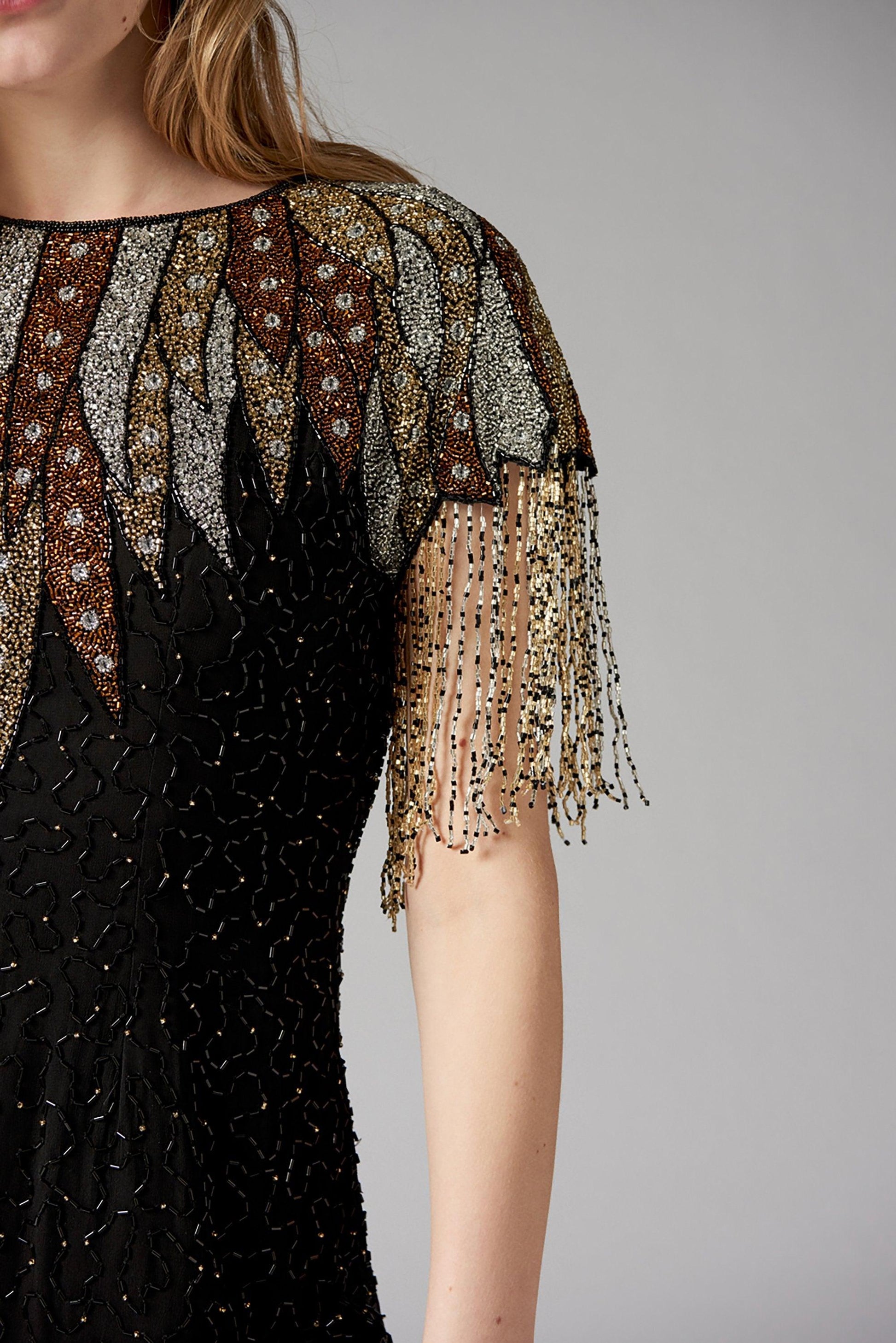 Vestido corto negro bordado con dibujos de perlas y lentejuelas. Corte ceñido al cuerpo. Mangas cortas decoradas con flecos de cuentas. Cuello redondo. Espalda halter con cierre de botones. Este brillante vestido inspirado en los años 20 será perfecto para la temporada navideña.