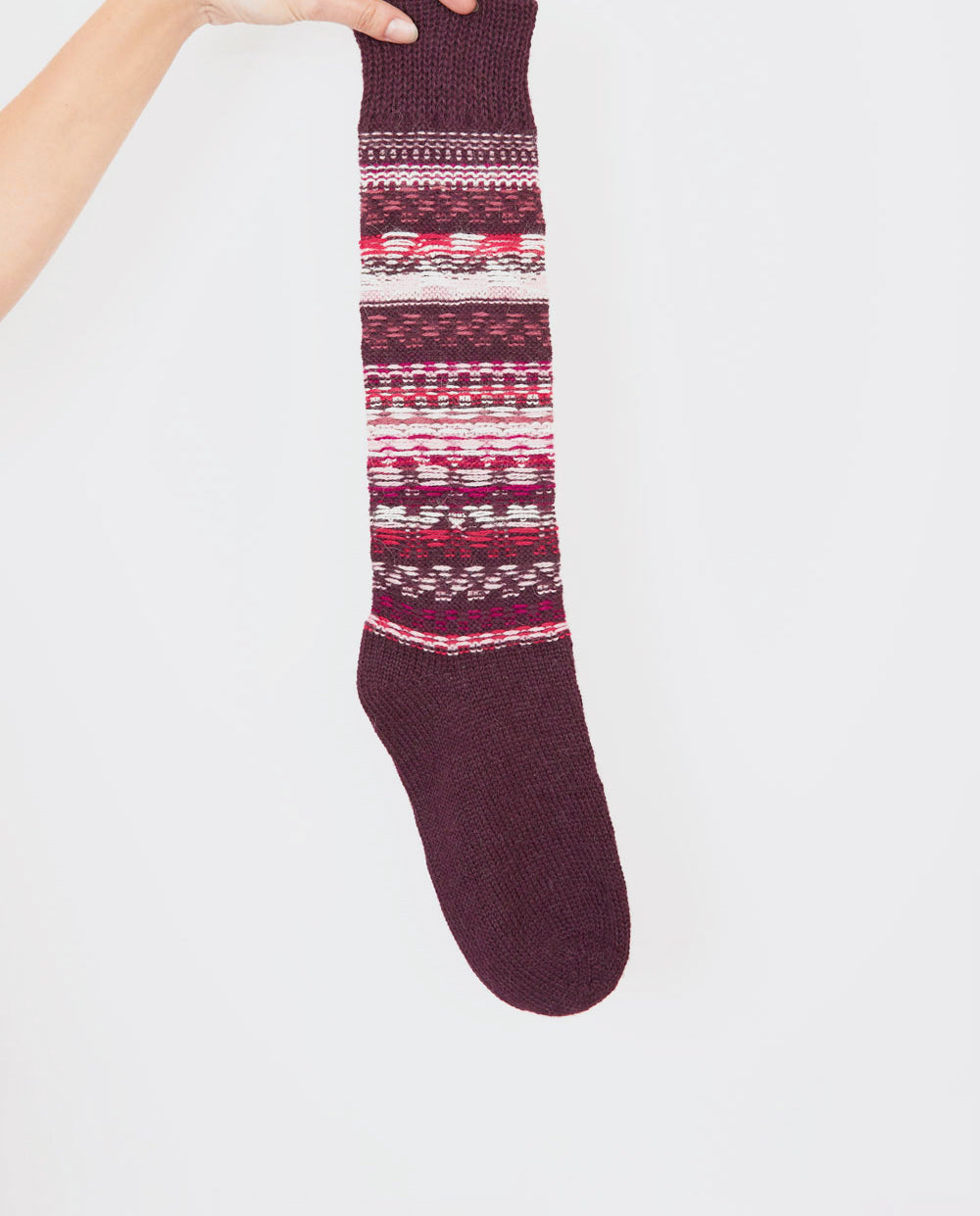 Calcetines peruanos tejidos a mano en tonos morados y burdeos.