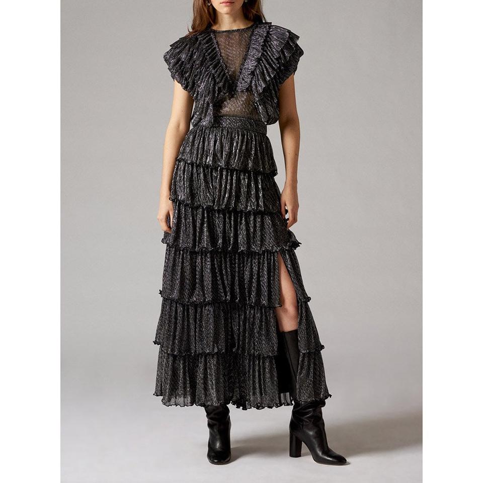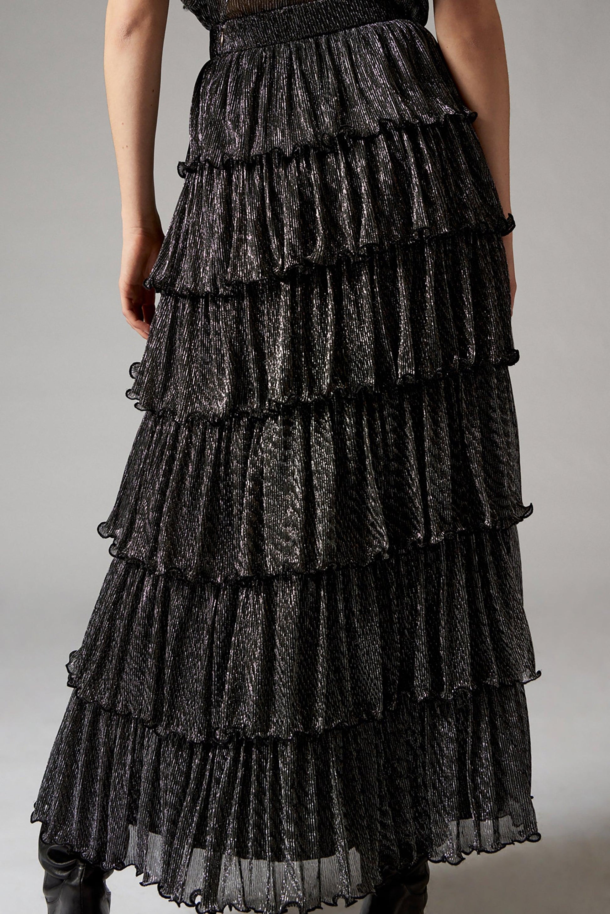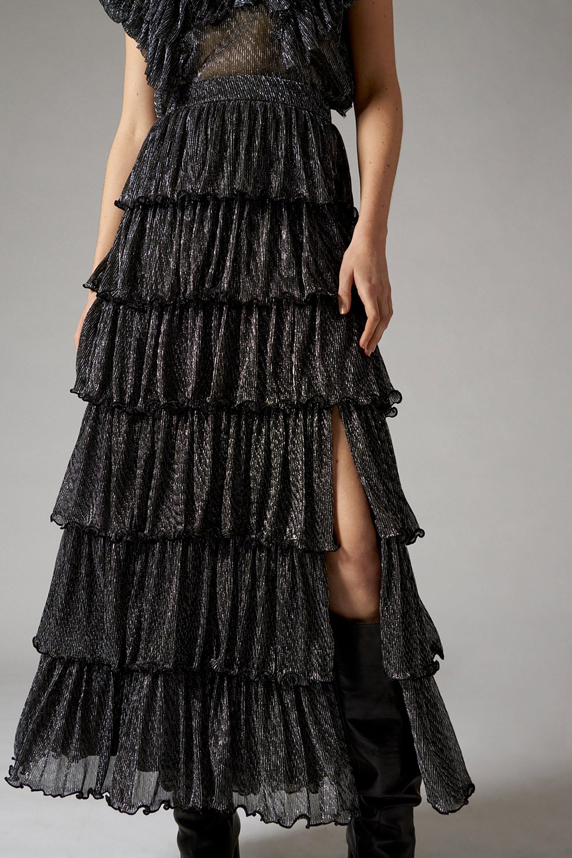 Falda larga negra y plateada. Cintura alta. Combinación decorada con varias capas de volantes. Abertura en el lateral. Cierre de cremallera en la espalda. Esta falda decorada con rayas de hilo de lurex será ideal para la temporada navideña.