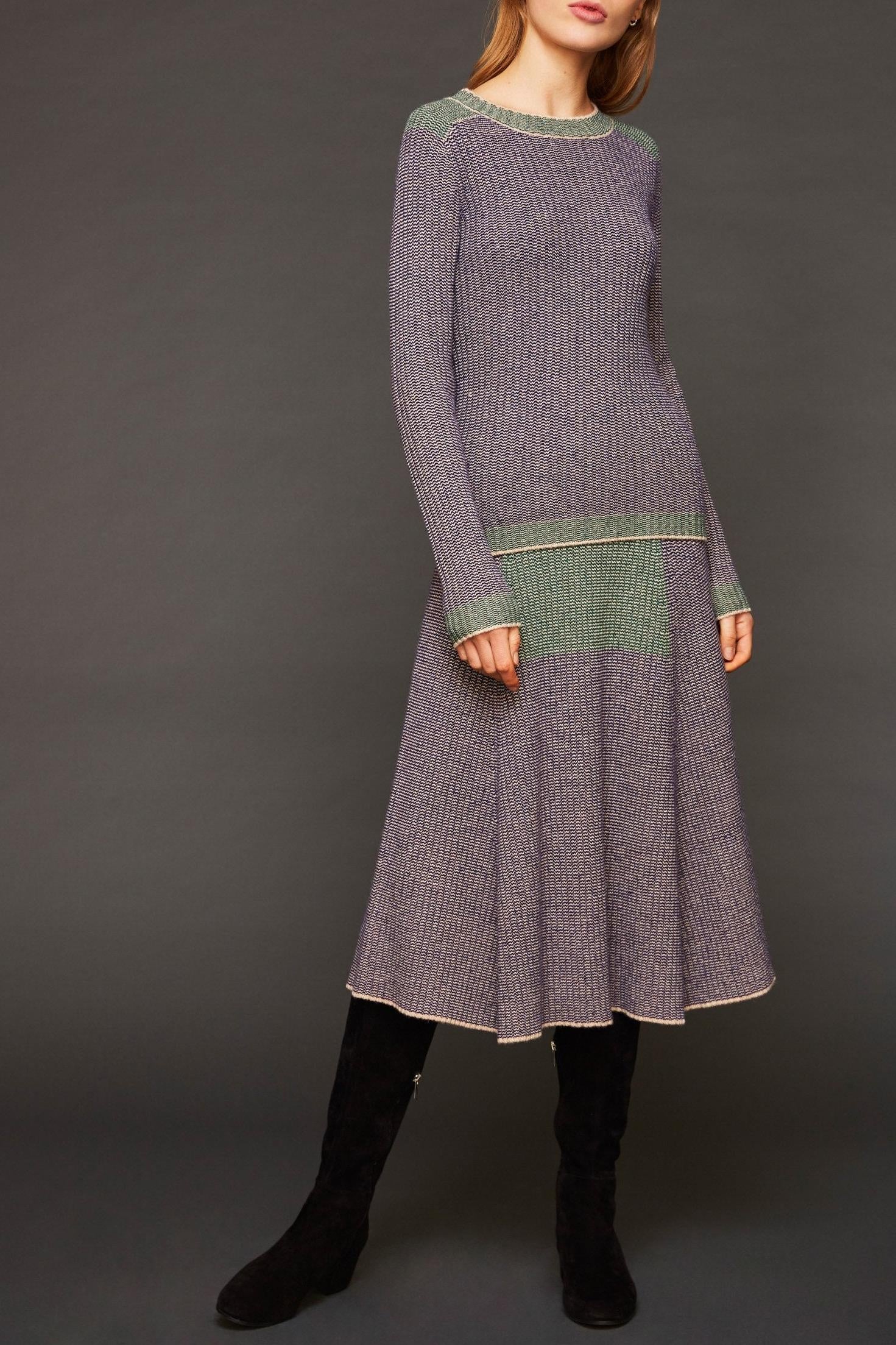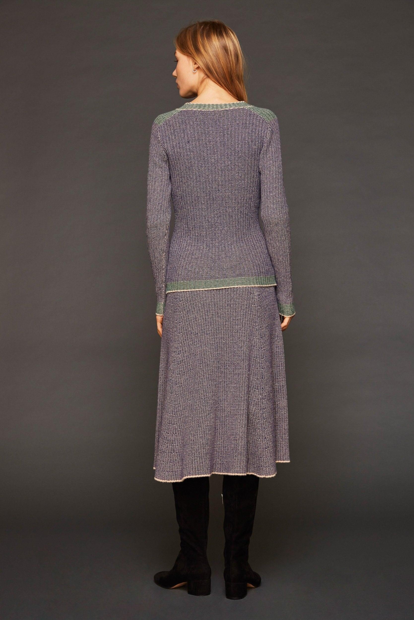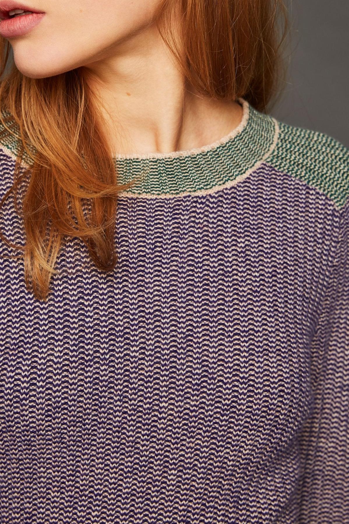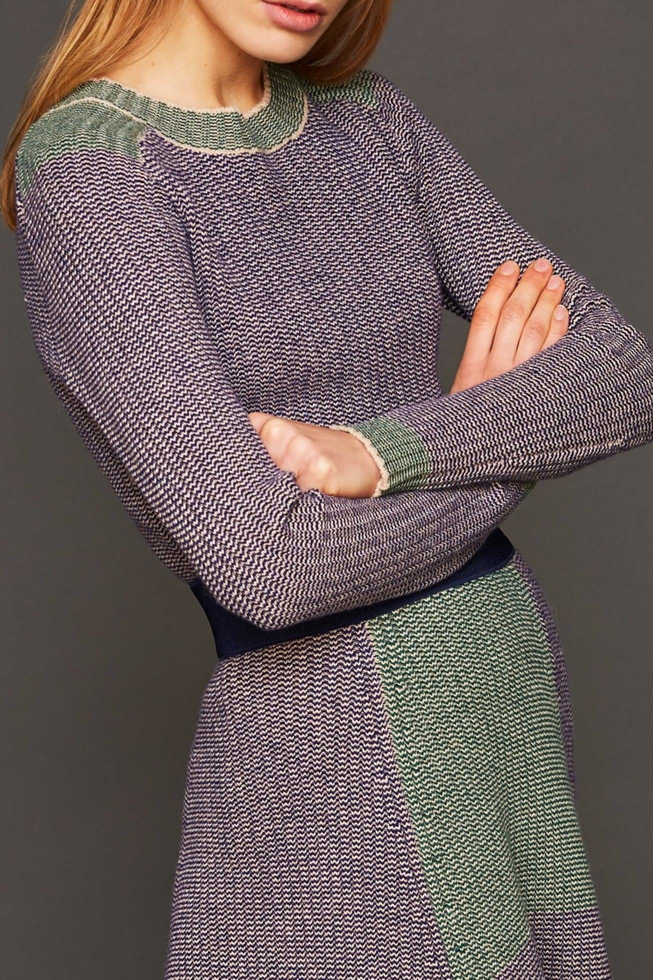 El suéter azul Lina, de punto de lana acanalada, es suave sobre la piel. El corte ajustado le da a este suéter de cuello redondo un aspecto sexy. Las inserciones verdes dan un toque vibrante a este tejido. Atrévete con el total look llevando el jersey Lina con la falda a juego. Britt mide 177 cm de alto y usa una talla 38 (S). El suéter Lina mide 62 cm de largo para una talla 38 (S).