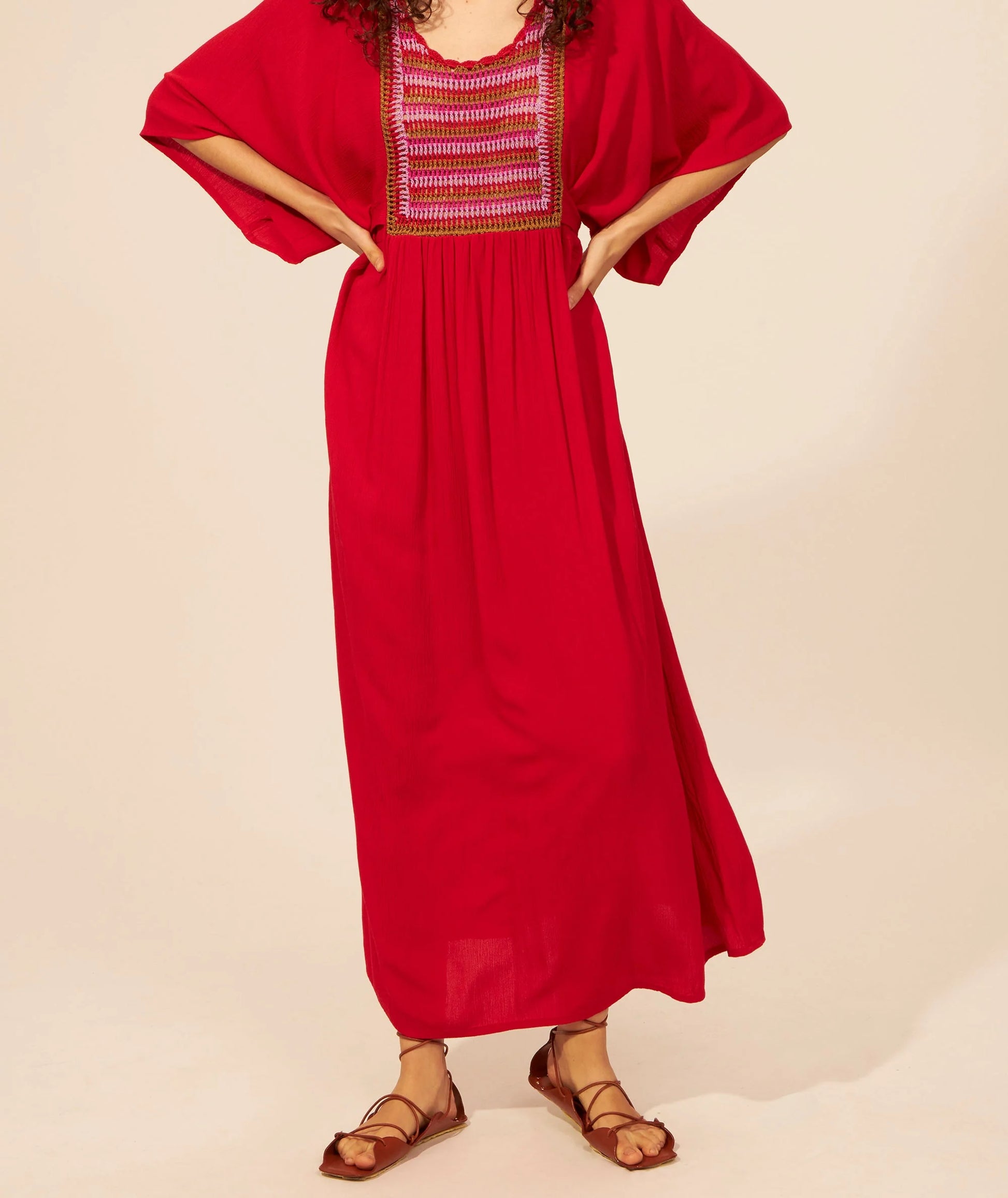 Kaftan fluide en rouge intense. Plastron brodé au niveau du buste et manches larges pour plus d’aisance. Une silhouette élégante et facile à porter en été.