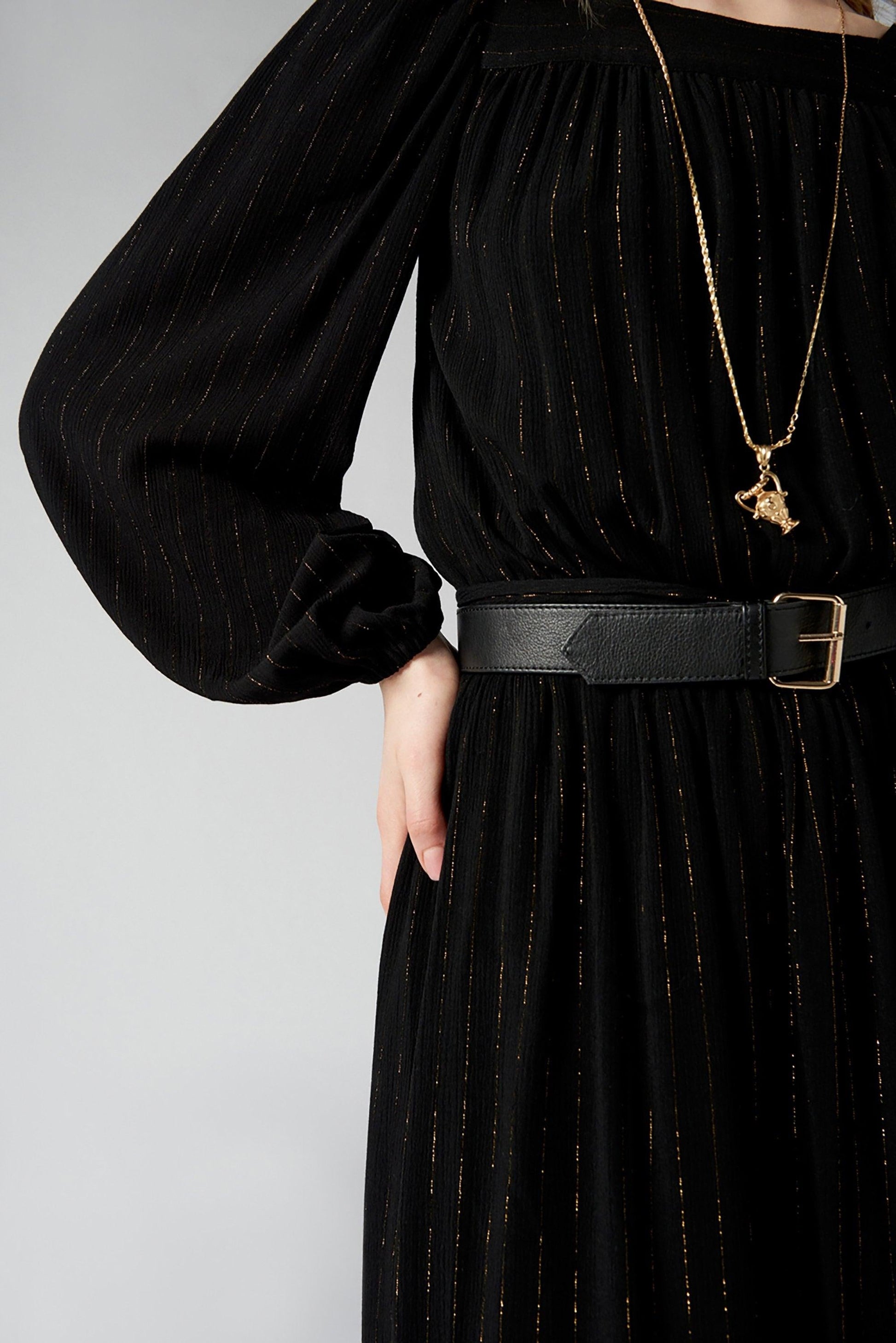 Vestido midi fluido en color negro. Rayas verticales de hilo de lurex dorado. Cuello barco. Mangas largas ajustadas con puños elásticos. Cinturilla elástica con cinturón tono sobre tono. Este vestido sencillo pero elegante es la alternativa perfecta al vestido festivo con lentejuelas.