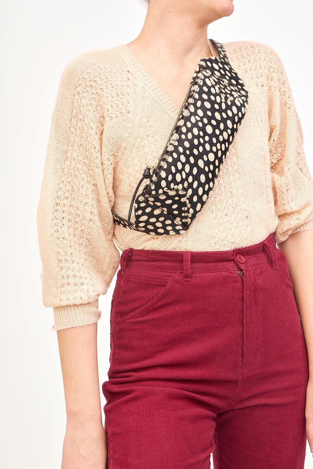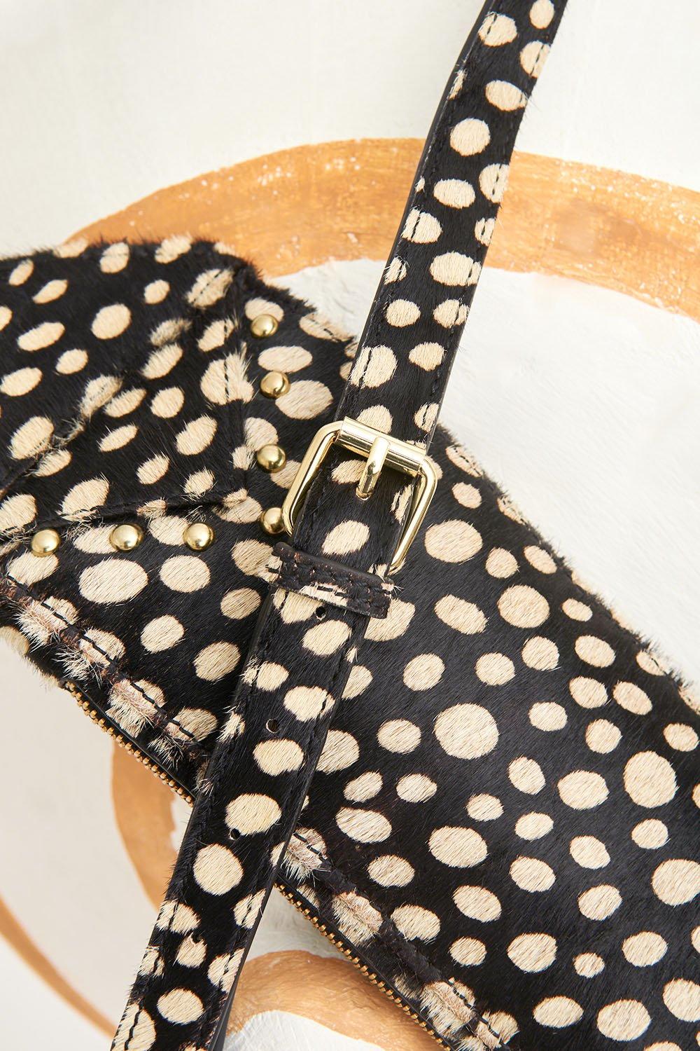Riñonera efecto piel “Pony” con lunares. Decorado con tachuelas de color dorado. Cierre de cremallera. Correa de bucle ajustable. Puedes llevar esta riñonera alrededor de la cintura o como bolso de hombro. Largo de la correa para el hombro: 92 cm - Alto: 12 cm - Largo: 36 cm - Fondo: 4 cm