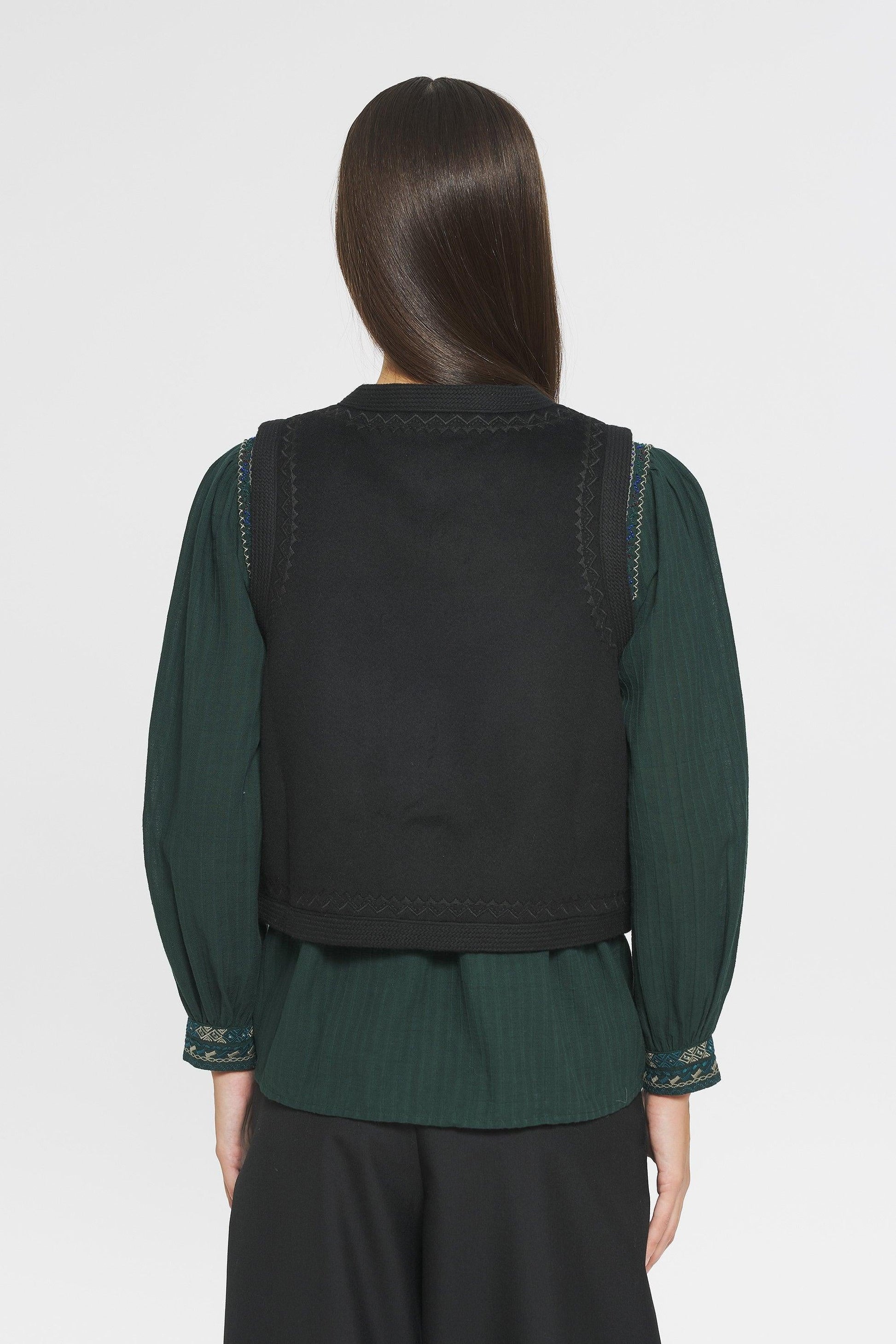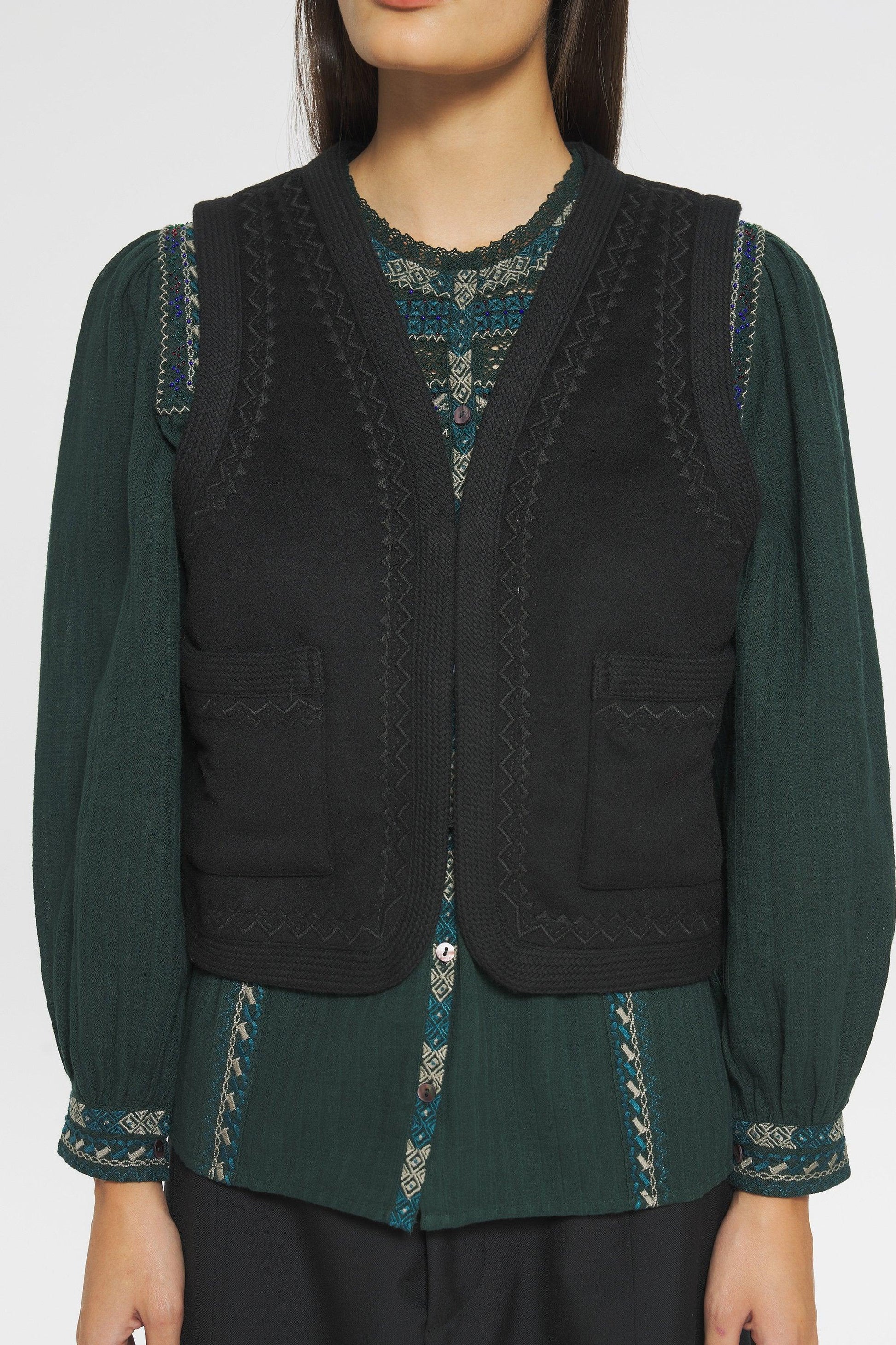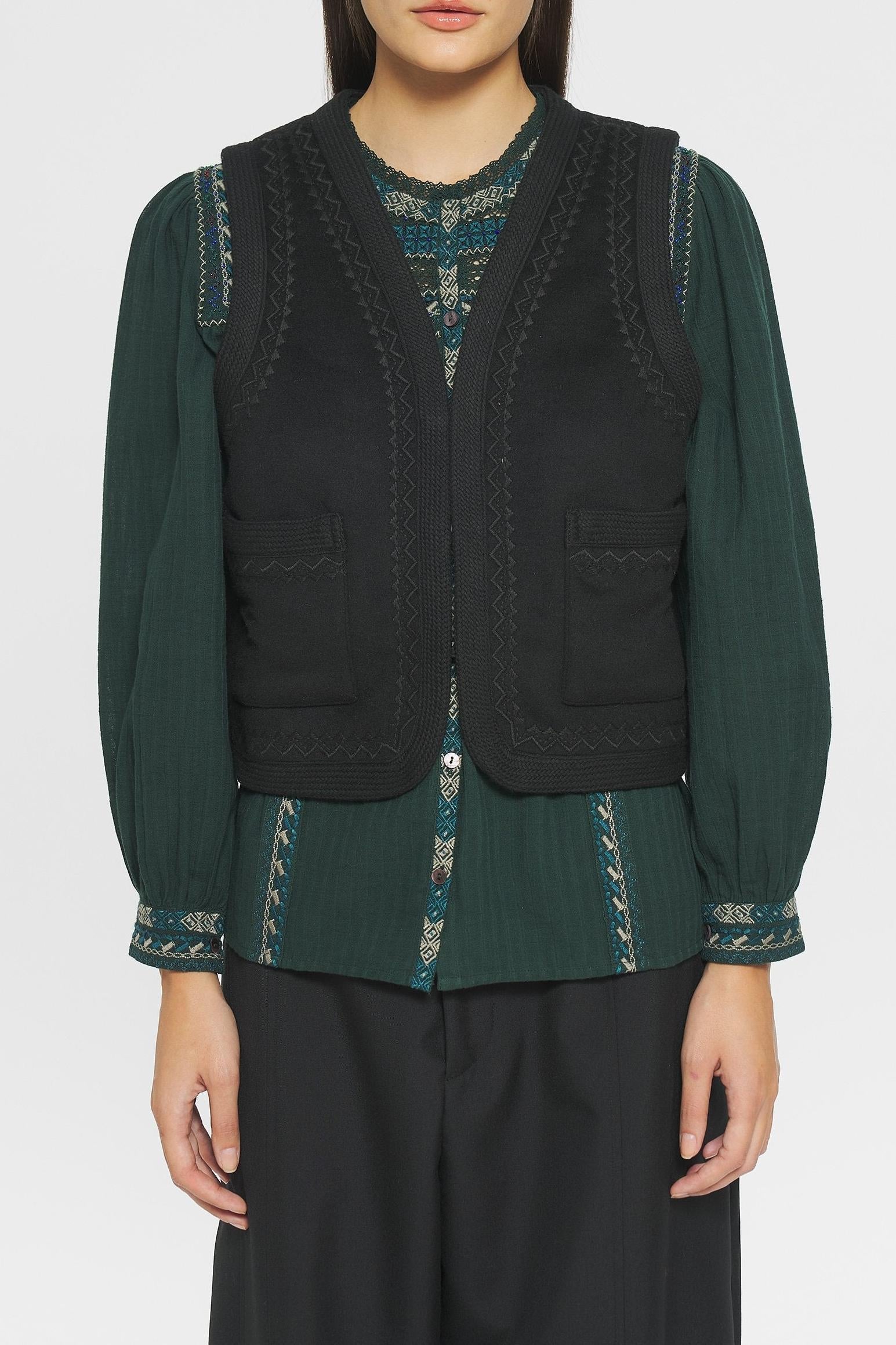 Chaleco de lana sin mangas. Detalles bordados a mano. Dos bolsillos laterales en la parte delantera. Puños bordados con trenzas de algodón en escote, hombros y bolsillos. Forro de algodón.