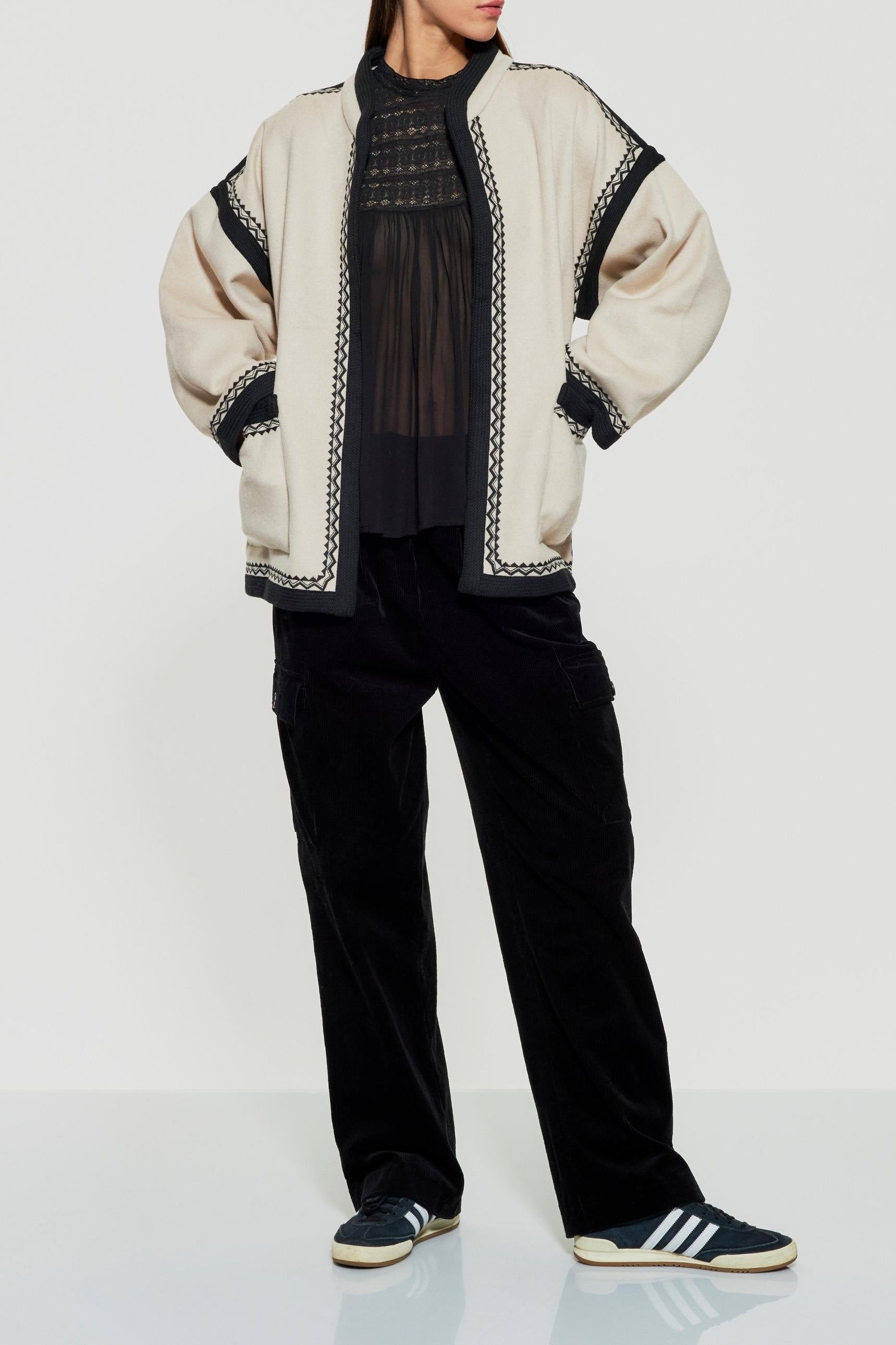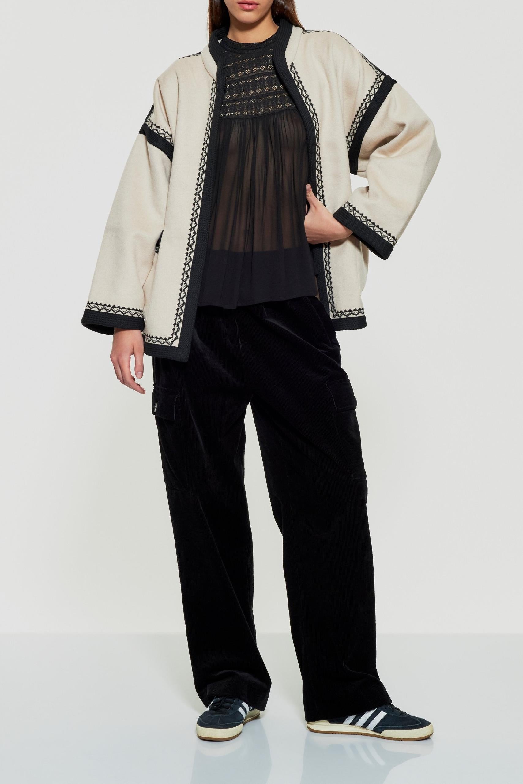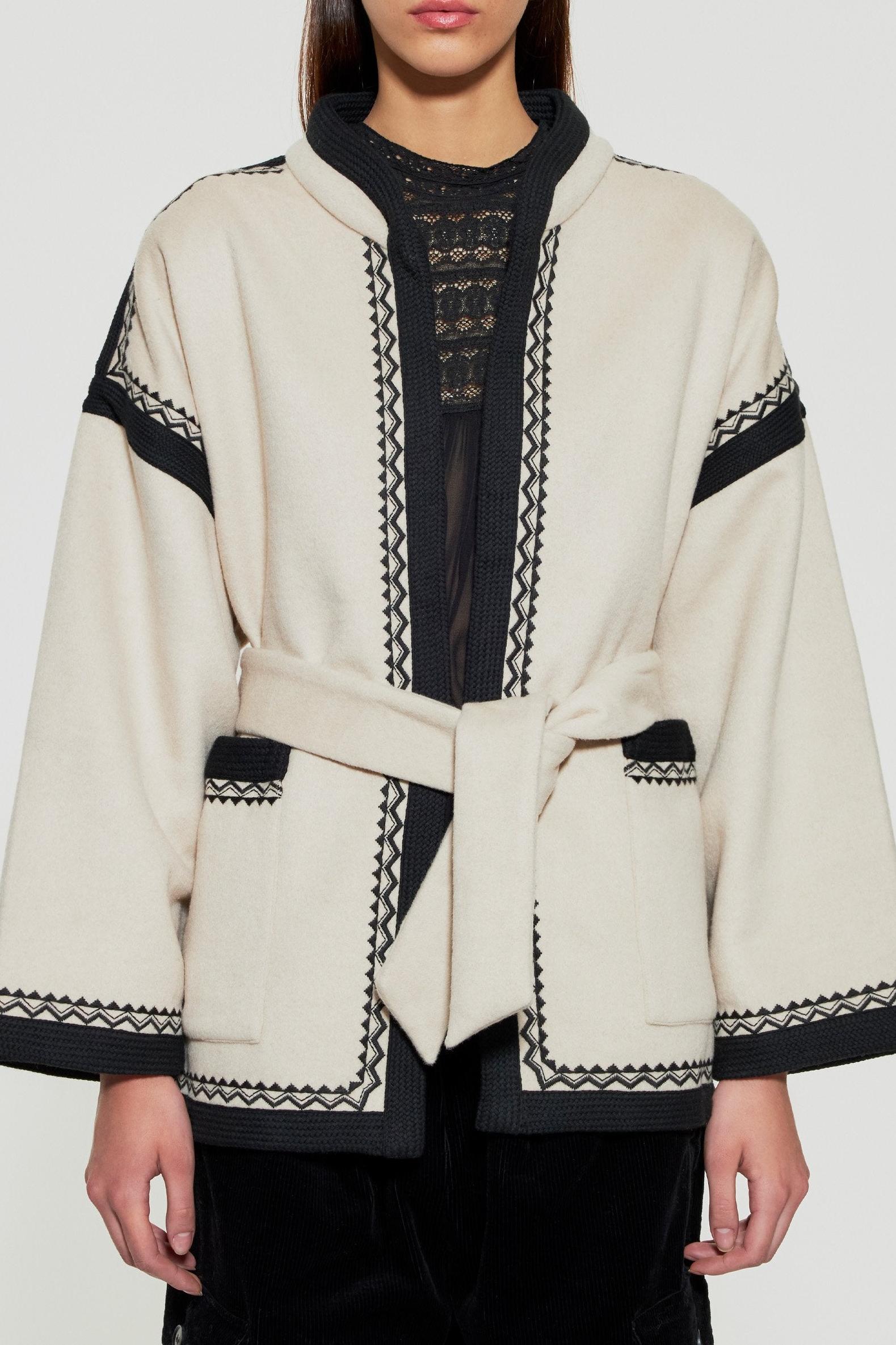 Chaqueta bordada en mezcla de lana. Dos bolsillos en la parte delantera. Cinturón desmontable. Bordados y trenzas en escote, hombros y bolsillos.