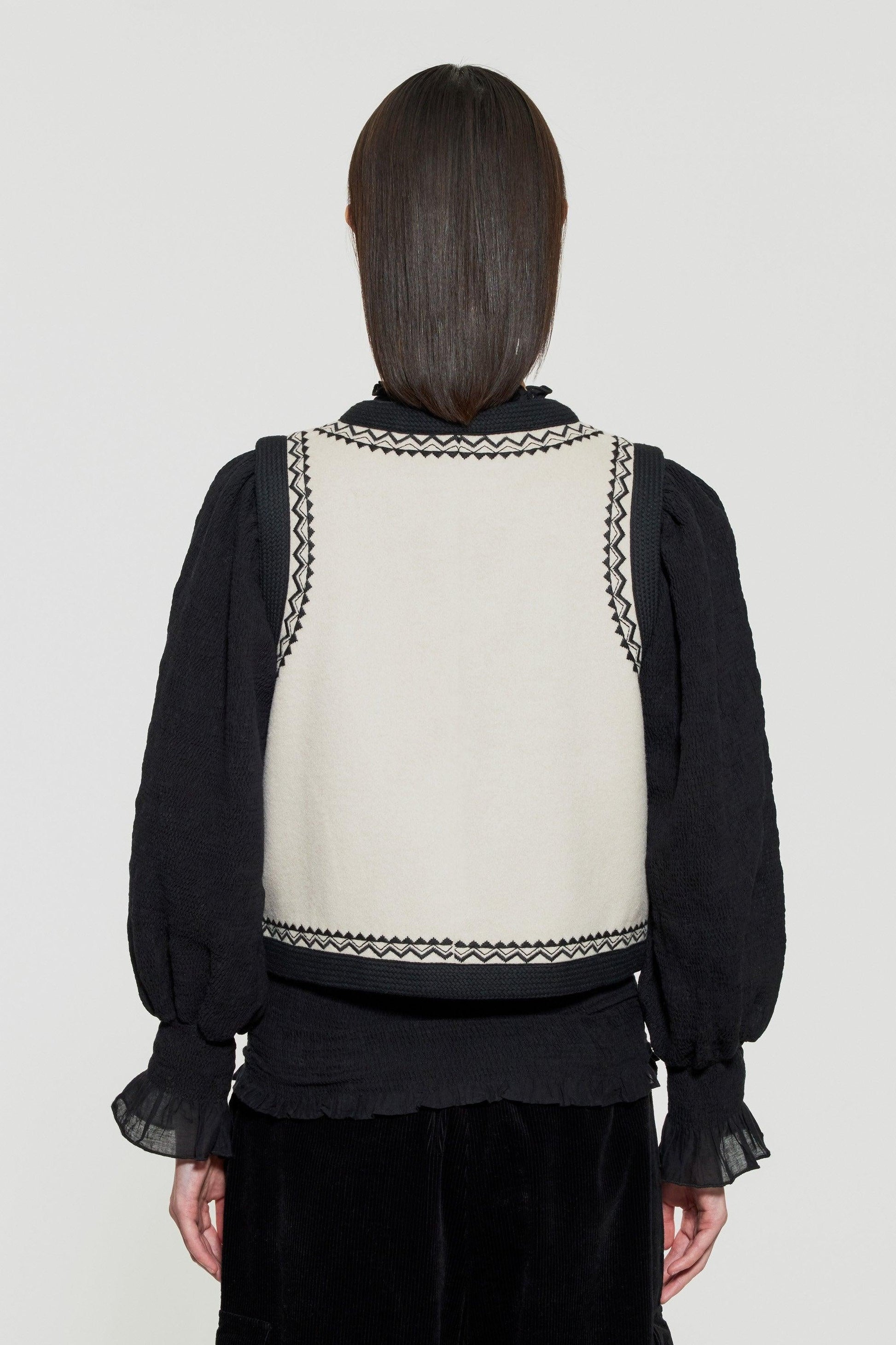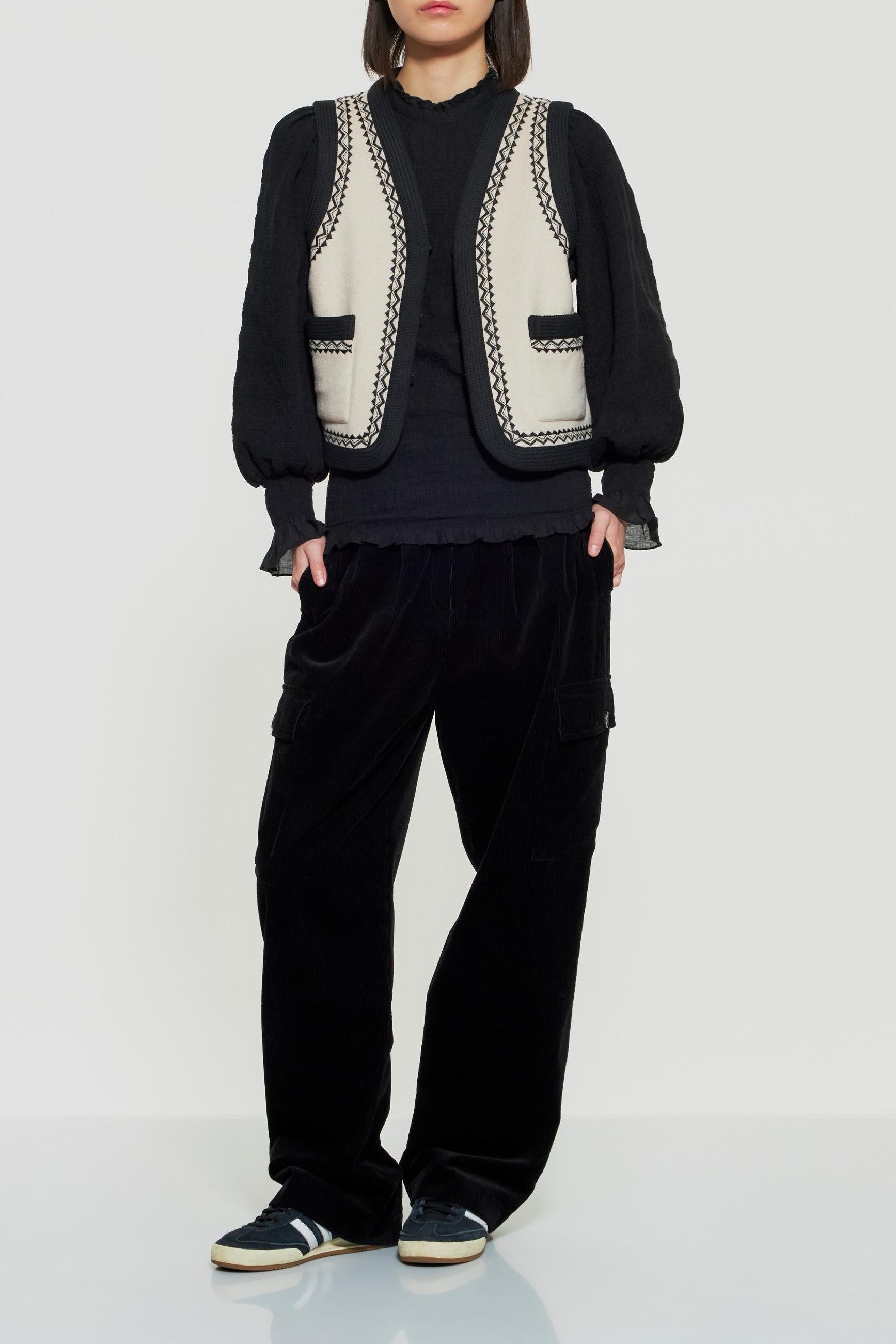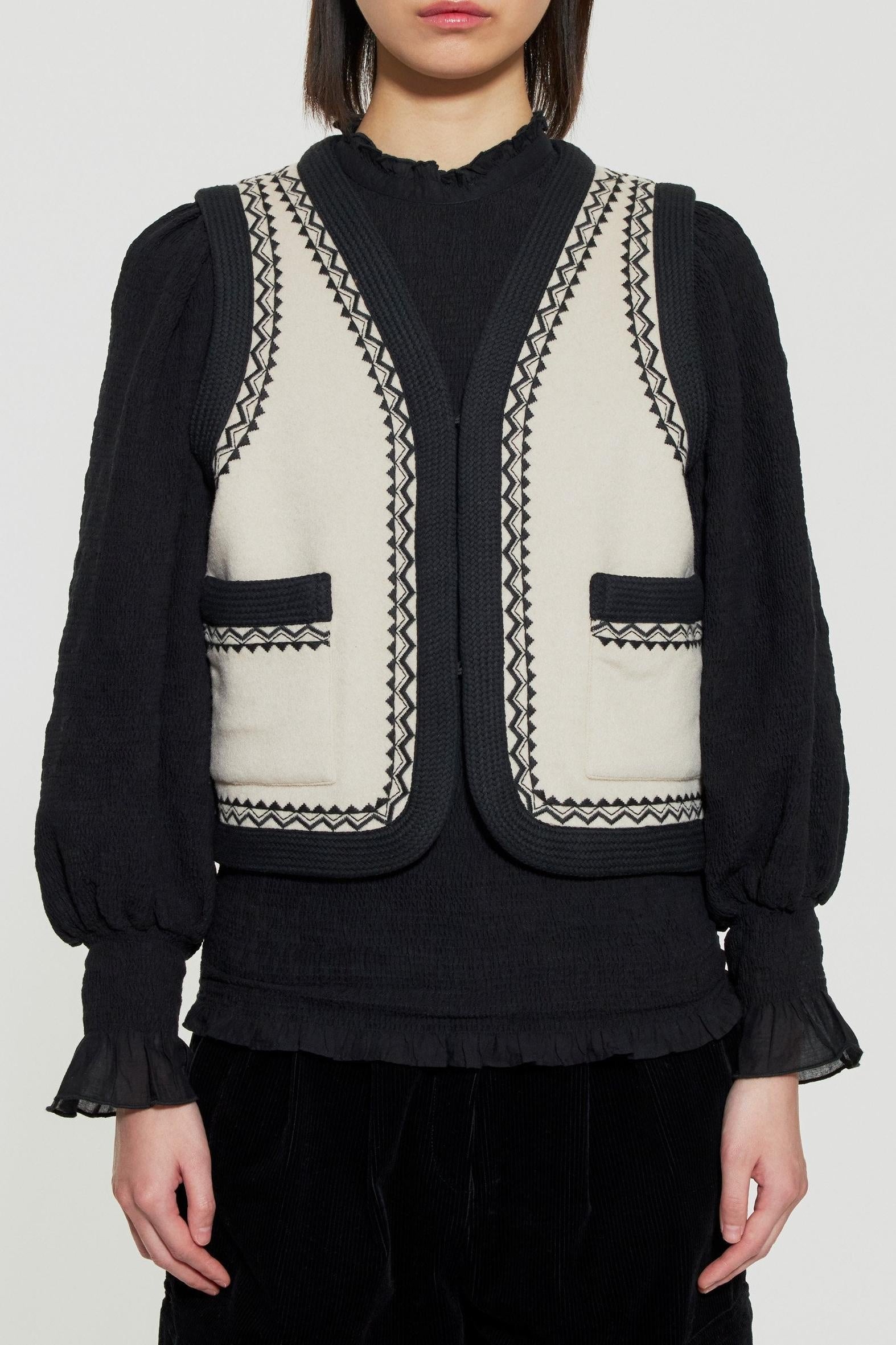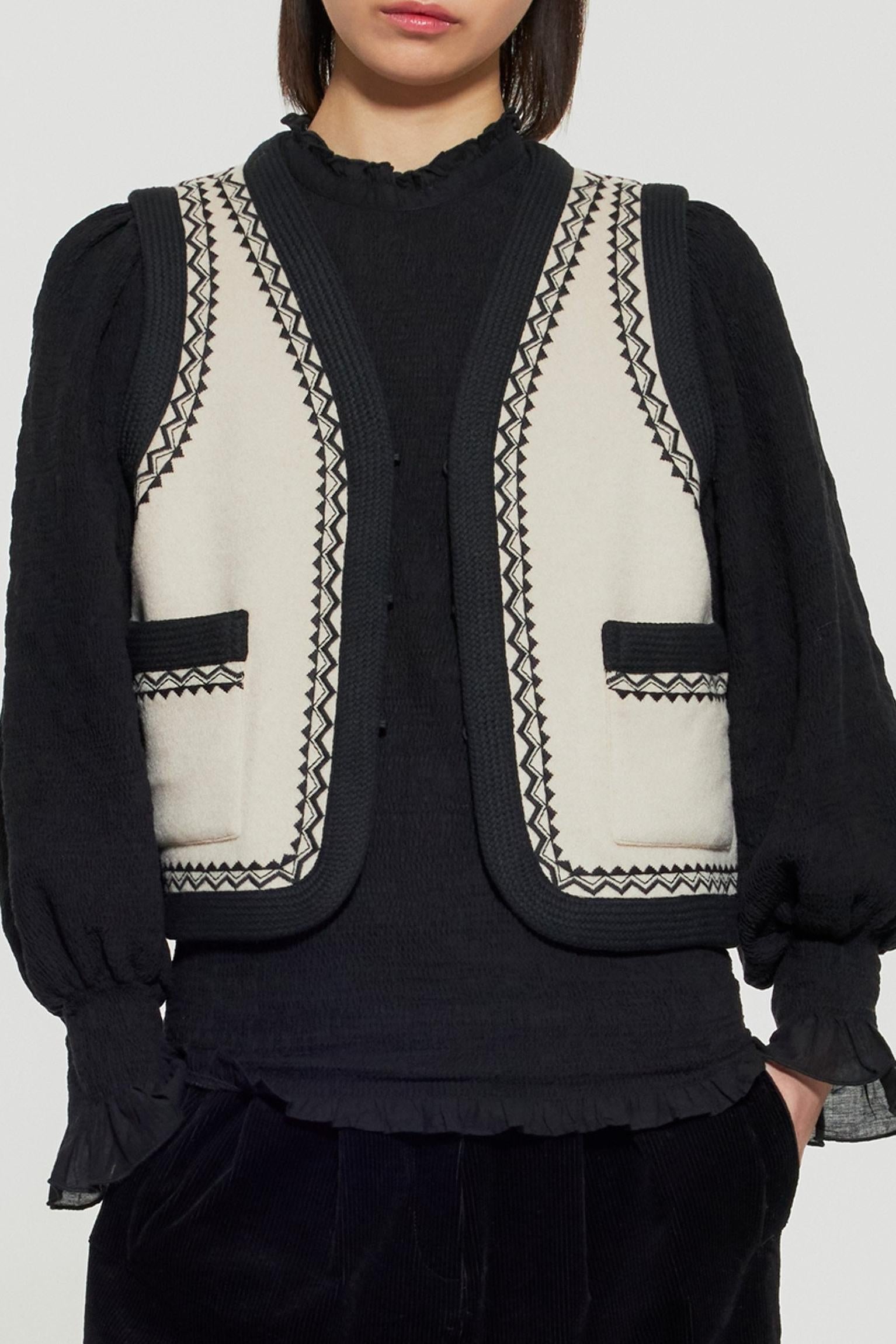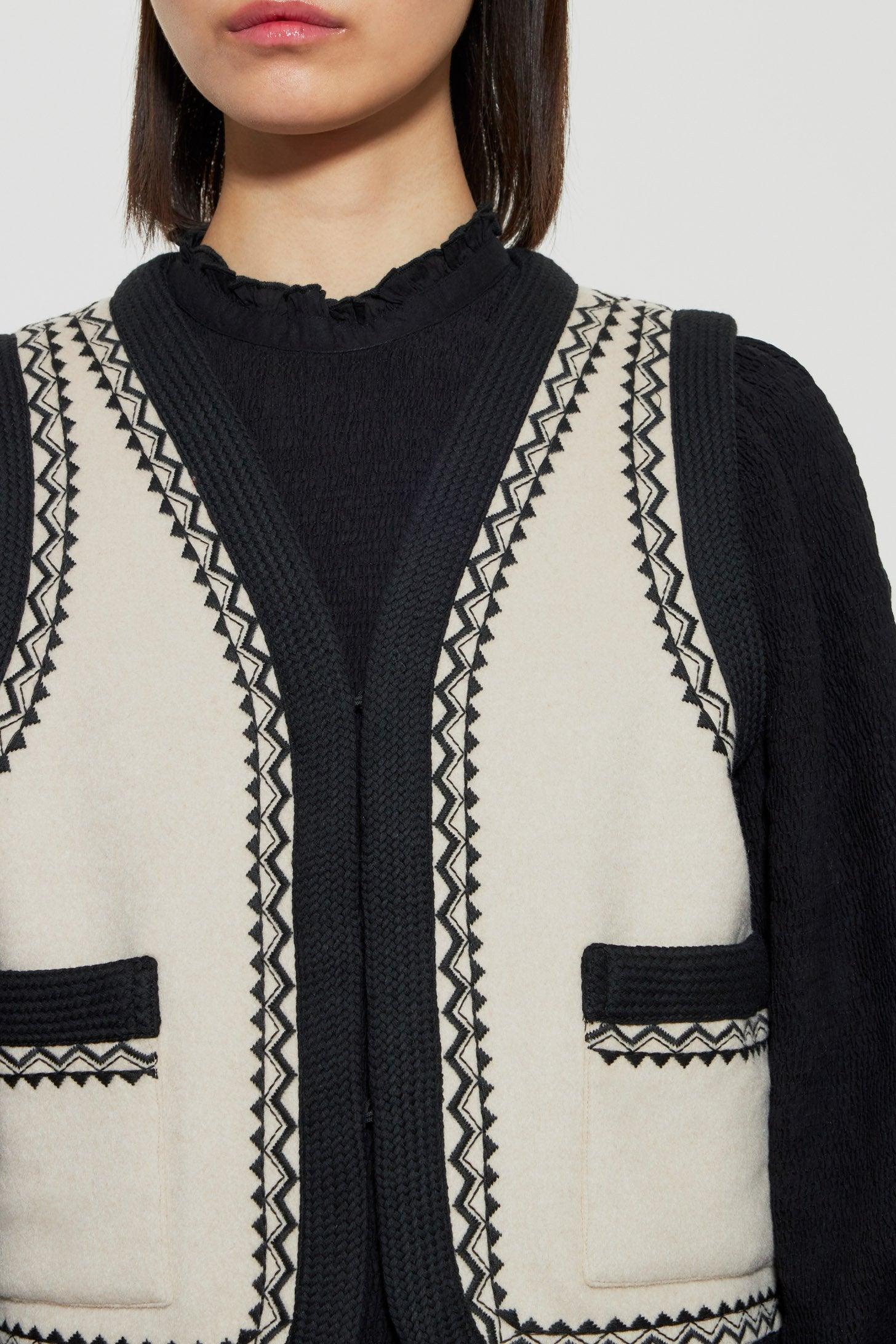 Chaleco sin mangas bordado en mezcla de lana. Dos bolsillos laterales. Bordados y trenzas en escote, hombros y bolsillos.