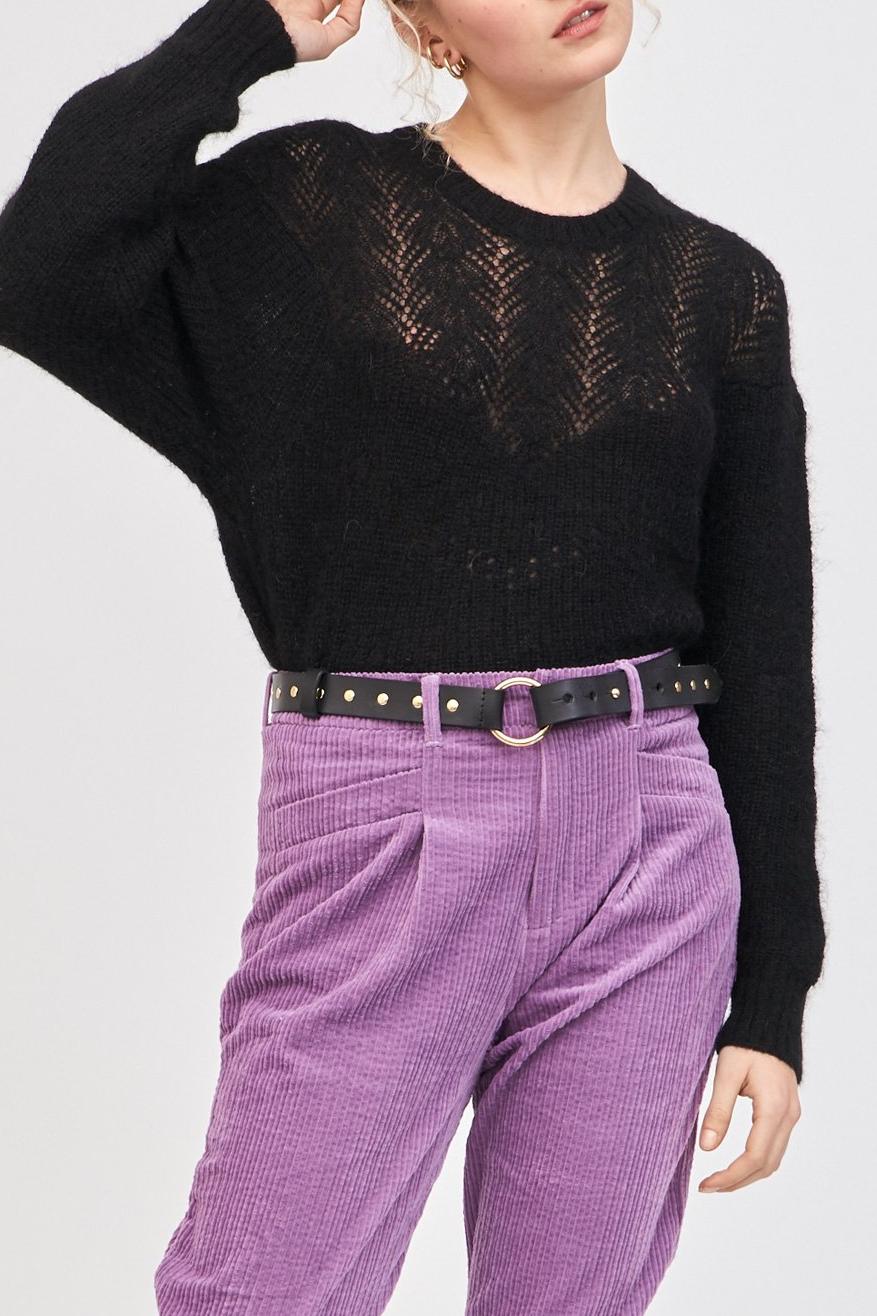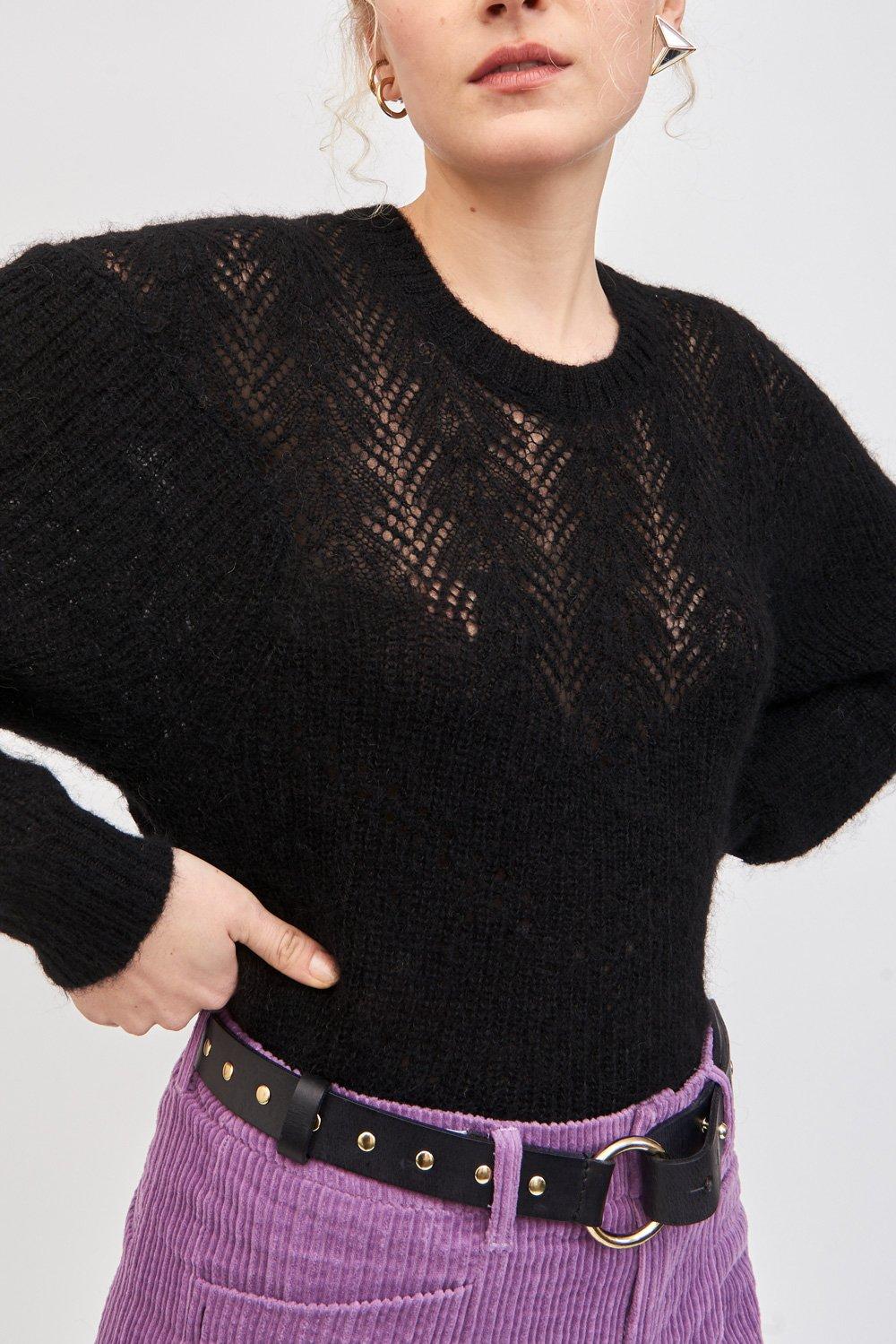 Suéter mezcla de mohair en color negro. Punto calado en hombros y escote. Mangas largas. Puños y cuello acanalados. La modelo mide 178 cm y lleva una talla 38 (S). El suéter mide 65 cm de largo en la talla 38 (S).