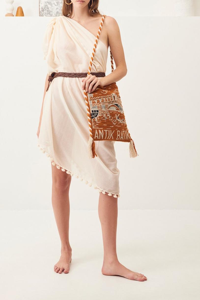 Cream-coloured cotton pareo. The finishes are lined with tone-on-tone pompoms. Also available in blue, fuchsia and khaki versions. This large stole can be tied around the waist or worn as a beach dress.