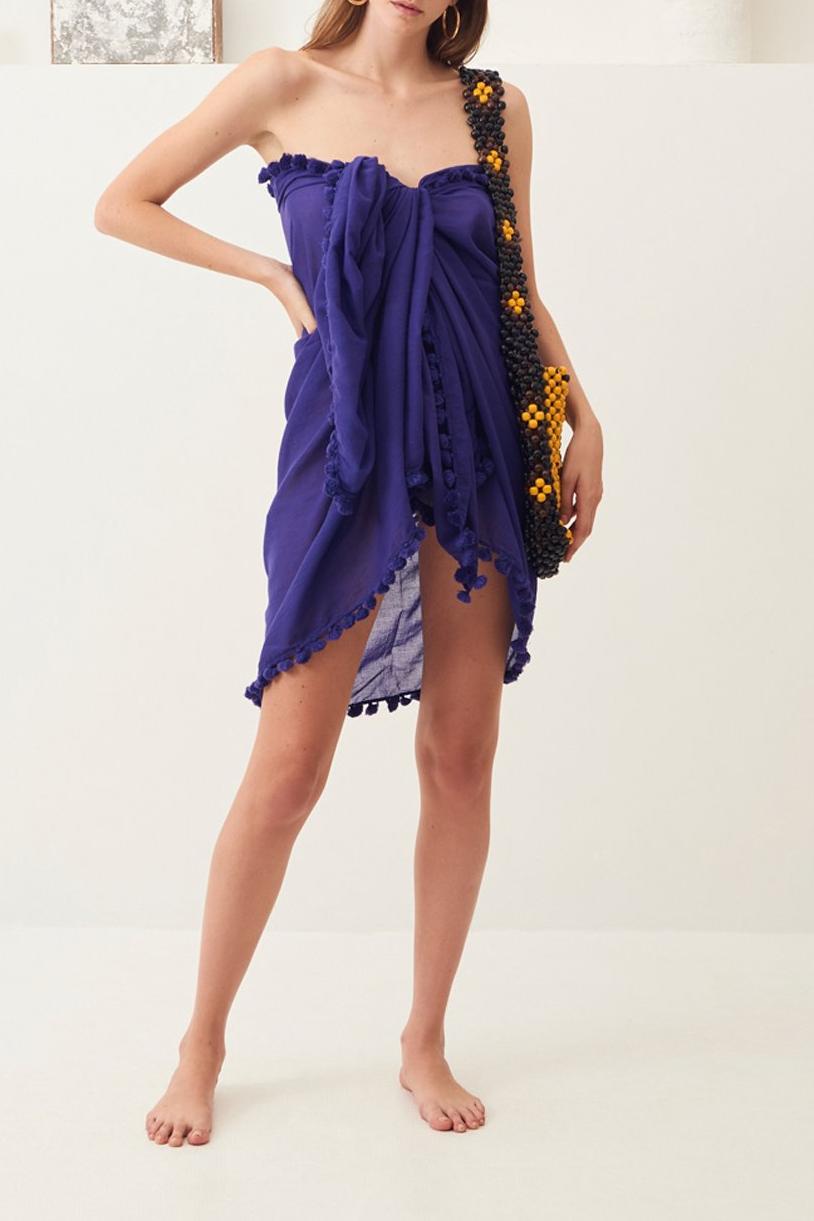 Indigo cotton pareo. The finishes are lined with tone-on-tone pompoms. Also available in cream, fuchsia and khaki versions. This large stole can be tied around the waist or worn as a beach dress. Length: 200 cm x Width: 105 cm