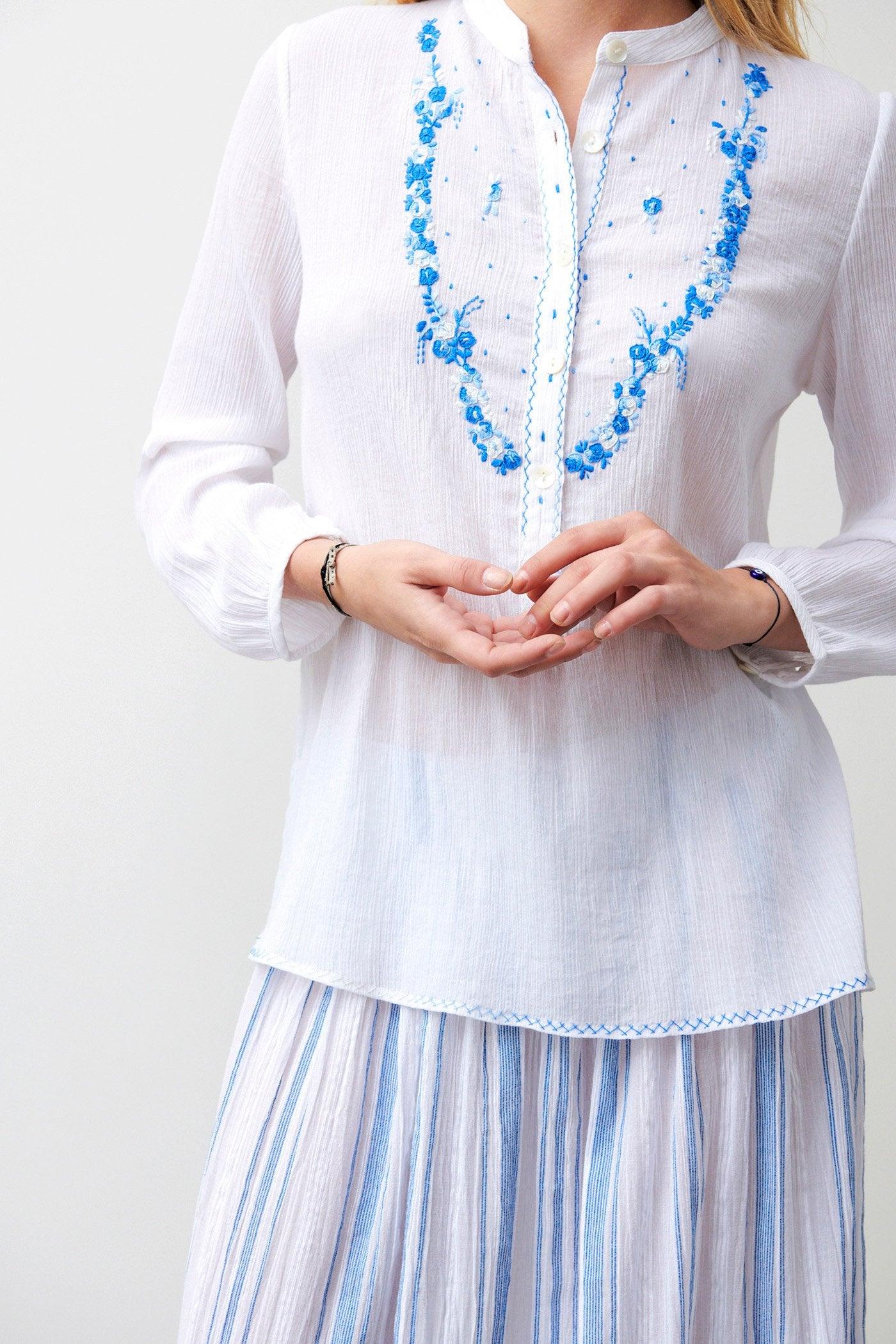 Light and flowing white cotton veil shirt. Floral-frieze embroidered collar. Button placket with blue-thread overstitching and natural mother-of-pearl buttons. Long sleeves tightened at the cuffs. The embroidery thread creates a gradient in shades of blue. A romantic boho style. The Albane White Shirt is in cotton crepe. This is a unique handmade piece that should require hand washing at cold temperature or dry washing.