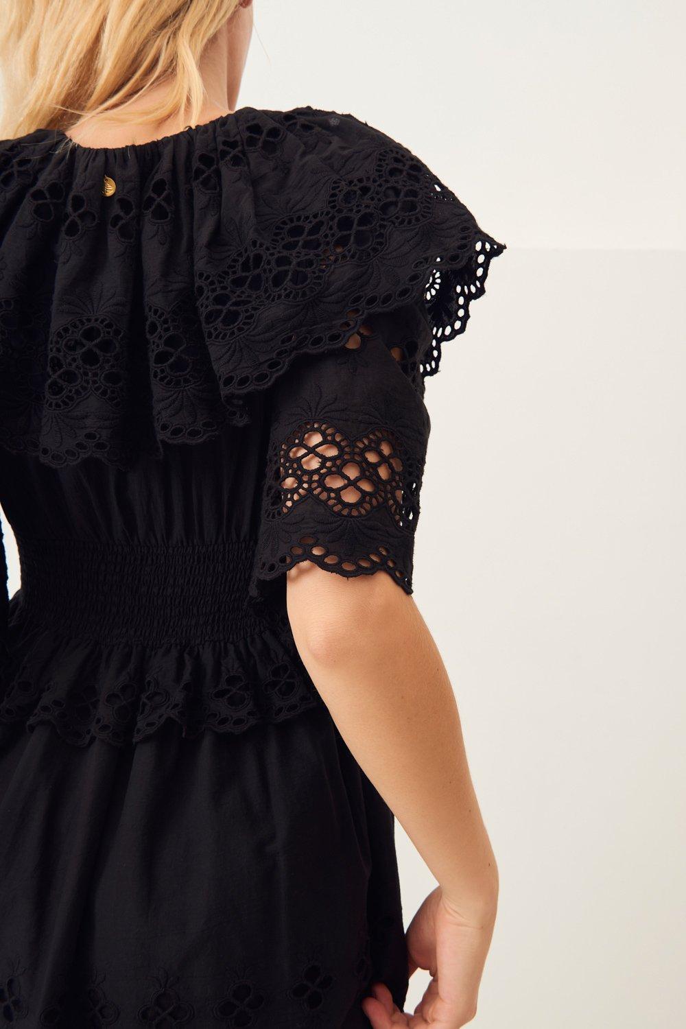 Midi dress in black English embroidery. Ruffled V-neck. Flared 3/4-length sleeves with openwork. Cinched at the waist by an elastic hem. Flared towards the bottom. This charming piece will be perfect for special occasions, especially when paired with our Ishaan macramé bag. Also available in white. The dress is fully lined.