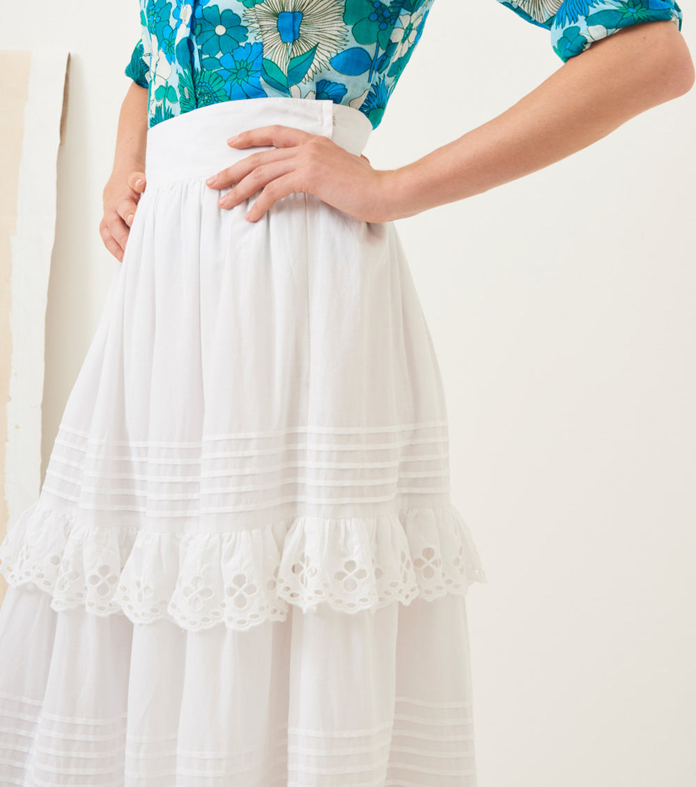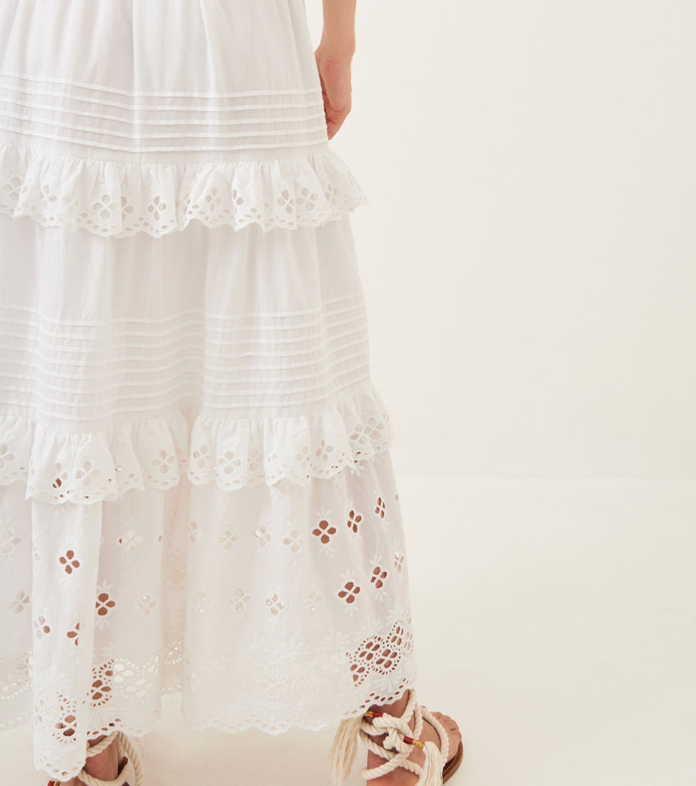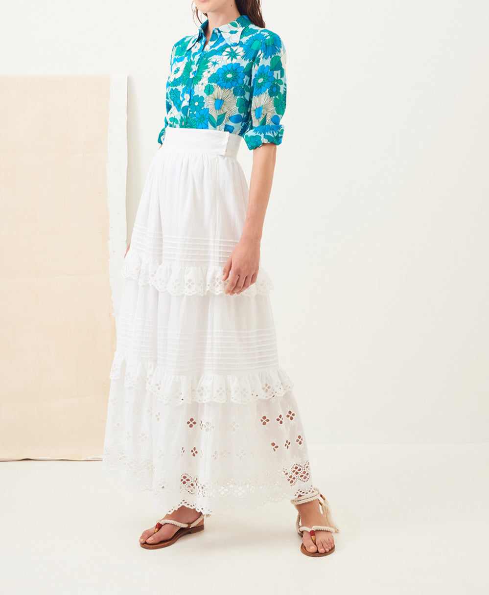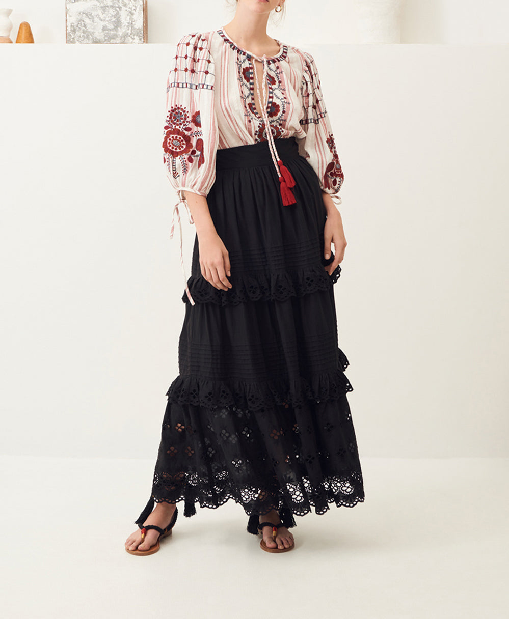 Maxi jupe fluide en broderie anglaise noire. Fermeture zippée sur le côté. Existe aussi en blanc. Associez notre jupe longue Ally à la blouse noir Ally pour un look résolument bohème. Existe en blanc. La jupe est doublée.100% COTON SCHIFFLI. Cette pièce unique a été confectionnée de manière artisanale. Nos pièces sont délicates et requièrent un lavage à la main à température froide ou un lavage à sec.