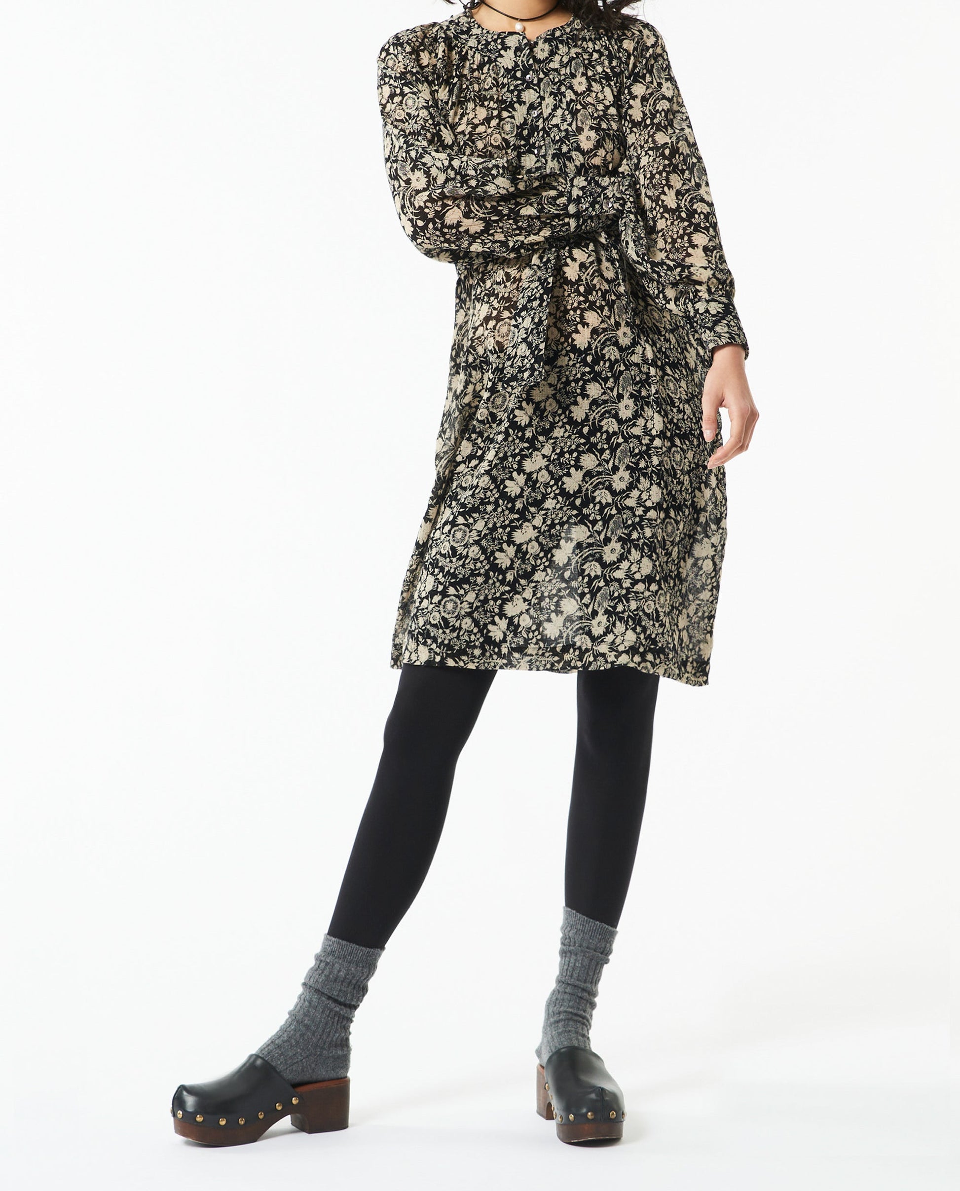 Robe à imprimé fleuri noir. Patte de boutonnage et manches fermées avec des boutons en nacre véritable. Livré avec ceinture amovible et fond de robe 100% Coton