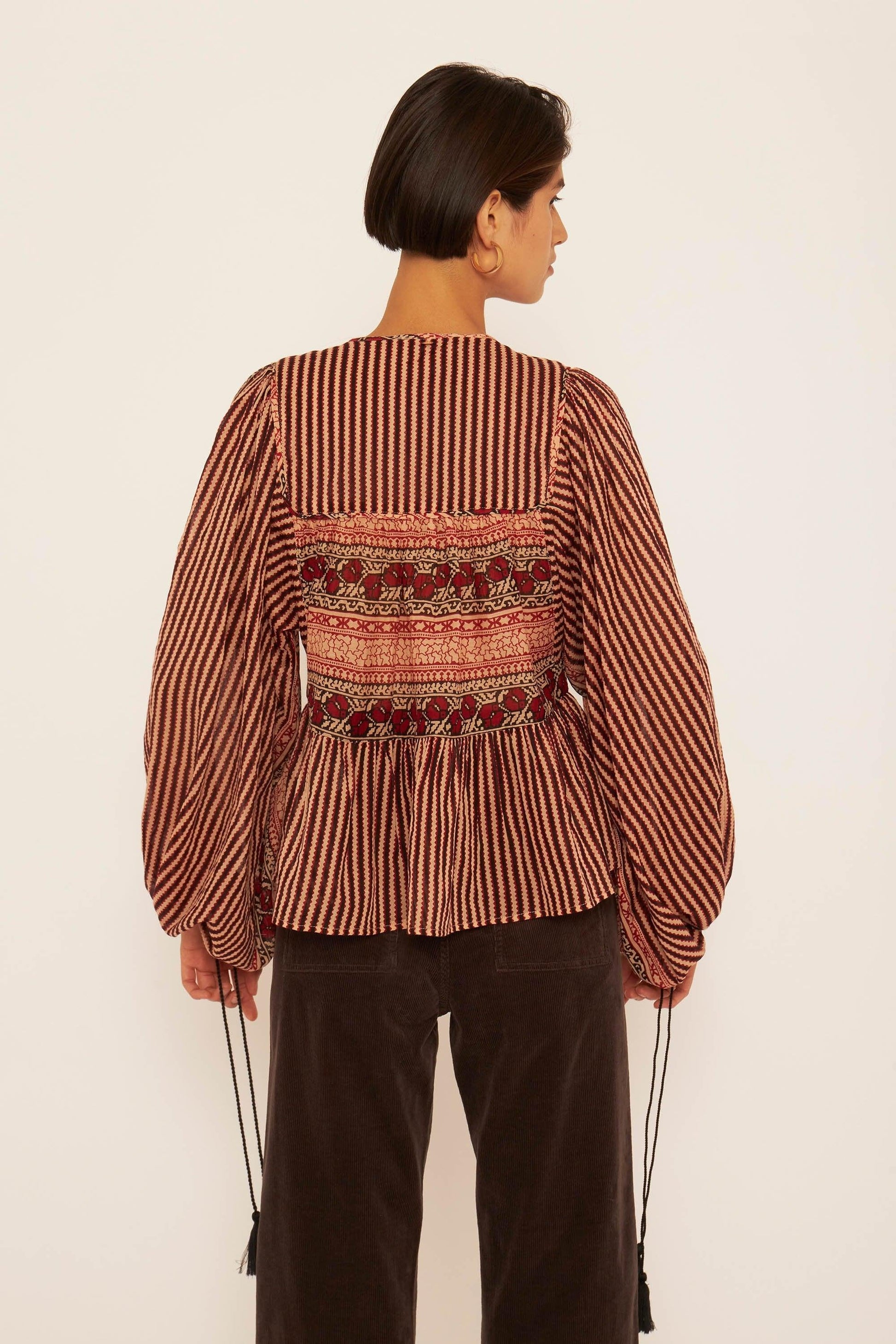 Cotton voile fluid blouse. Print designed in our Parisian studio then hand-applied to the fabric using a block printing technique (Indian artisan technique). Round neckline. Puff sleeves. Ties at the neck and wrists. Pompoms made by hand.