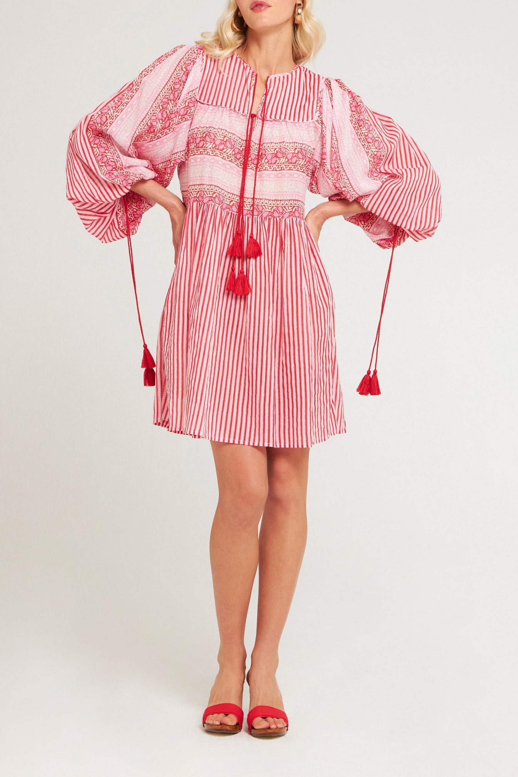 Cotton voile fluid mini dress. Print designed in our Parisian studio and then hand-applied onto the fabric using a block printing technique (Indian artisan technique). Round neckline. Gathered at the shoulders and waist. Balloon sleeves. Ties at collar and wrists. Handmade pompoms. Dare to go sheer - or not - thanks to the slip dress which comes with the piece.