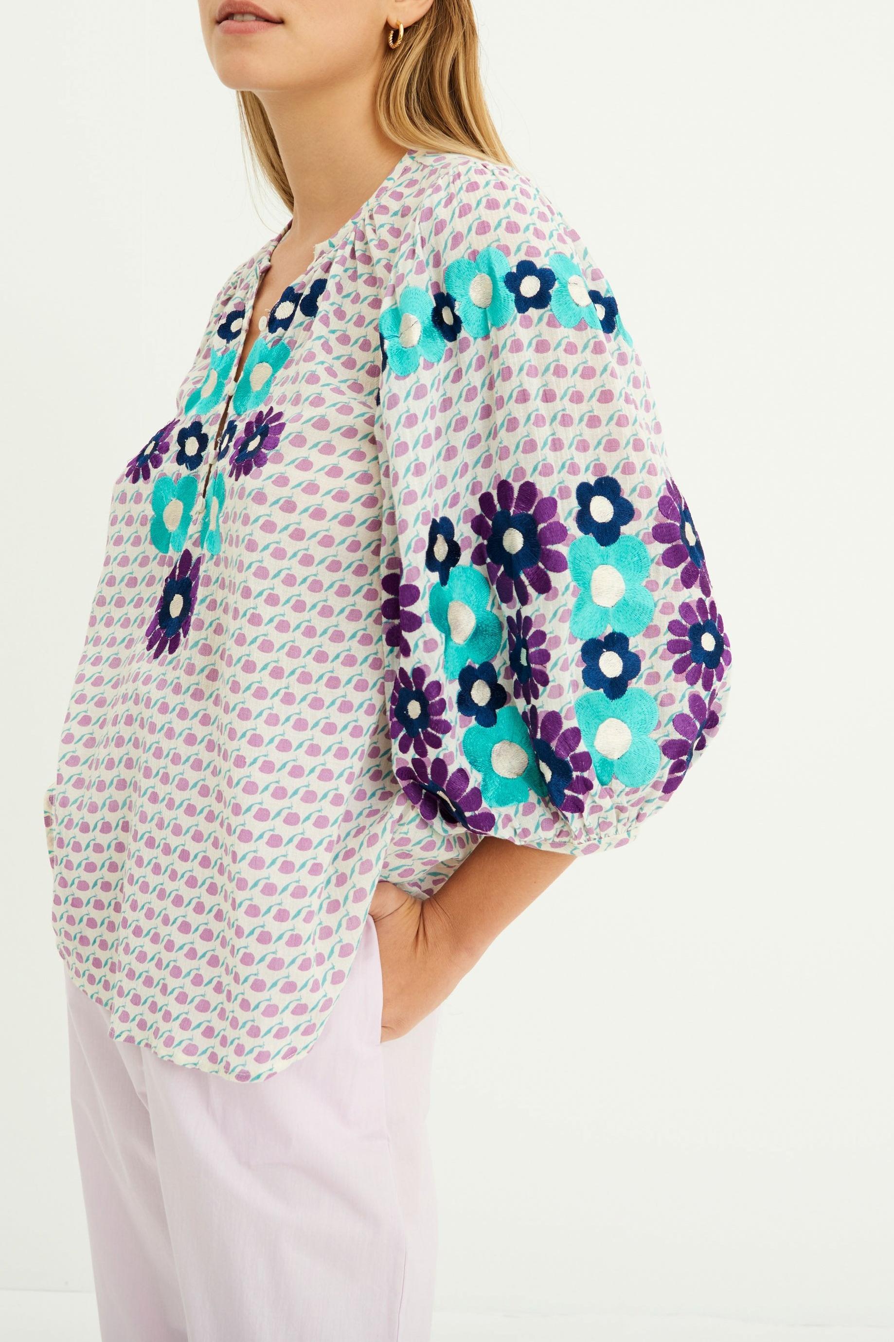 Parma and turquoise cotton crepe blouse. All-over Batik print. Floral embroidery on breastplate and sleeves. 3/4-length puff sleeves. Placket with natural mother-of-pearl buttons. 100% cotton