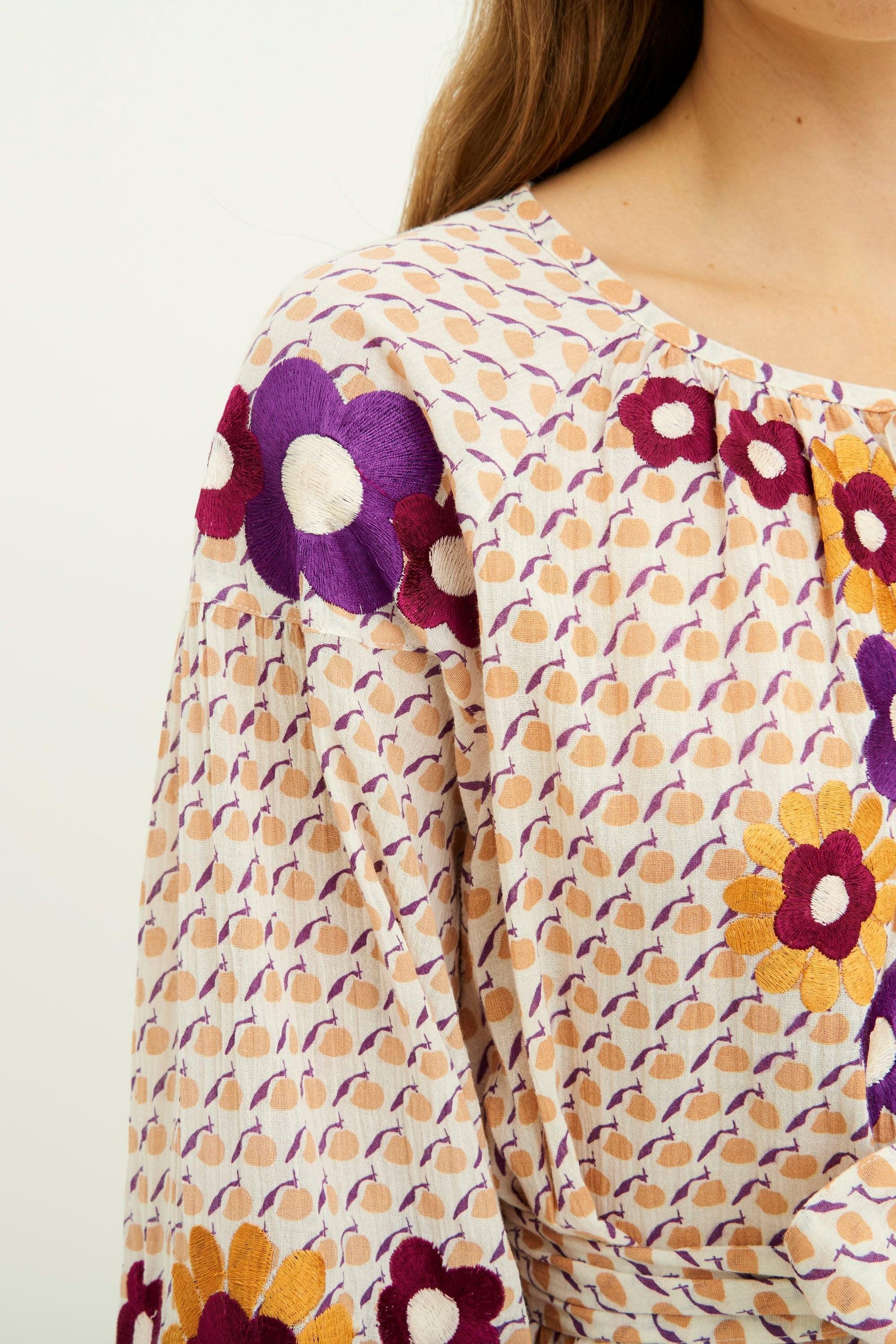 Peach-coloured cotton crepe maxi dress. All-over Batik print. Floral embroidery on the chest, sleeves and at the hem. 3/4-length puff sleeves with tie closure. Round neck, V-opening with double-tie closure. The Apoline dress comes with its own tone-on-tone belt. The dress is lined.
