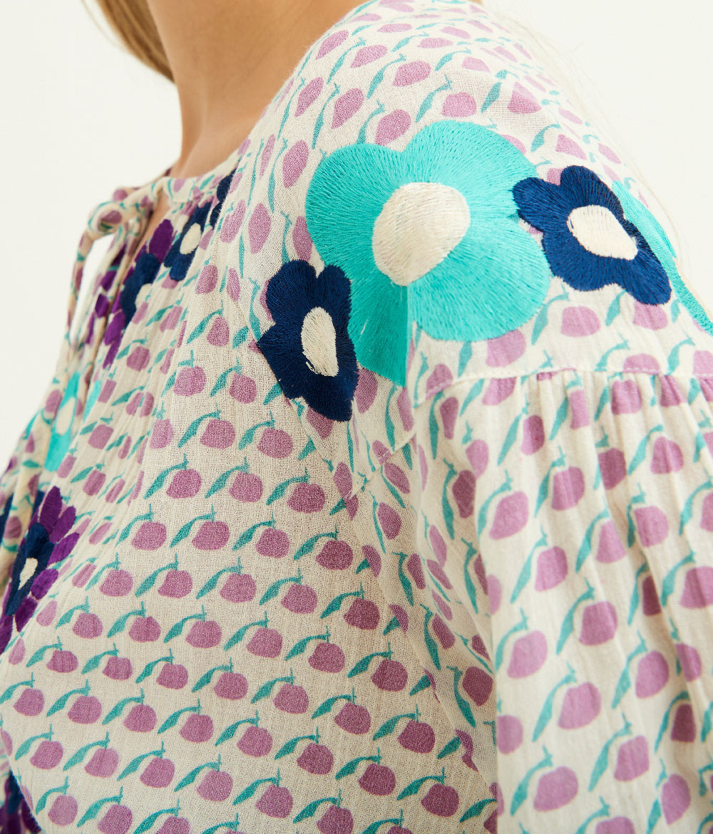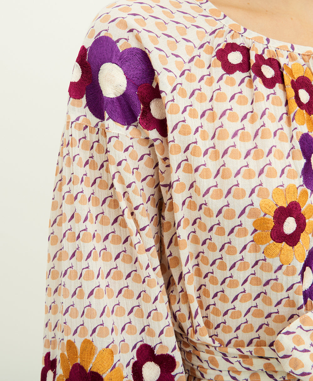 Robe longue coloris pêche en crêpe de coton. Impression au batik sur l'ensemble. Broderies florales sur le plastron, les manches et le bas. Manches bouffantes 3/4 fermées par un lien. Col rond, ouverture V fermée par deux liens. La robe Apoline est livrée avec un fond de robe et sa ceinture ton sur ton.