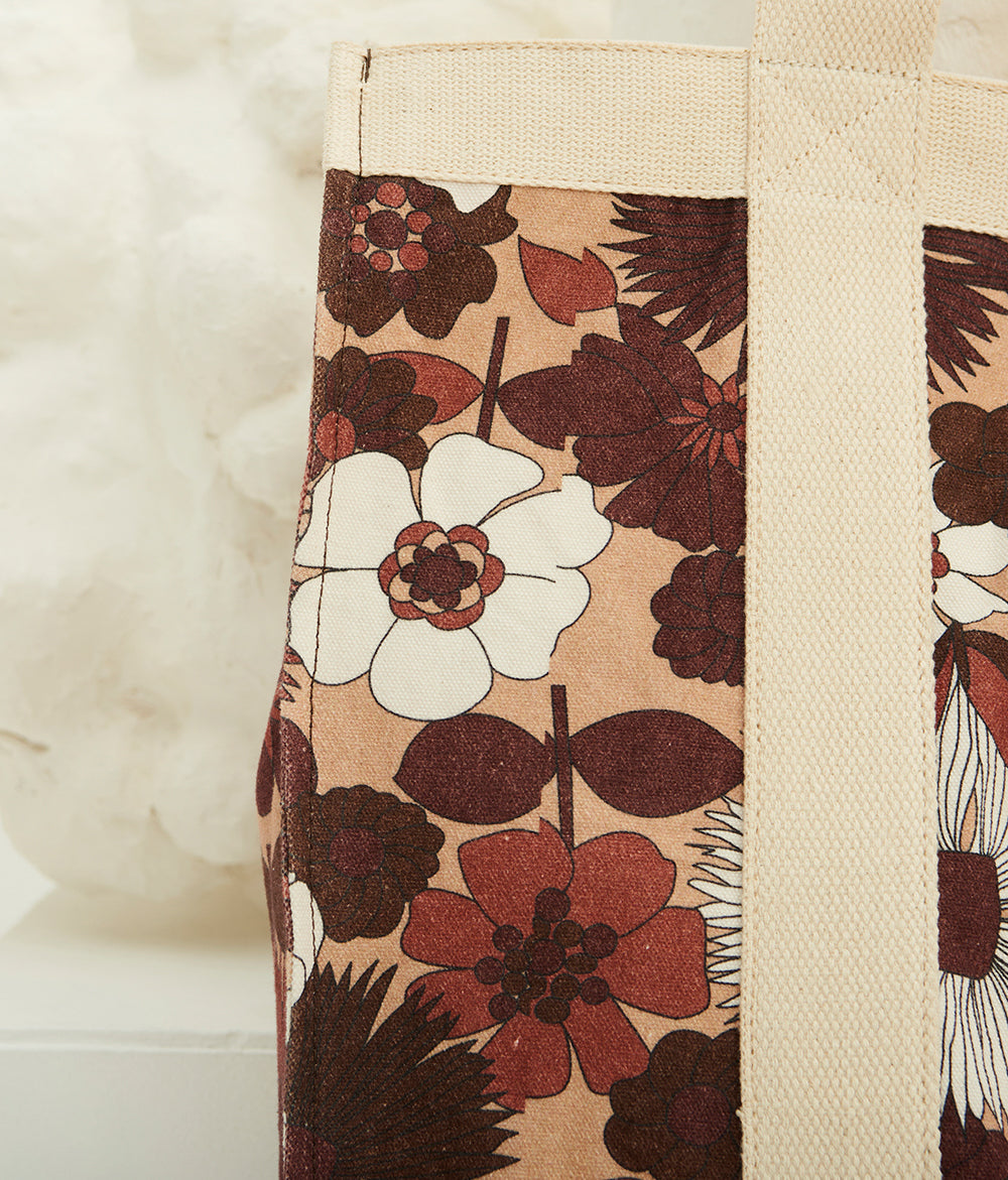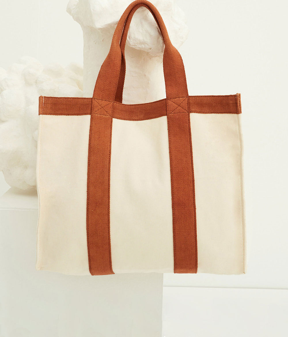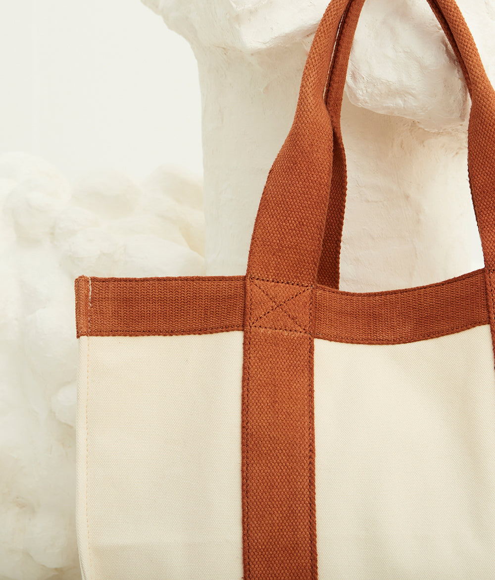 Cabas en toile crème et marron. Fermeture à bouton pression. Volume généreux pour ce cabas réalisé dans une toile canvas épaisse et résistant.