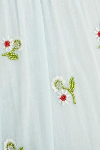 Sky blue cropped cotton top. Small, all-over floral embroidery in green and white seeds beads. Crossover snap closure on the front. Plunging neckline. White bead-embroidered border on the collar. 3/4 sleeves with snap button closure. Cotton inner lining.100% cotton