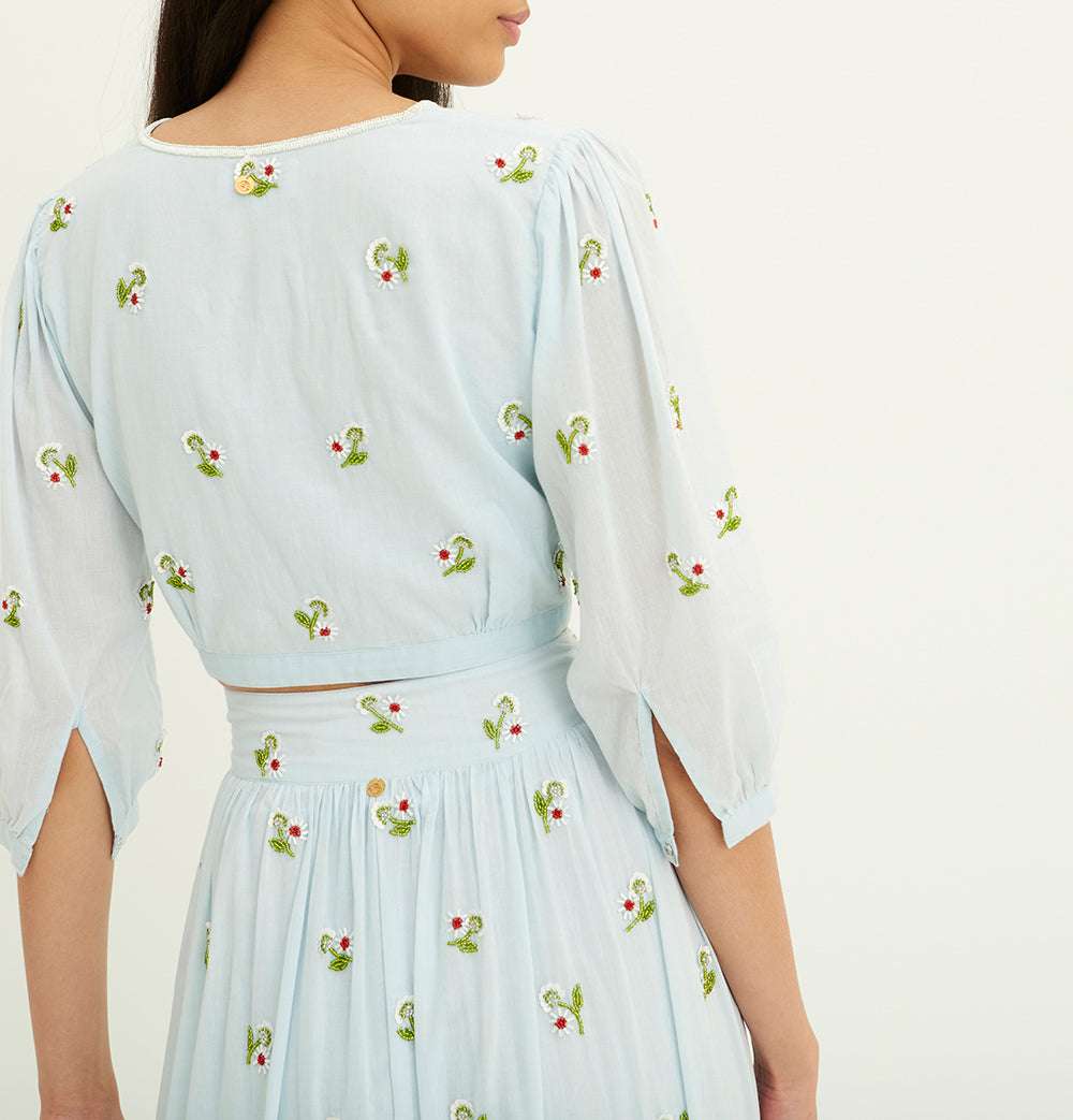 Haut court en coton bleu ciel. Petites broderies florales en perles de rocaille vertes et blanches sur l'ensemble. Fermeture pression croisée sur le devant. Décolleté plongeant. Liseré brodé de perles blanches sur le col. Manches 3/4 resserrées par un bouton pression. Doublure intérieure en coton.100% Coton
