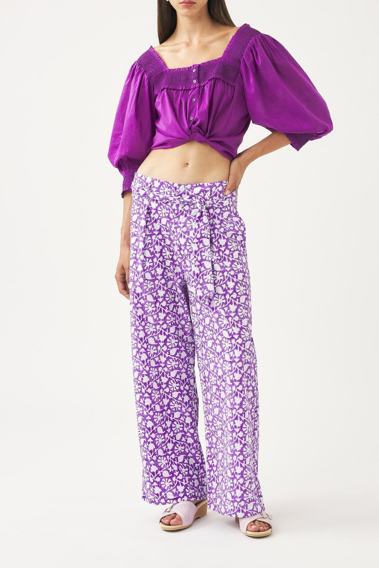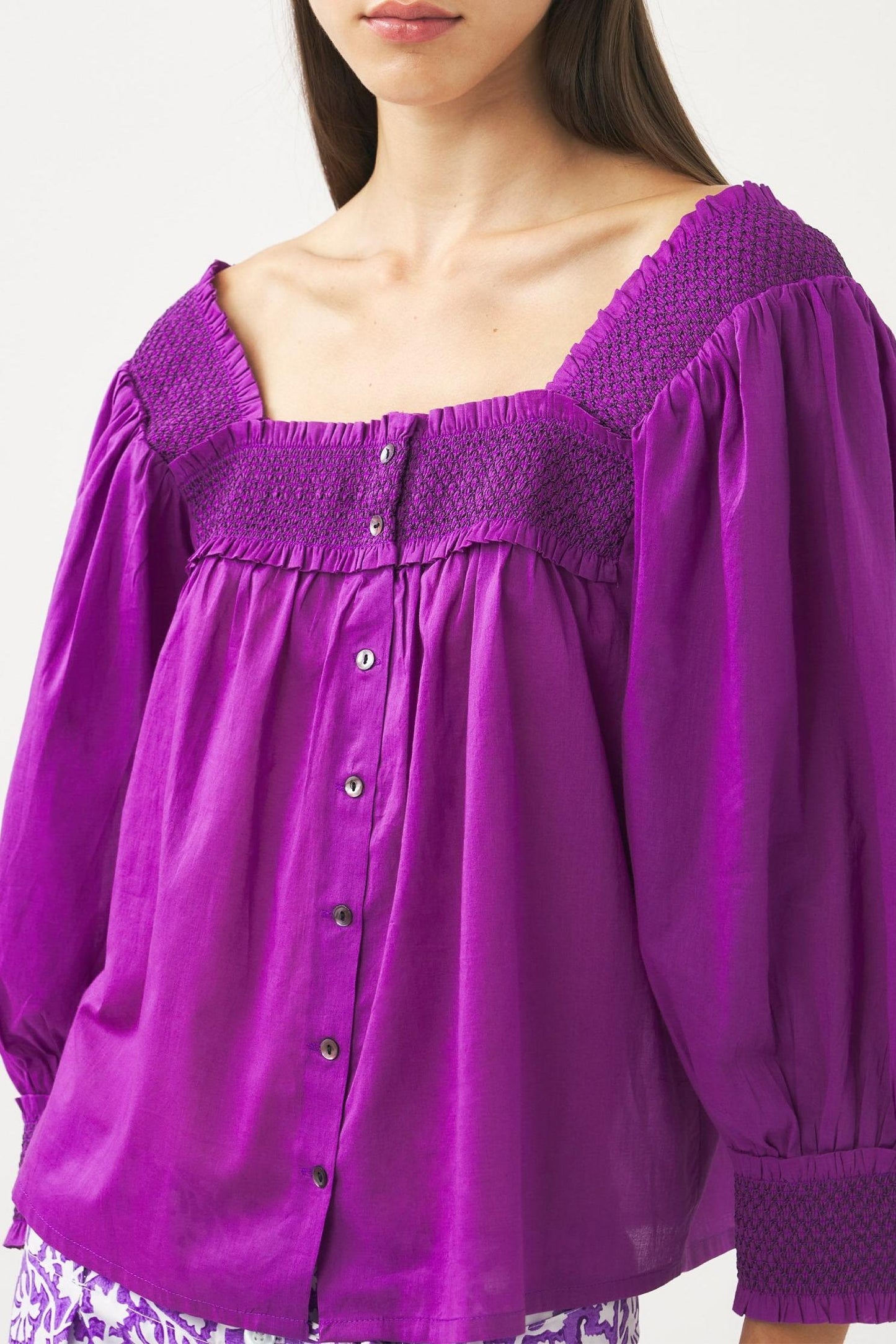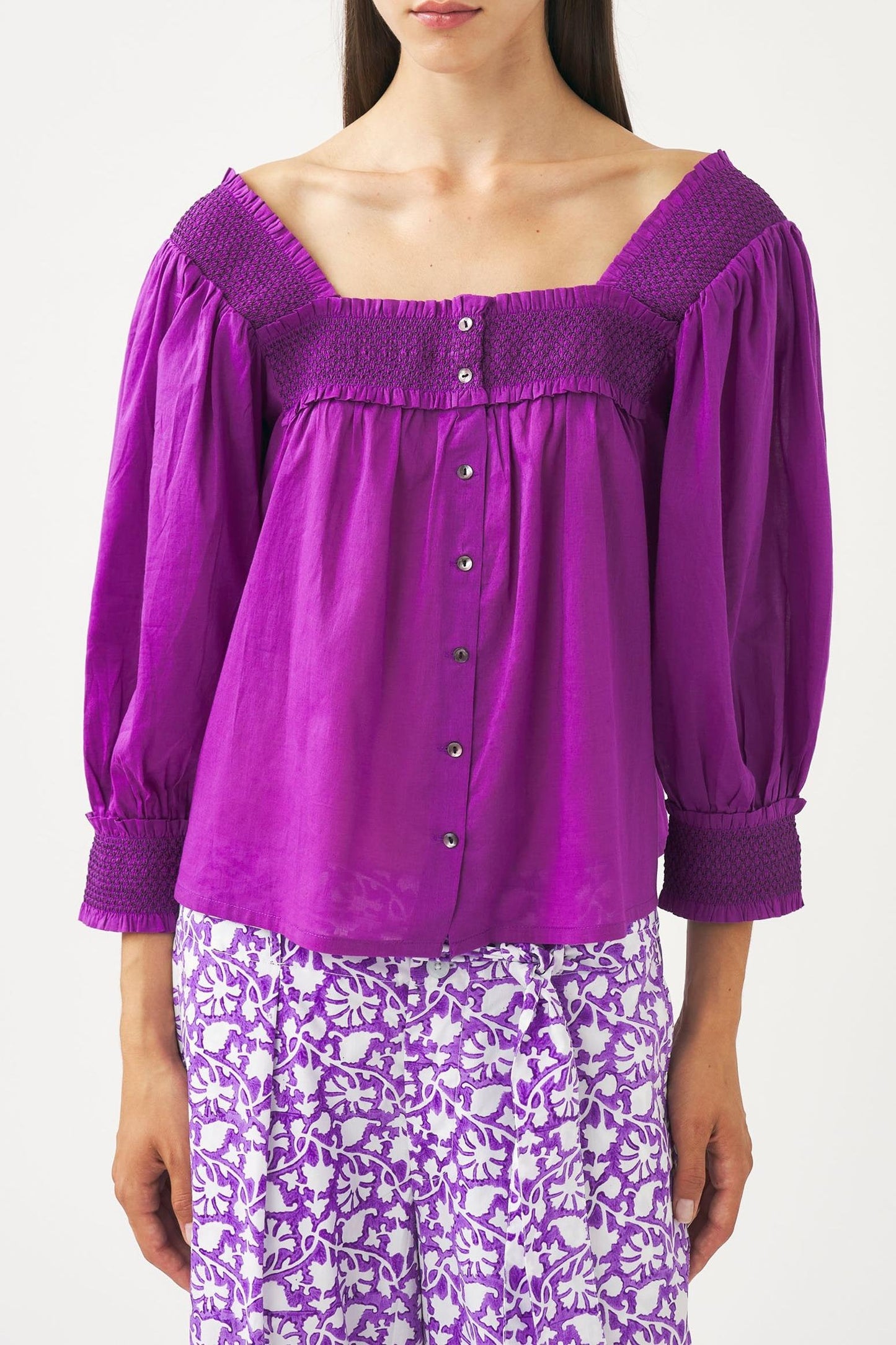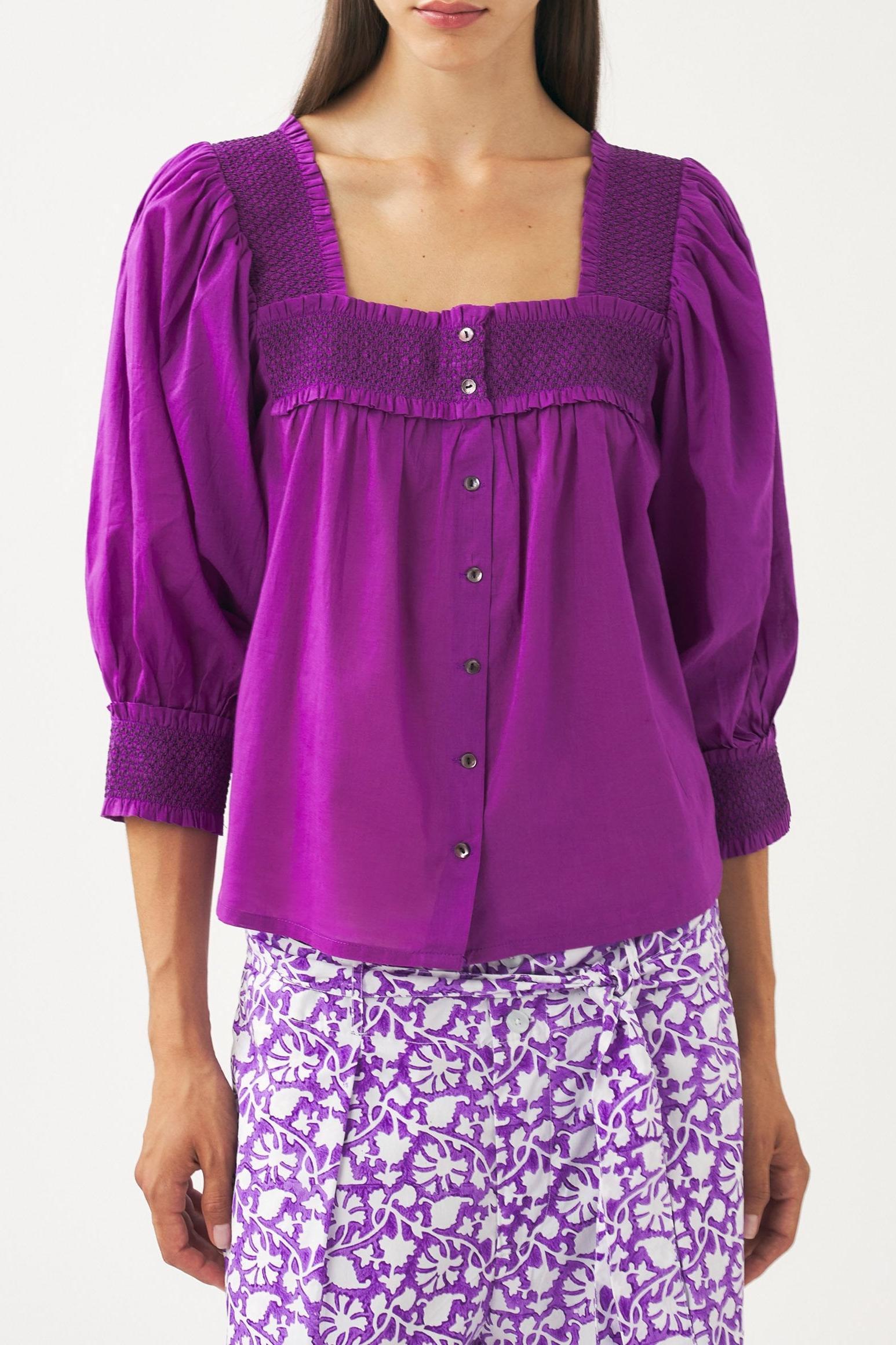 Blouse fluide en voile de coton. Encolure carrée et smockée à l'avant, à l'arrière et aux poignets. Manches bouffantes 3/4. Se ferme avec des boutons en nacre.