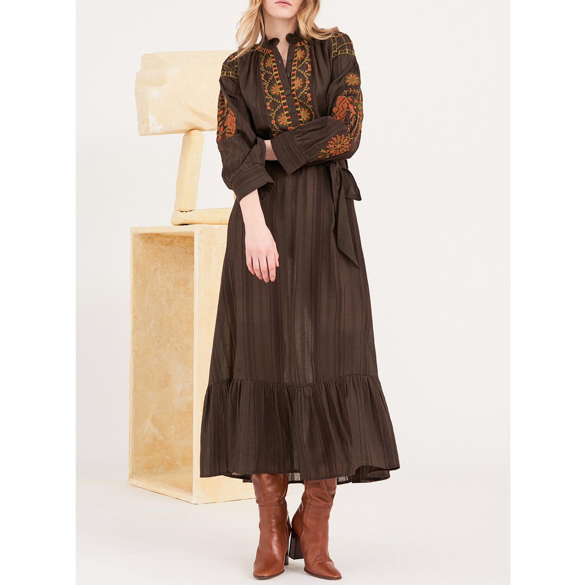 Brown maxi dress in striped cotton. Floral embroidery in orange and green tones. Ruffled collar. Adjustable neckline with tone-on-tone buttons. Loose sleeves tightened at the cuffs. All-over striped pattern. Ruched hem. Also available in black. The dress comes with its own cotton belt.