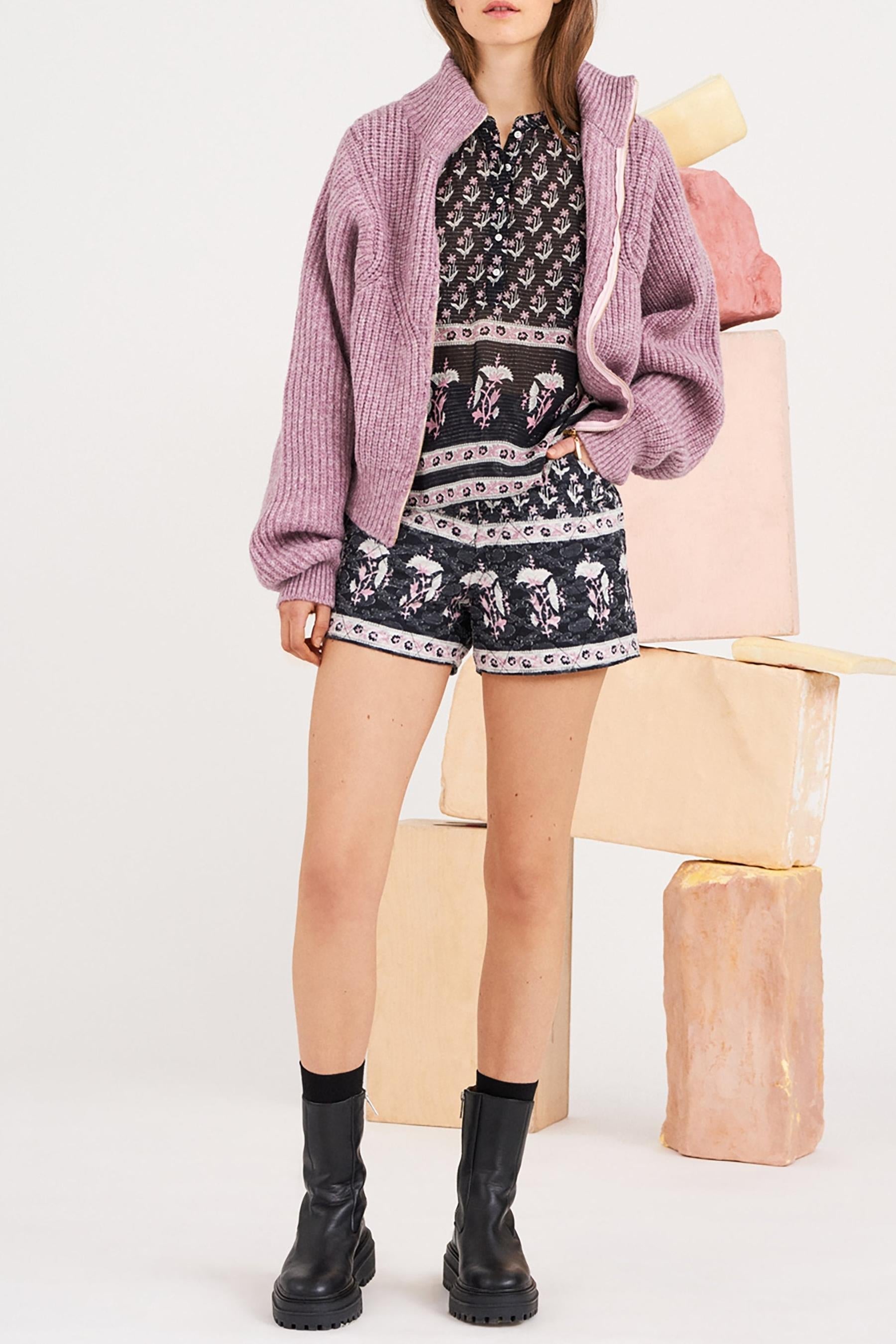 Lilac zipped sweater in merino and alpaca wool. Short cut fitted at the waist. Zip closure at the front. High collar. Loose sleeves tightened at the cuffs. Also available in khaki. This 80s-inspired jacket is both stylish and comfortable, thanks to its exquisitely soft and warm merino and alpaca wool blend.