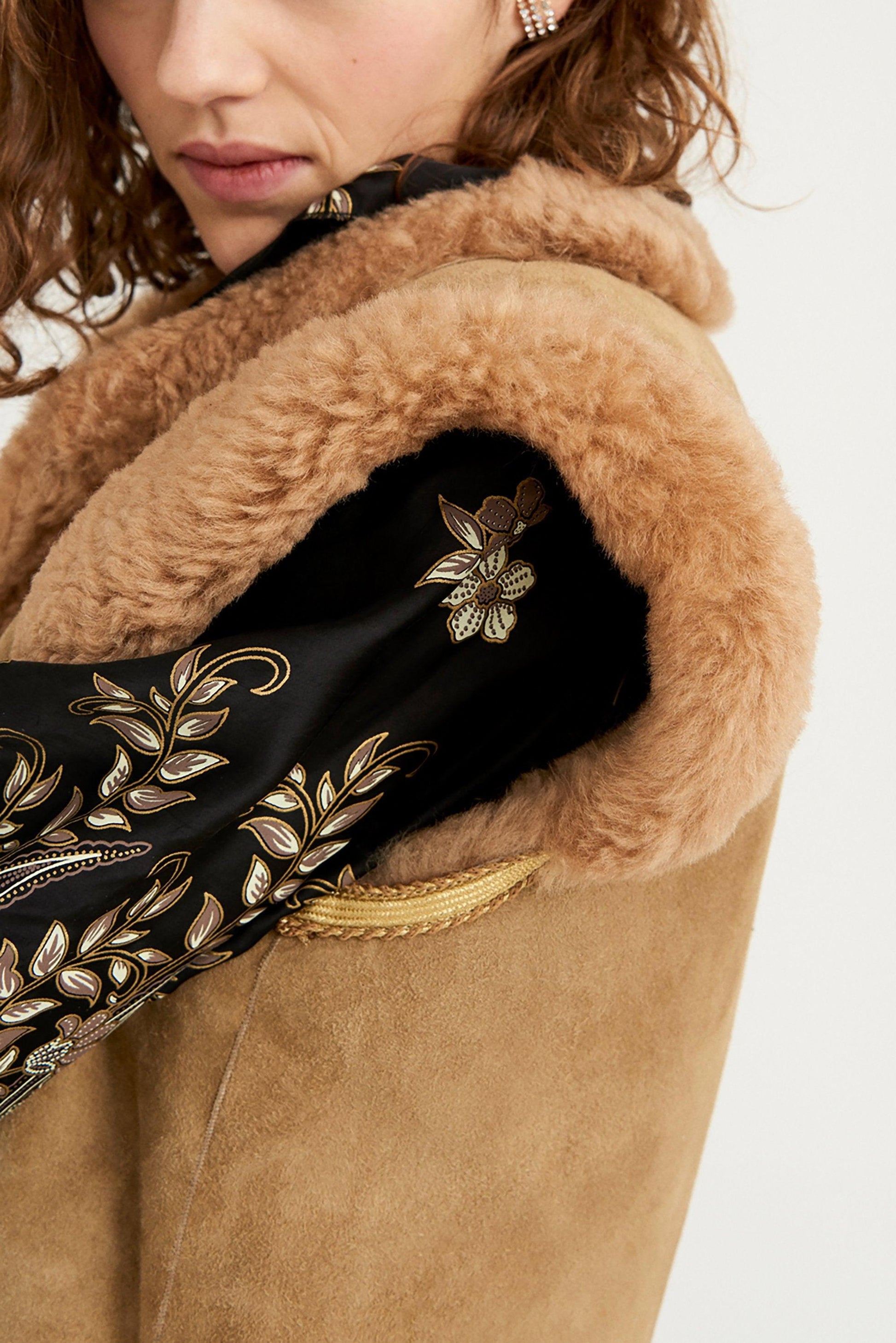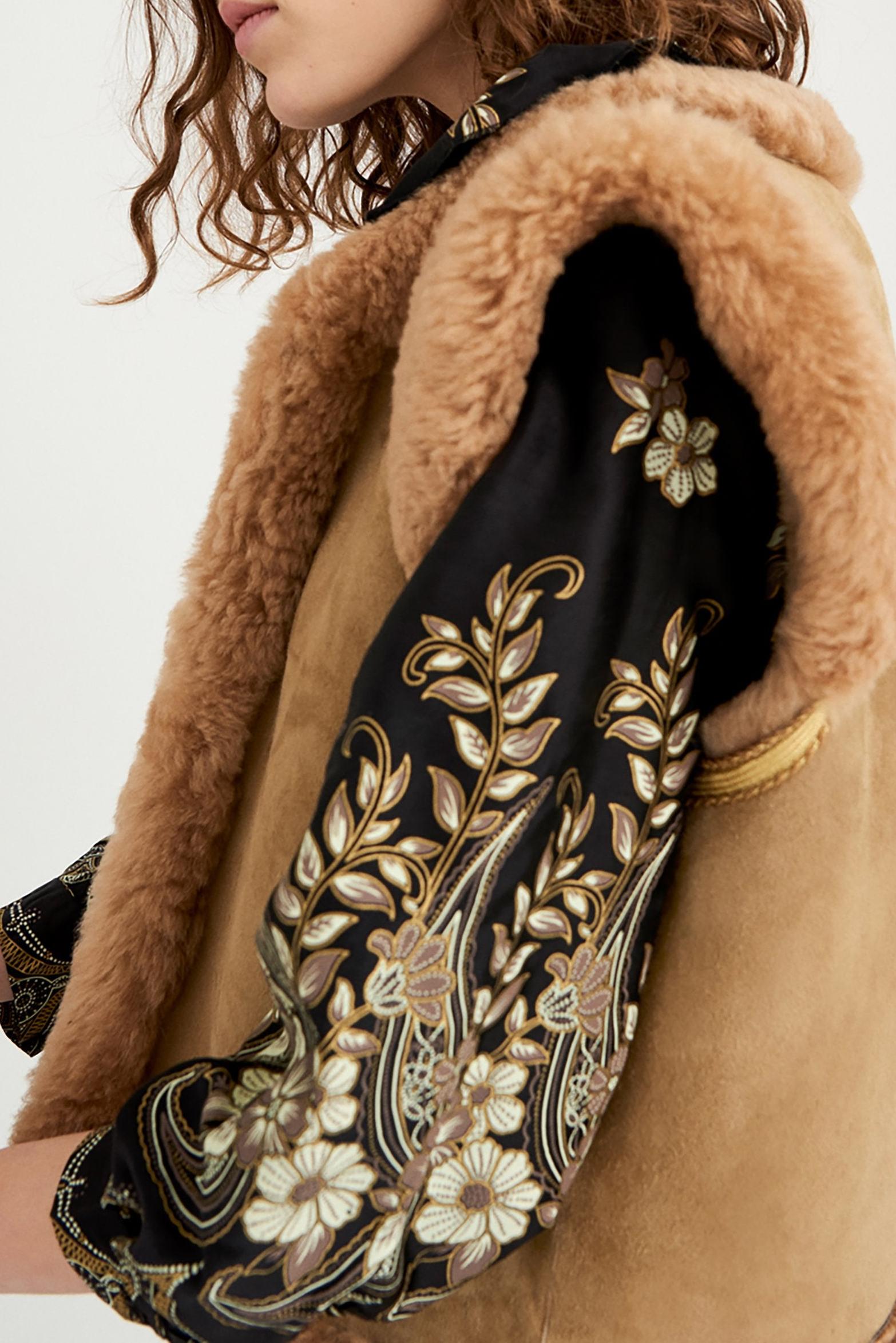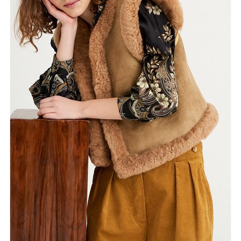Camel-coloured suede cardigan. Straight cut. Tone-on-tone fur trims. This 70s-inspired vest has forever been one of the brand's iconic pieces. If you don't know it by now...