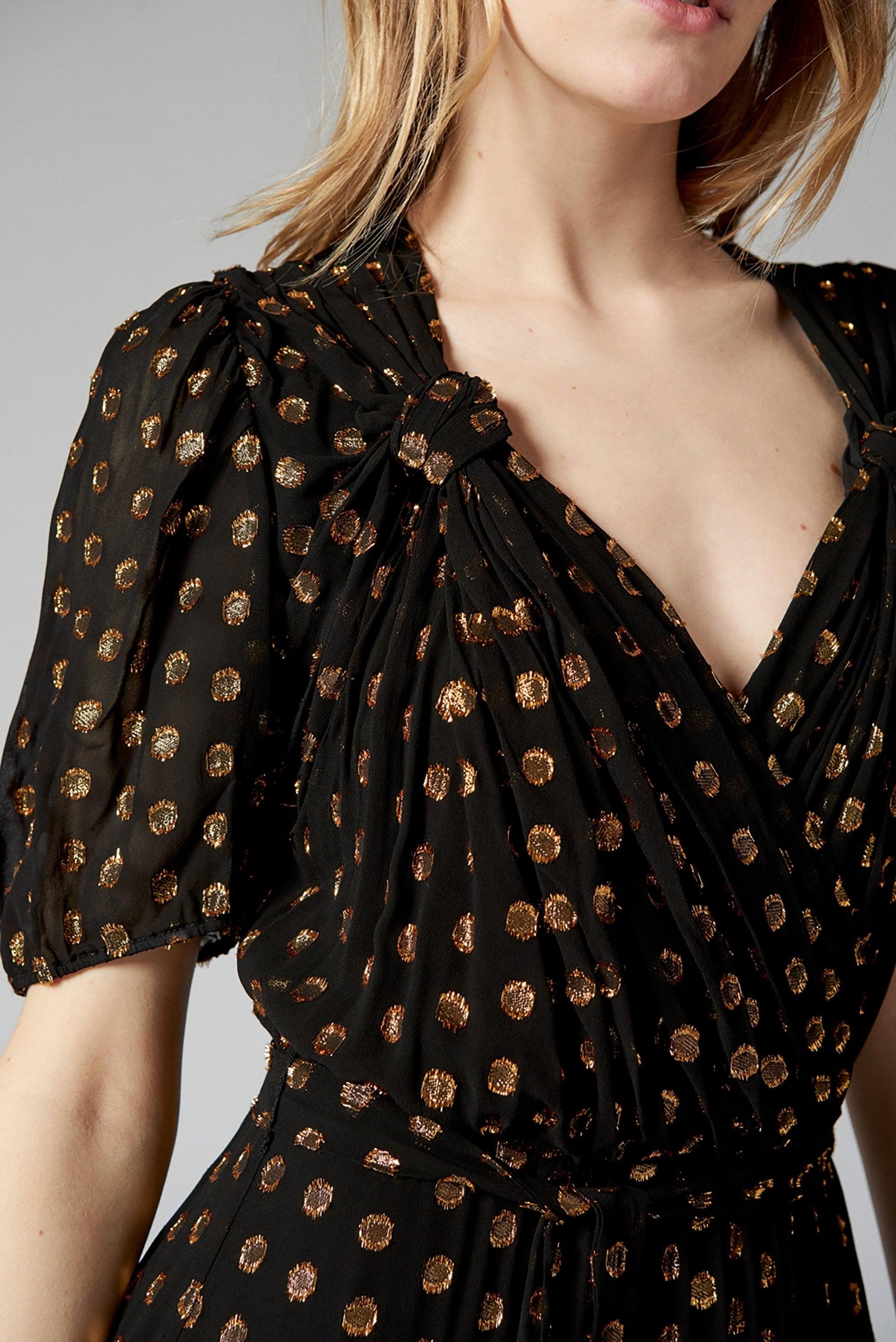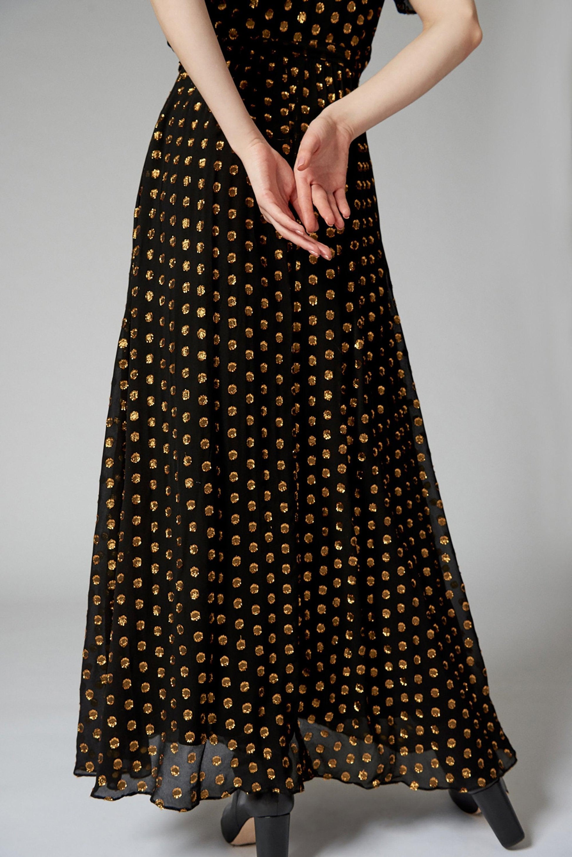 Black maxi dress in viscose. All-over golden lurex polka dots. Crossover neckline. Loose short sleeves. Comes with its own belt. This elegant long dress is sure to turn heads at all your events.